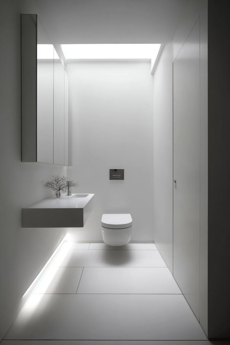 Skylight provides natural illumination that changes throughout the day, making light itself a primary design element. Hidden LED strip under the toilet creates a floating effect, dematerializing the already minimal fixture and adding the only artificial light source visible in the space. Architectural photography emphasizes the purity of form and absence of visual clutter, capturing how minimalism creates spaces of remarkable calm and clarity. The discipline required to achieve true minimalism—resisting decoration, concealing infrastructure, limiting materials—results in spaces that feel meditative and serene.
