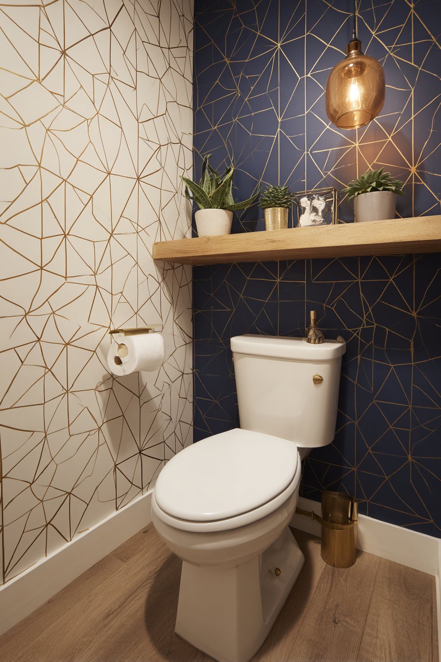 Brass flush lever and toilet paper holder add metallic accents that echo the gold in the wallpaper, creating visual connections that unify disparate elements. A small floating shelf in natural wood provides both practical storage and aesthetic balance, its organic warmth tempering the geometric precision of the wallpaper. Displaying succulents and decorative objects, the shelf becomes a curated vignette that reveals the inhabitant’s personality and interests. A pendant light with amber glass shade creates a warm glow that enhances the gold tones and adds another layer of visual interest to the ceiling plane.