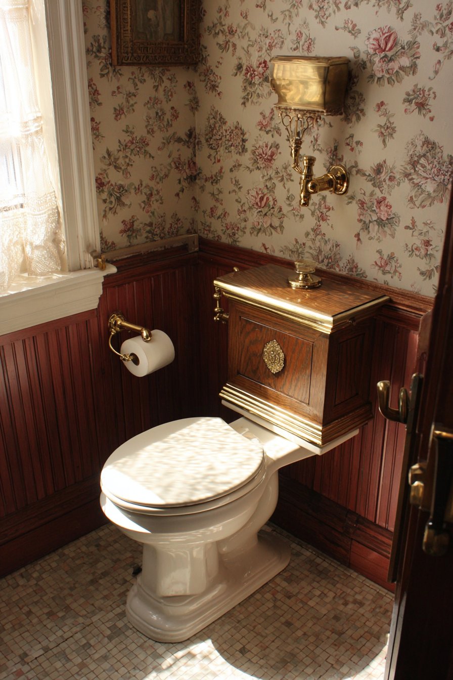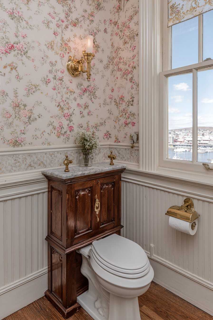 Delicate floral wallpaper above the wainscoting adds pattern, color, and Victorian romanticism, transforming functional walls into decorative surfaces that delight the eye. The antique brass toilet paper holder and period-appropriate light fixture complete the historical ensemble, ensuring that every visible element reinforces the temporal journey the design creates. Natural window light enhances the nostalgic charm, its quality and angle changing throughout the day in ways that artificial lighting cannot replicate, connecting the interior space to natural cycles and rhythms.