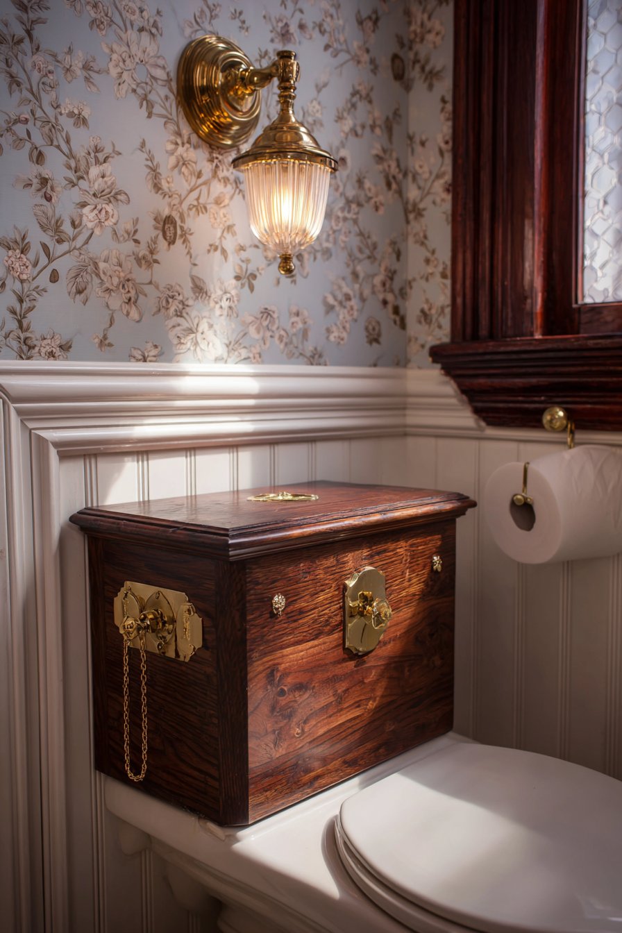 - Source authentic high-tank toilets or quality reproductions for period accuracy