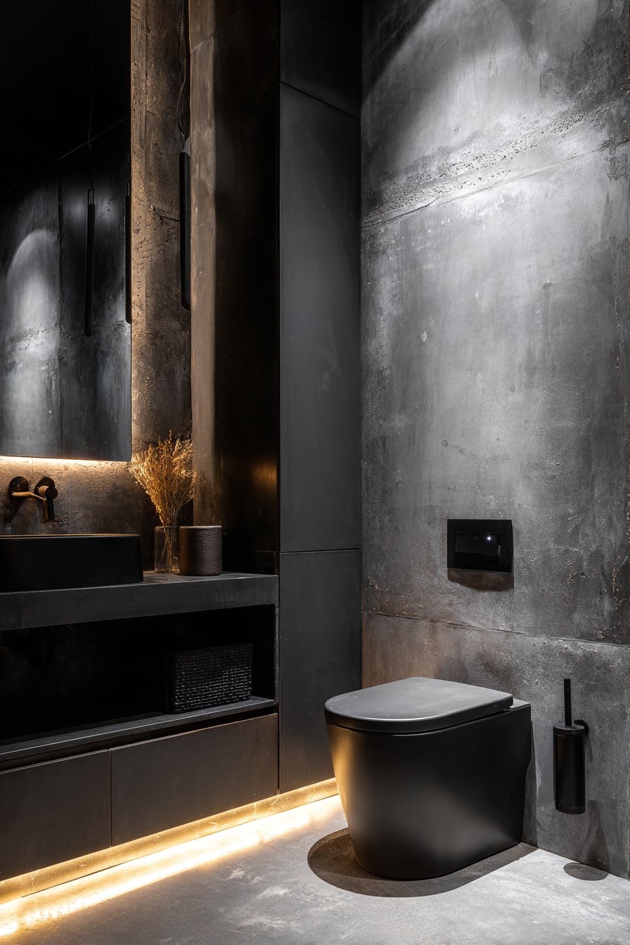 The matte black fixtures throughout the space complement the modern aesthetic while creating dramatic visual contrast against the concrete surfaces. This careful attention to finish coordination demonstrates how even in highly technological spaces, design aesthetics remain paramount. Ambient LED strip lighting along the toilet base creates a floating effect that adds drama while serving the practical purpose of nighttime navigation lighting. This subtle illumination transforms the fixture into a sculptural element, highlighting its modern form and advanced features.