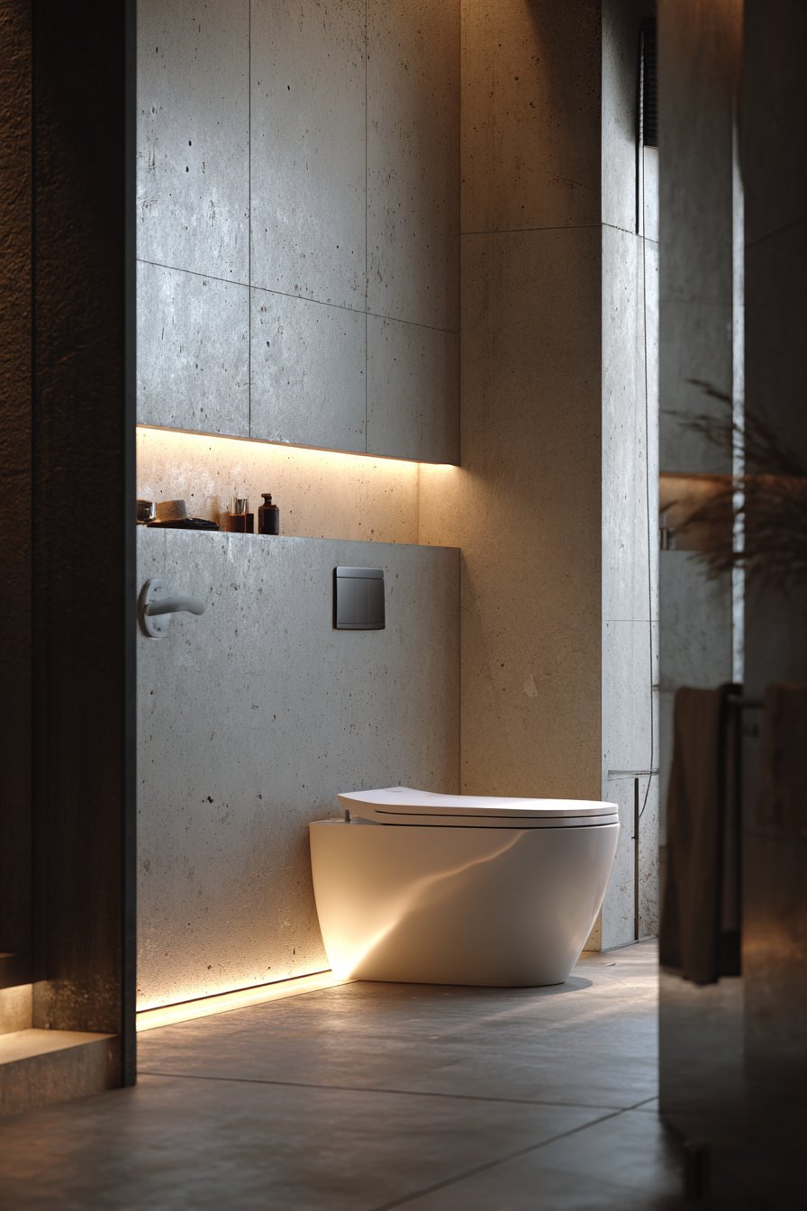 Architectural photography with balanced exposure captures the interplay between raw industrial materials and refined technological sophistication. The juxtaposition of concrete’s rough, organic texture with the smooth, precise surfaces of modern fixtures creates visual tension that makes the space memorable and distinctive. This design approach appeals to those who appreciate innovation and aren’t afraid to invest in features that genuinely improve daily life, proving that technology and design excellence can coexist beautifully.