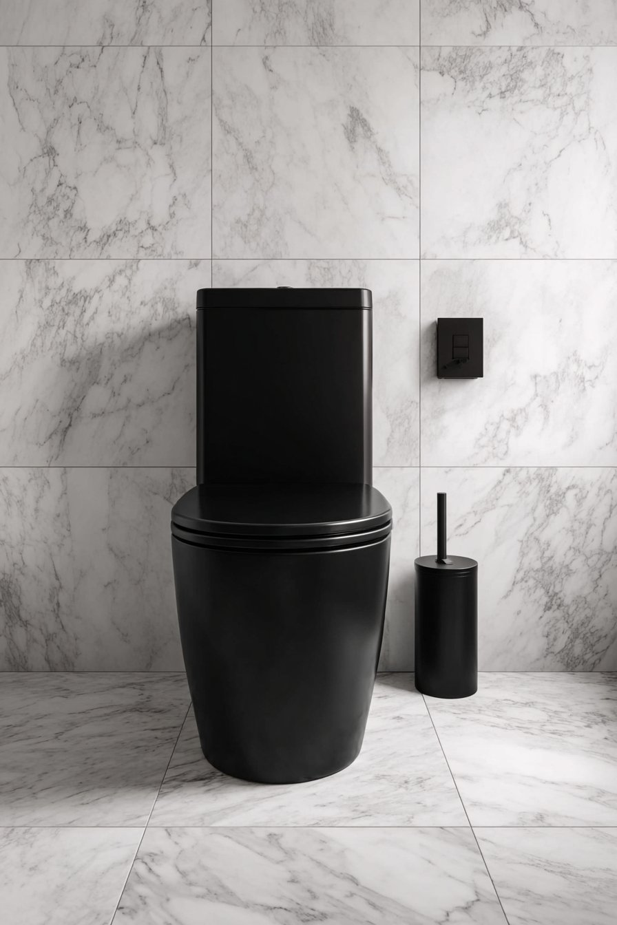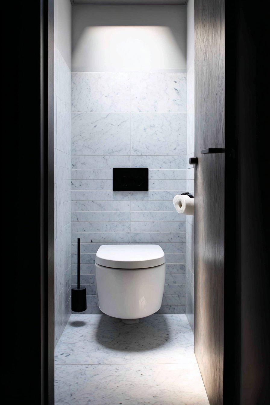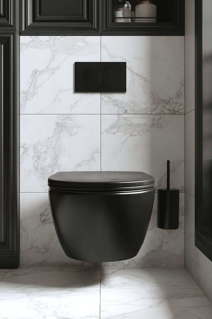 The black and white toilet design makes a striking statement through bold color contrast and sophisticated material choices. A matte black wall-hung toilet anchors the space, its dark finish creating dramatic impact against pristine white marble tiles with subtle grey veining. This high-contrast approach requires confidence and careful execution, but when done well, it creates spaces with undeniable personality and visual power. The black flush plate and toilet paper holder create a cohesive look, ensuring that every visible element contributes to the overall design concept.