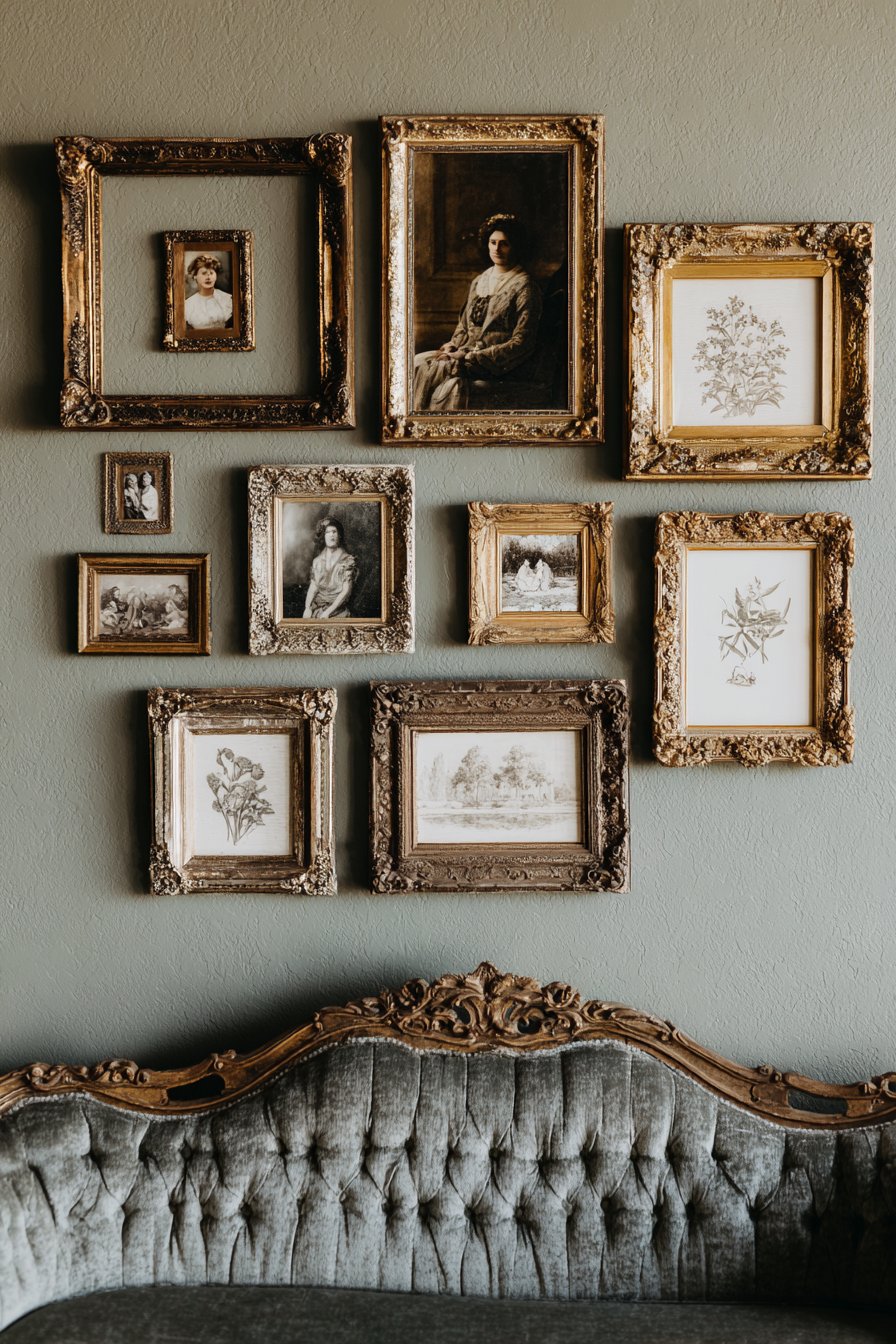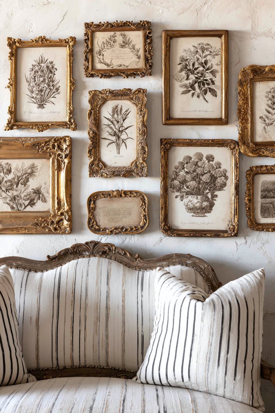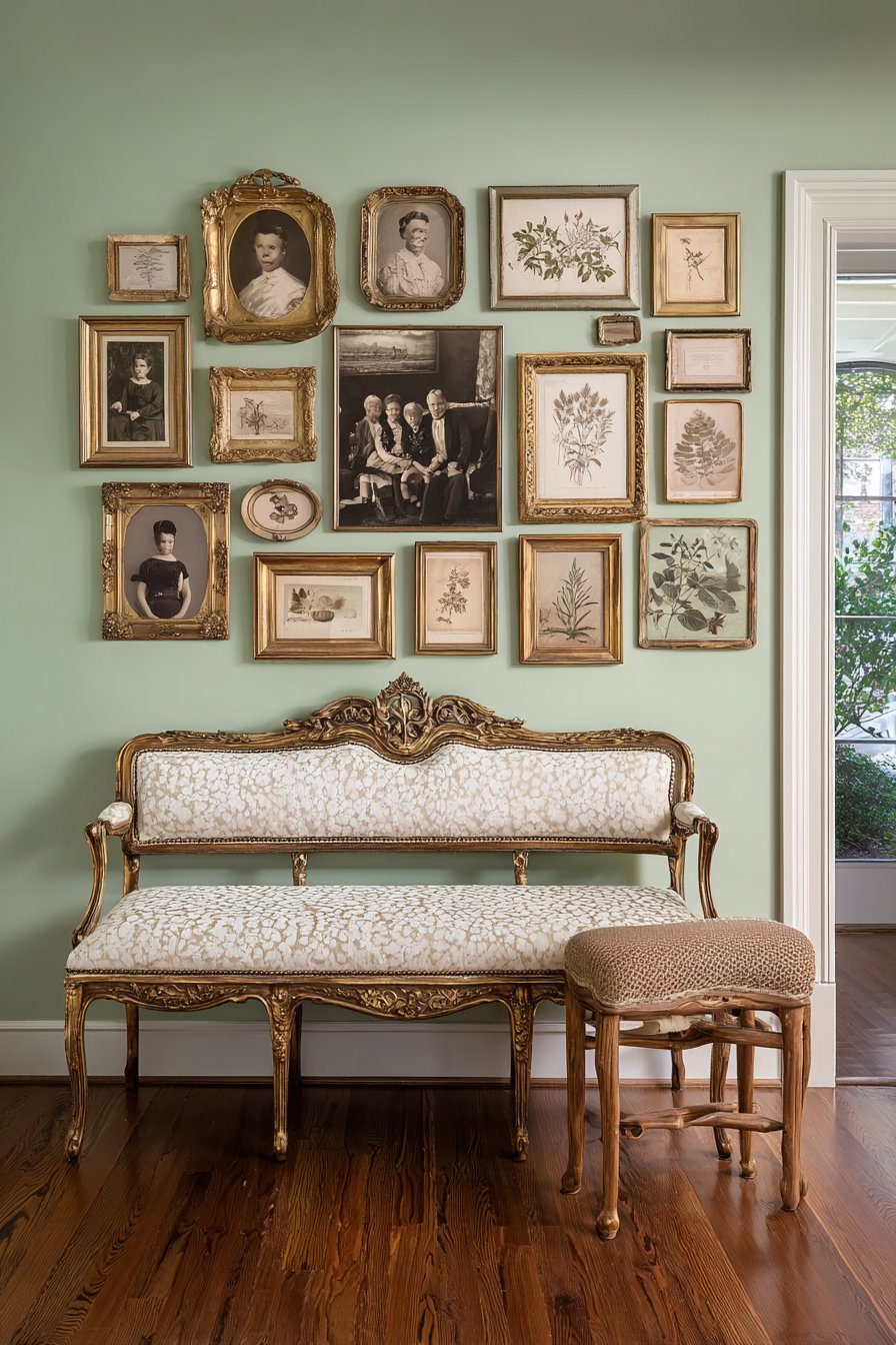 Step into a room where an asymmetrical arrangement of ornate gilded frames creates a stunning focal point against a soft sage green wall. This vintage gallery wall exemplifies the salon-style hanging tradition, where frames of varying sizes are arranged in an organic, balanced composition that feels both intentional and effortlessly collected over time. The sepia-toned family portraits and botanical prints within the frames add layers of historical intrigue, while the authentic patina on the gold frames speaks to generations of careful preservation.
