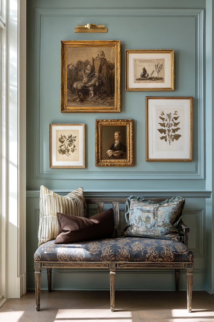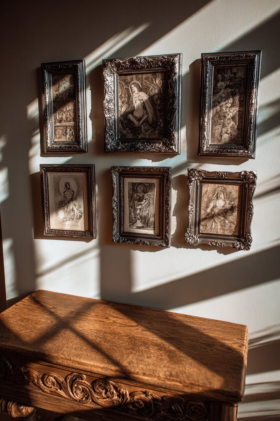 Soft diffused lighting from a nearby window creates an even glow across the carefully balanced composition, eliminating harsh shadows that might disrupt the serene symmetry. This type of natural, indirect lighting is ideal for vintage gallery walls as it prevents fading of delicate antique prints while showcasing the frames’ ornate details without creating glare on protective glass surfaces.