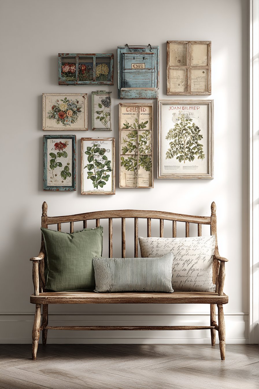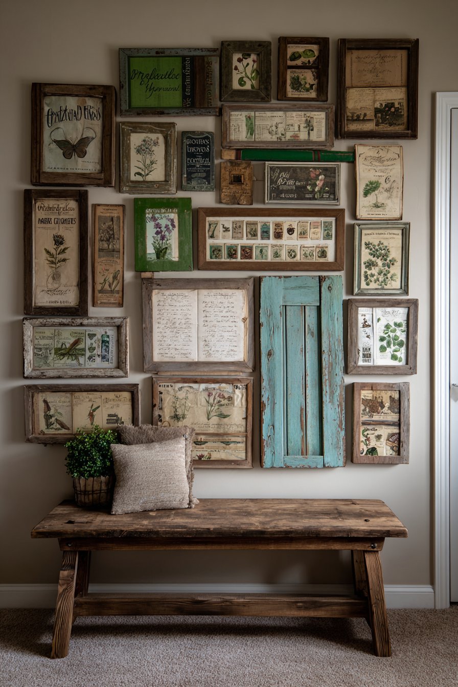 Arranged above a farmhouse-style wooden bench with simple turned legs, this gallery wall embodies the unpretentious elegance that makes farmhouse style so enduringly popular. The bench’s honest construction and visible wood grain complement the frames’ rustic finishes, while providing functional seating in entryways, bedrooms, or dining spaces. Soft natural lighting emphasizes the subtle color variations and weathered textures, revealing the history embedded in every paint chip and surface imperfection.