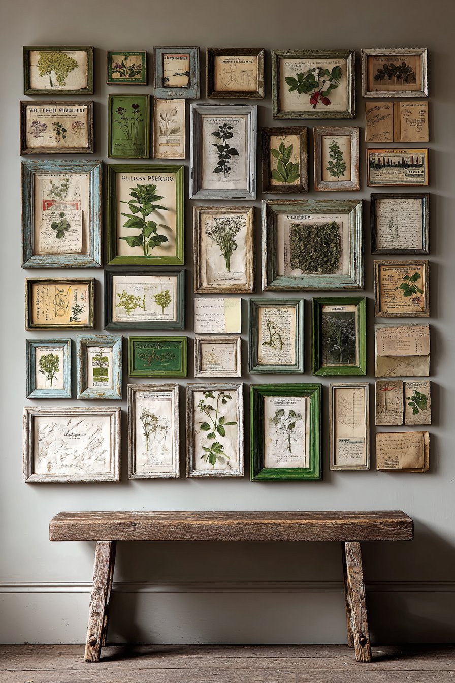 Mismatched antique wooden frames with original paint in faded blues, greens, and creams create a vintage gallery wall celebration of farmhouse and cottage aesthetics. The authentic chippy distressing—where paint naturally flakes away to reveal layers of color and raw wood beneath—provides textural interest that cannot be convincingly replicated through artificial aging techniques. The collection displays vintage seed packets, antique advertising prints, botanical watercolors, and aged handwritten letters, creating a rustic yet refined composition.