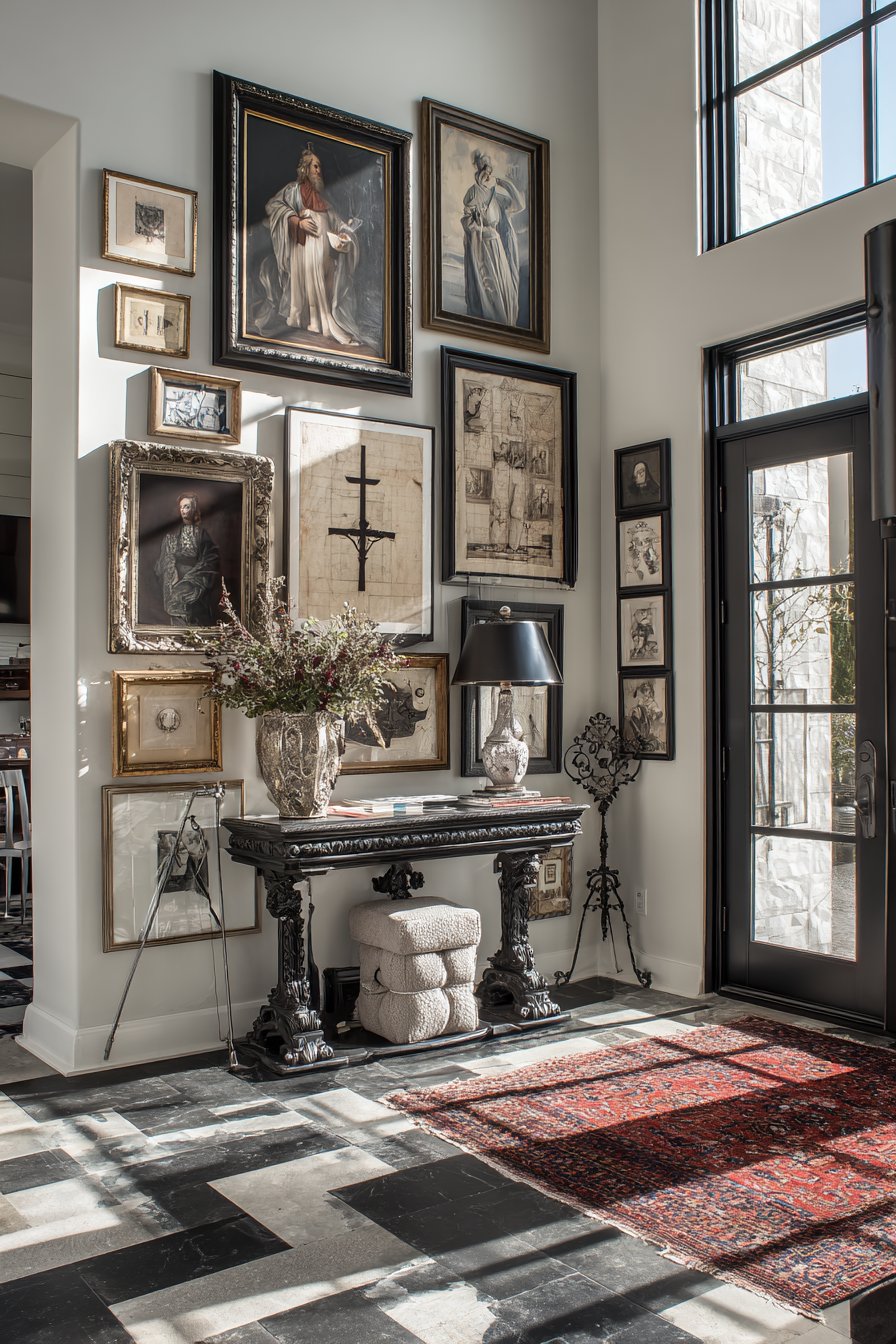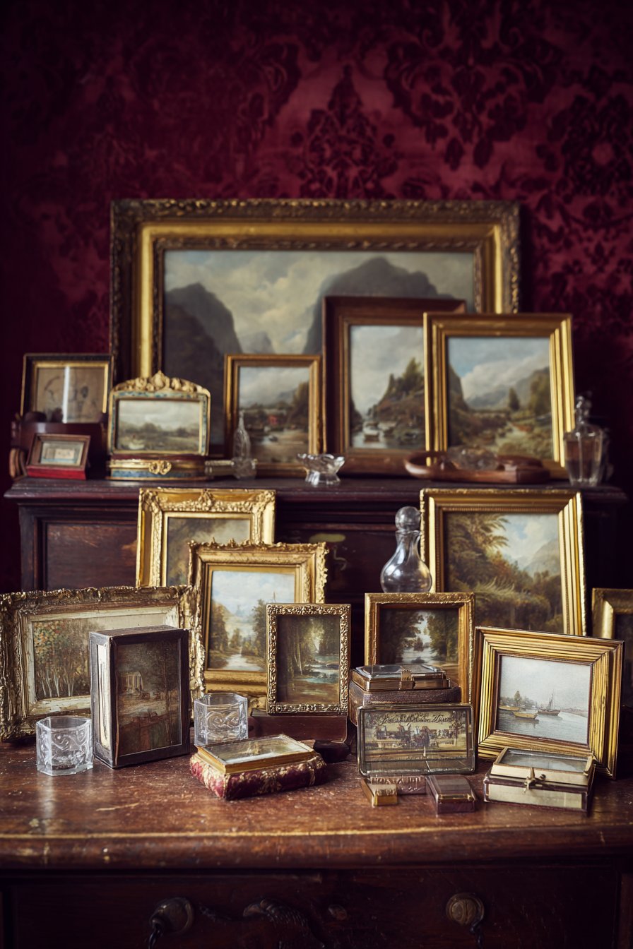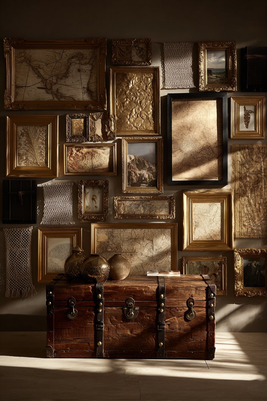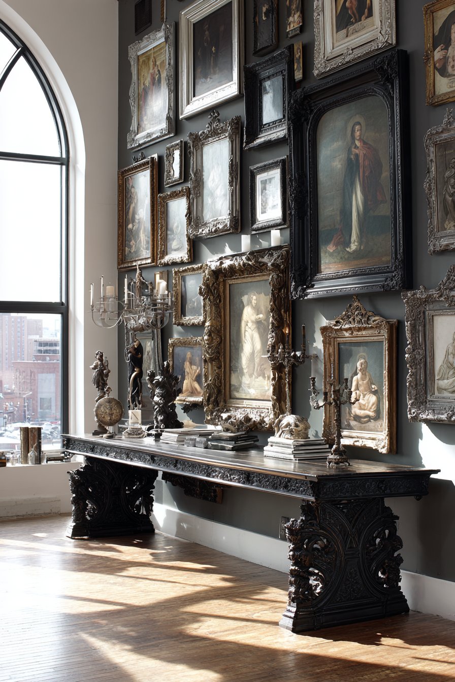 Professional interior photography techniques with soft gallery lighting emphasize the museum-quality presentation and rich textures of aged materials. The lighting strategy here is crucial—too bright and the arrangement feels harsh and institutional; too dim and the intricate frame carvings and artwork details disappear. The ideal approach uses layered lighting with ambient illumination supplemented by focused accent lights on key pieces.