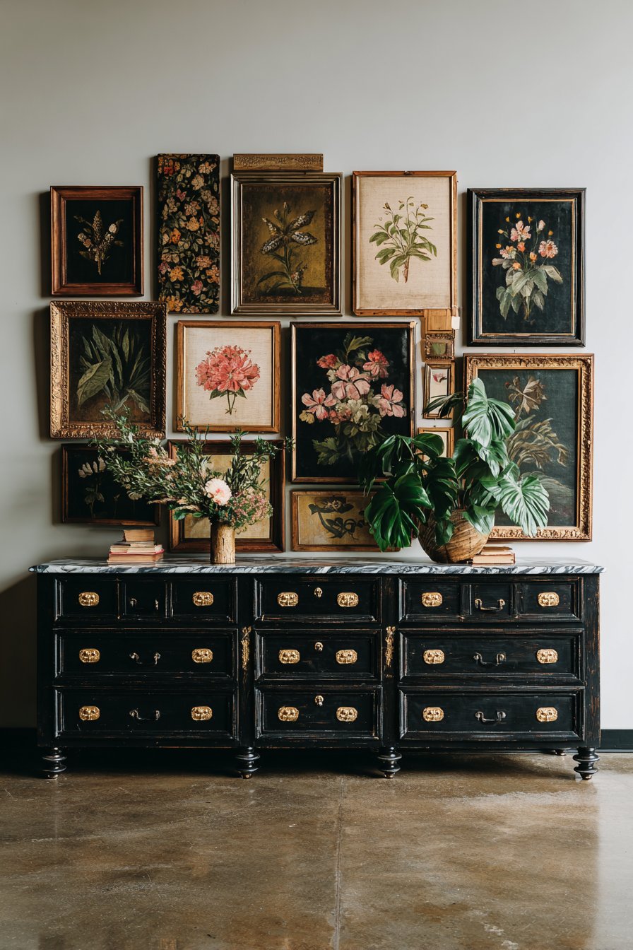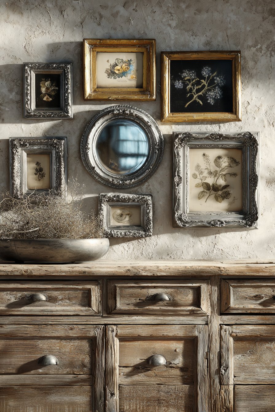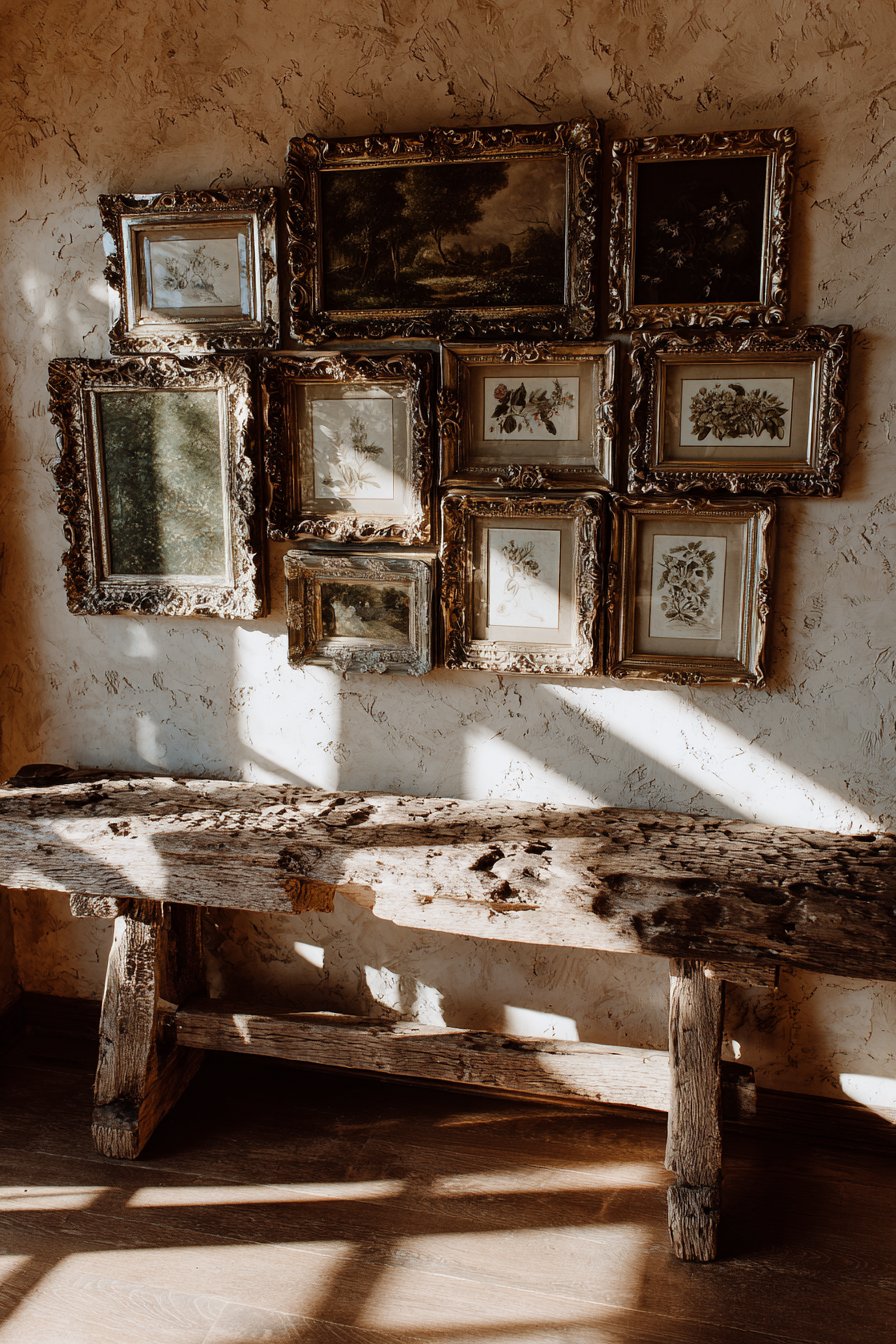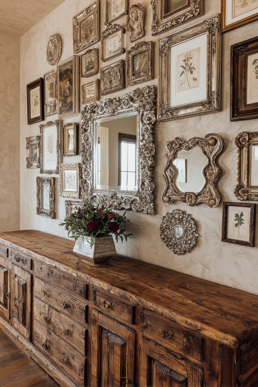 Positioned above a rustic wooden console table with authentic wear patterns, this gallery wall creates a fascinating juxtaposition between formal Victorian elegance and casual rustic charm. The console table’s weathered surface and visible grain patterns ground the ornate frames above, preventing the arrangement from feeling too precious or museum-like. This combination demonstrates how vintage elements from different periods and styles can coexist beautifully when united by common threads of authenticity and age.