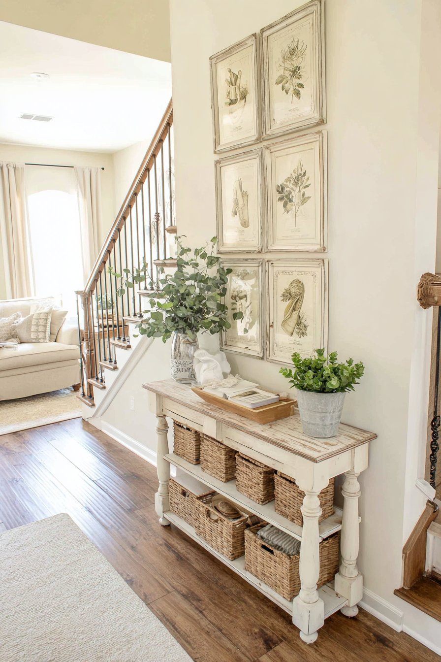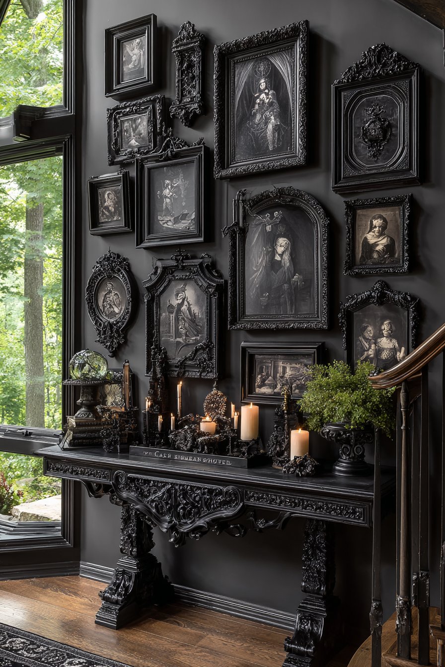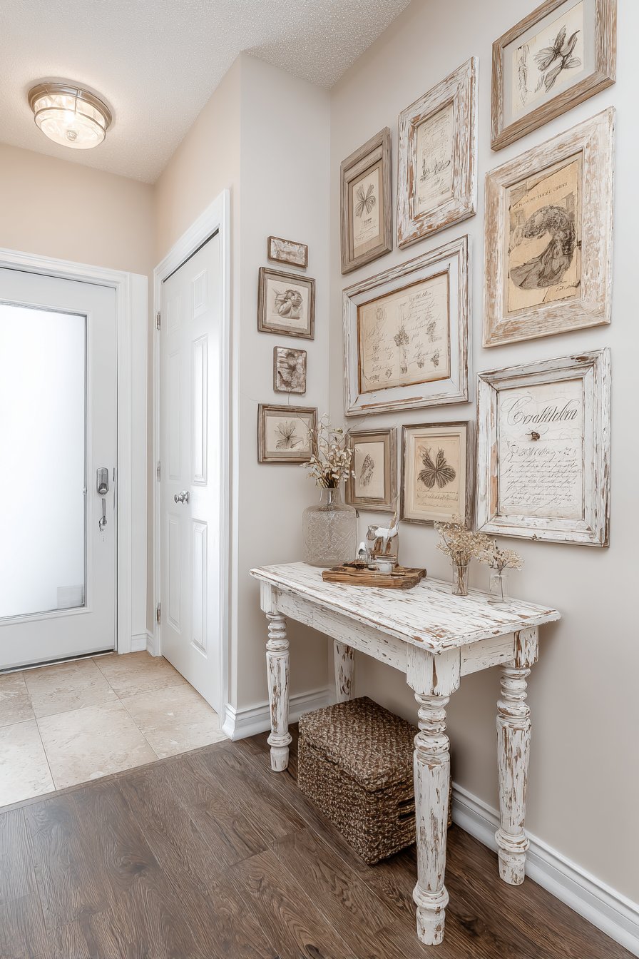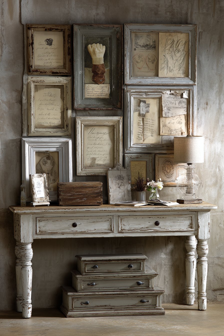 Positioned above a rustic wooden console table with authentic wear patterns, this gallery wall creates a fascinating juxtaposition between formal Victorian elegance and casual rustic charm. The console table’s weathered surface and visible grain patterns ground the ornate frames above, preventing the arrangement from feeling too precious or museum-like. This combination demonstrates how vintage elements from different periods and styles can coexist beautifully when united by common threads of authenticity and age.