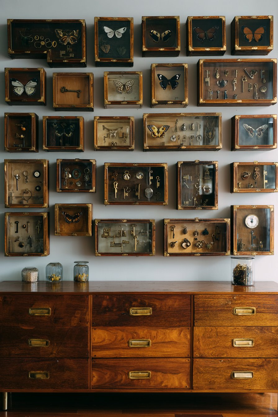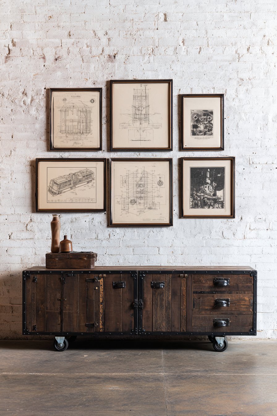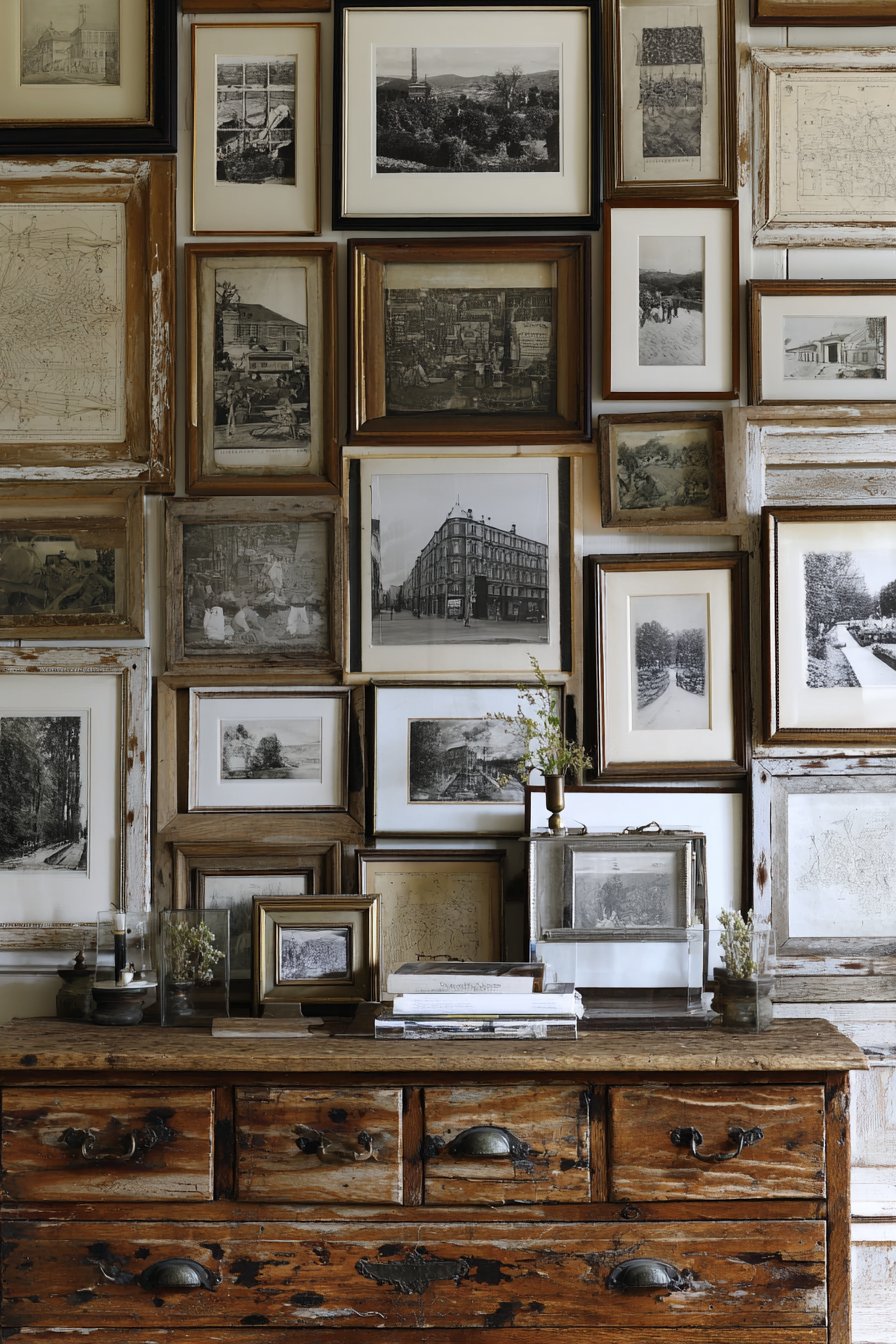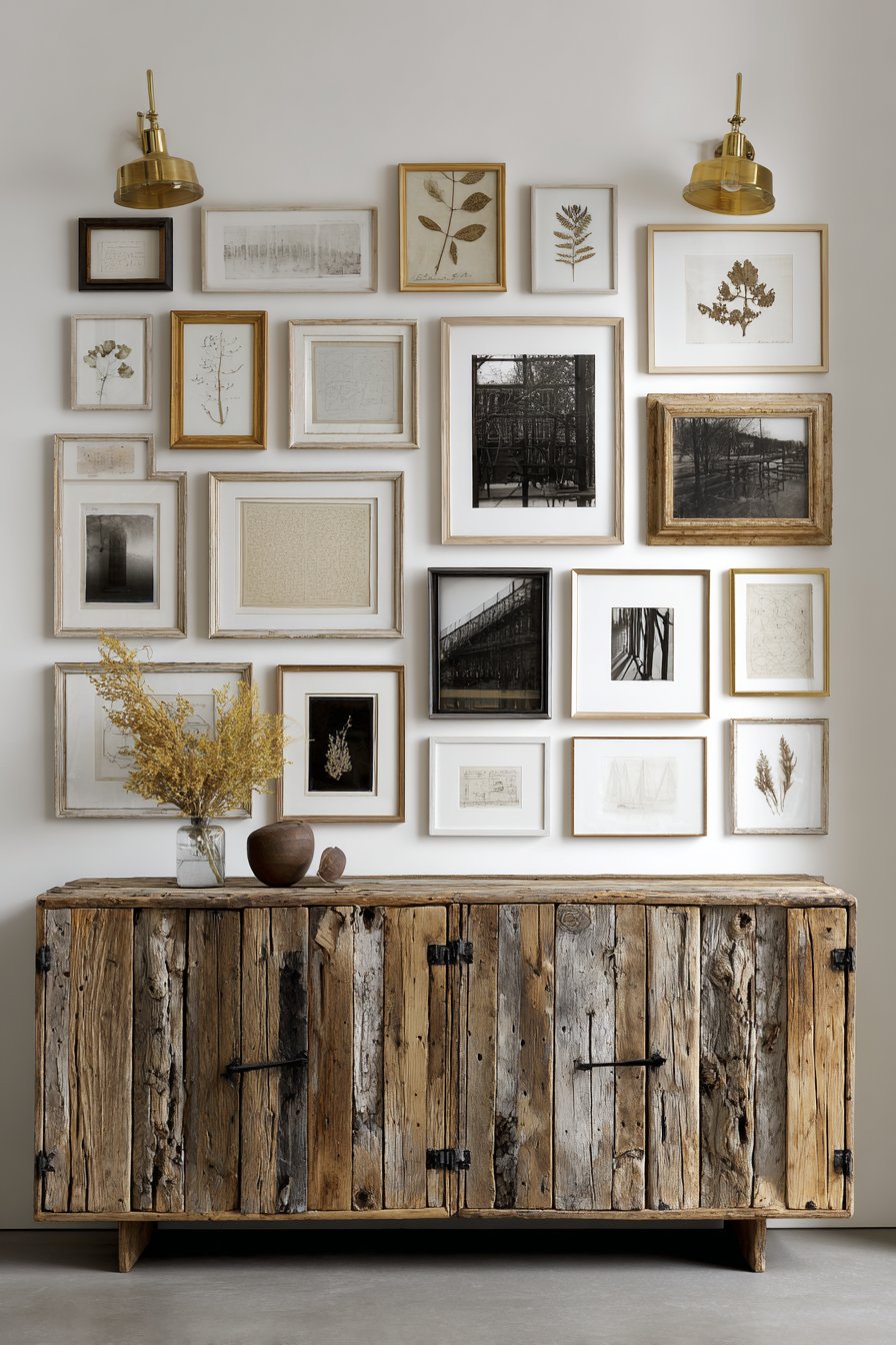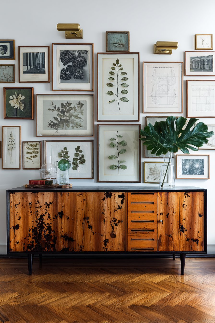 This approach to vintage gallery walls works particularly well in spaces with modern or contemporary furnishings, as demonstrated by the mid-century credenza below. The contrast between sleek modern lines and rustic vintage frames creates visual tension that keeps the eye engaged and prevents the space from feeling too matchy or contrived. The eclectic mix of frame styles and finishes prevents the arrangement from appearing too formal or precious.