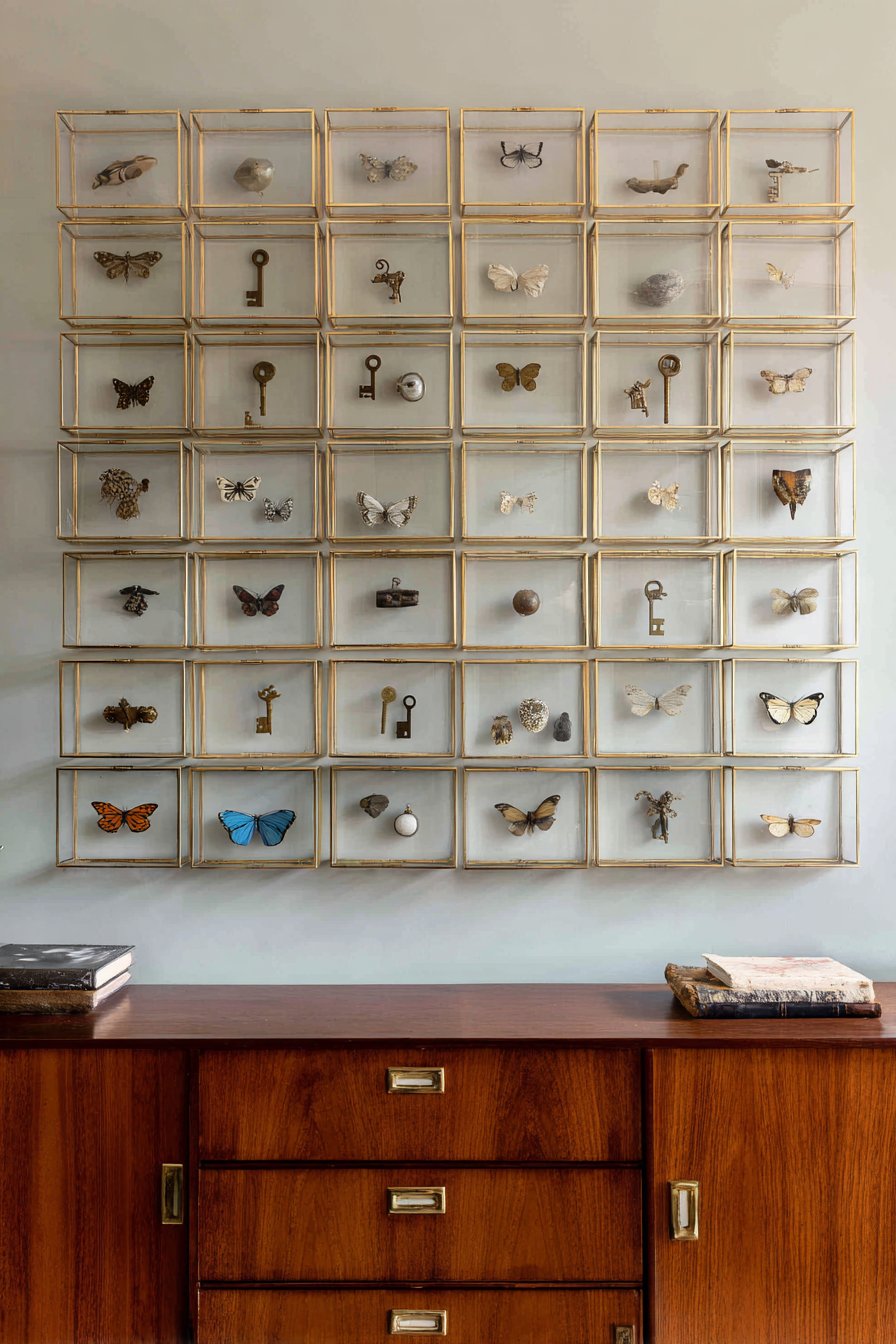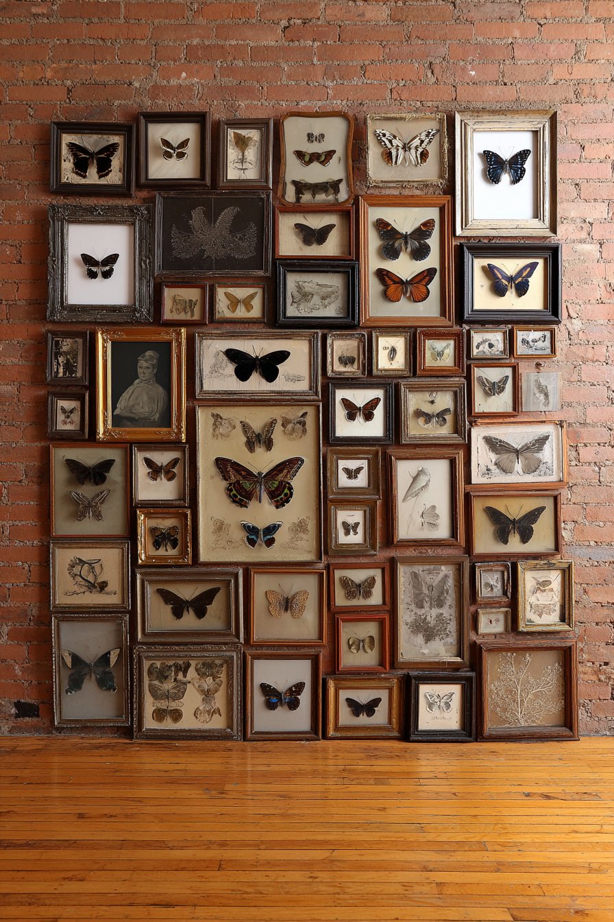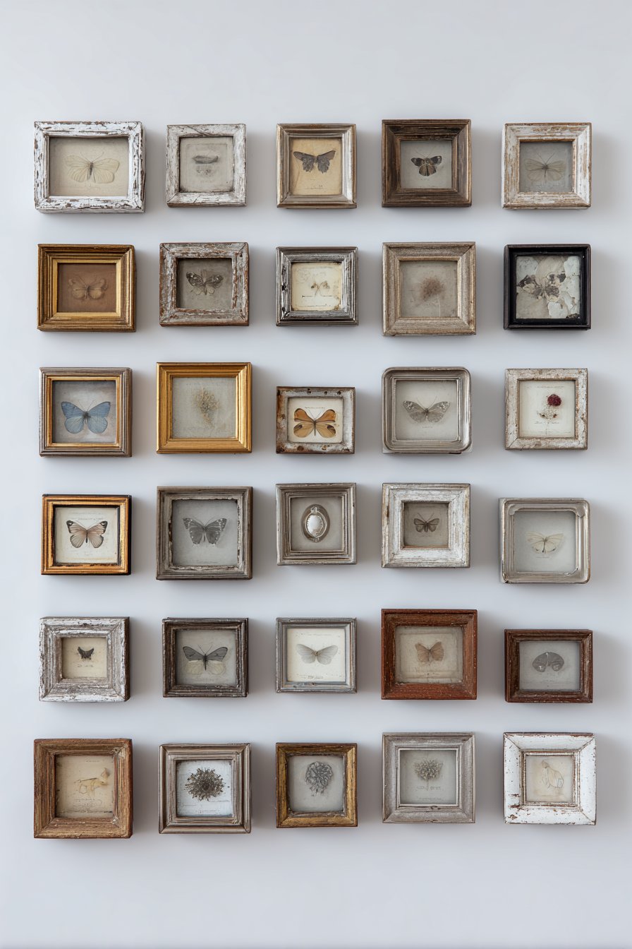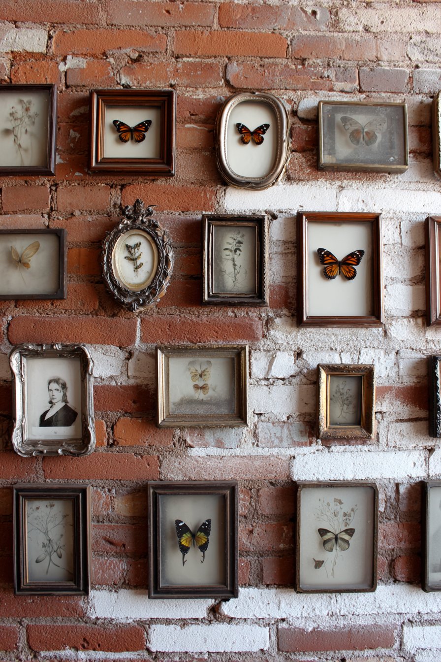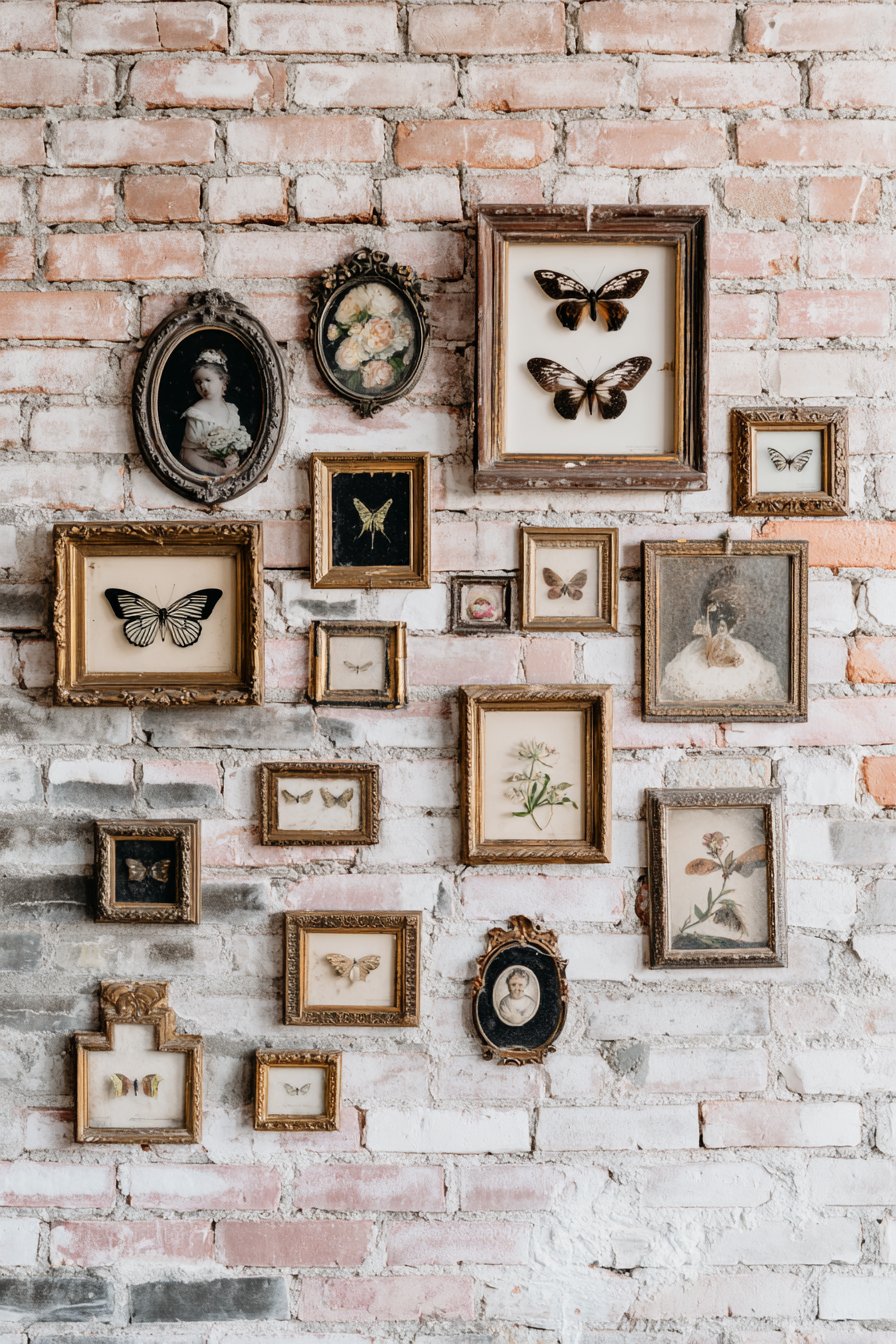 An eclectic grid arrangement of small to medium antique frames in mixed metals—tarnished silver, aged copper, and oxidized brass—creates a vintage gallery wall that resembles a cabinet of curiosities. The frames contain vintage butterfly specimens, pressed flowers under glass, antique cameos, and miniature portraits, each piece representing a tiny world of historical intrigue and natural beauty. Set against exposed brick painted in soft white, this arrangement balances the delicate scale of the framed objects with the rough, textured backdrop.