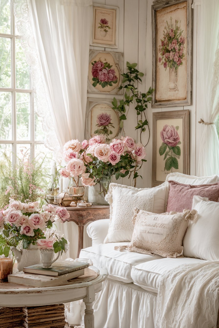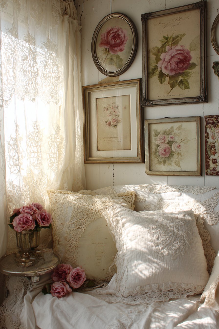 Natural morning light filtering through lace curtains creates delicate patterns on the cream-colored wall, adding another layer of vintage charm to the space. This type of soft, filtered natural light is ideal for reading while also protecting delicate antique papers from harmful UV rays. The intimate scale of this arrangement—designed to be appreciated from a seated position rather than across a large room—allows for the inclusion of smaller, more detailed pieces that reward close examination.