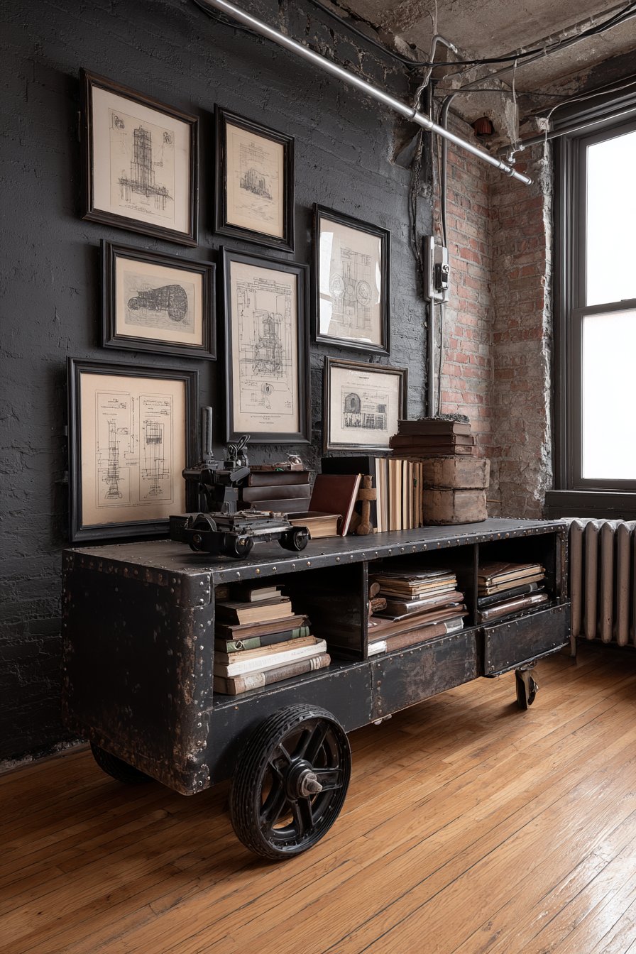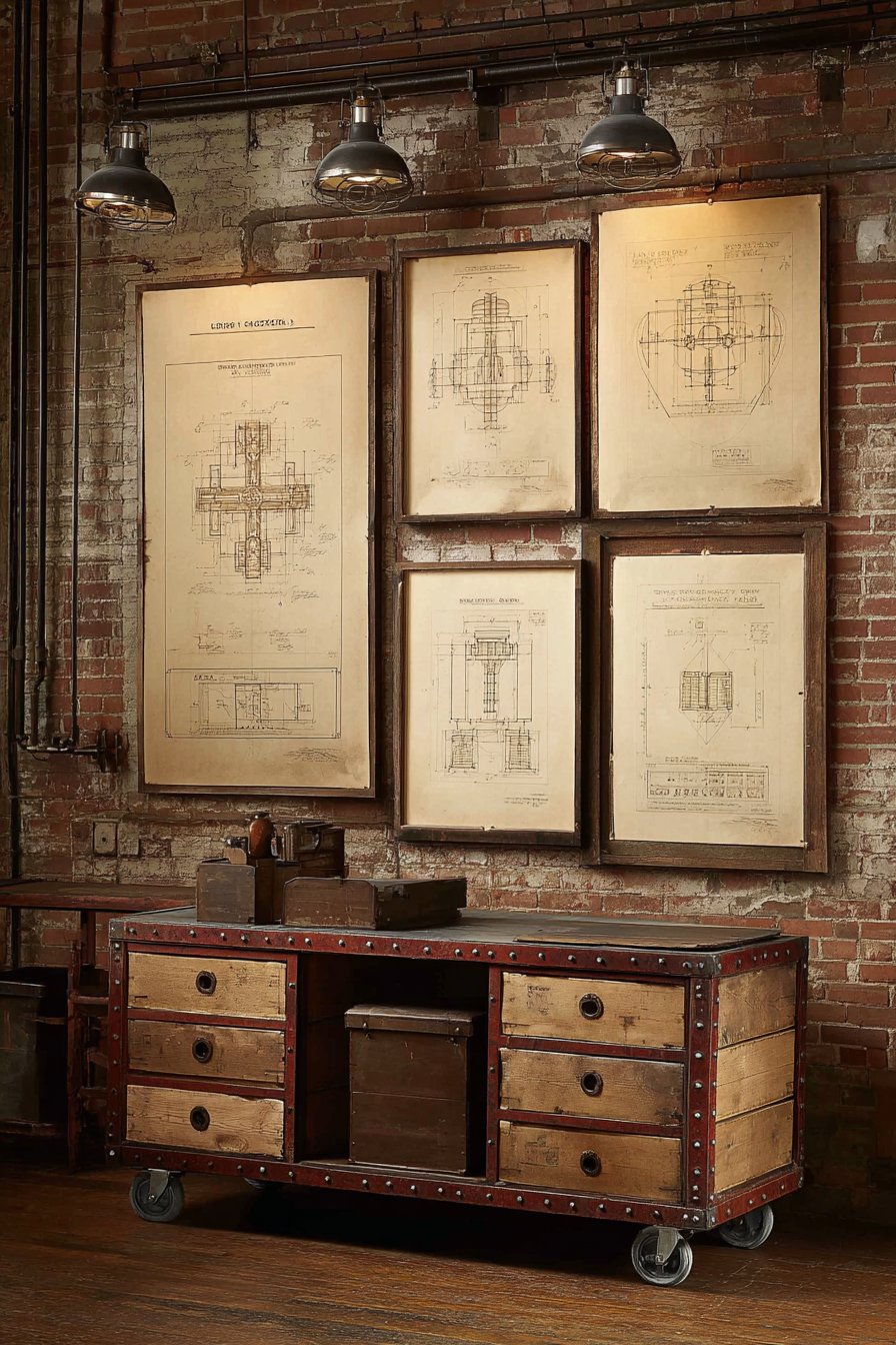 Industrial-style antique frames with metal corners and visible rivets in oxidized bronze and weathered steel create a vintage gallery wall with masculine, utilitarian character. The collection includes vintage factory blueprints, antique tool diagrams, aged patent drawings, and sepia workshop photographs—imagery that celebrates craft, engineering, and the industrial heritage of American manufacturing. Arranged above a reclaimed factory cart repurposed as a media console, this display brings authentic industrial vintage character to loft apartments, home offices, or workshops.