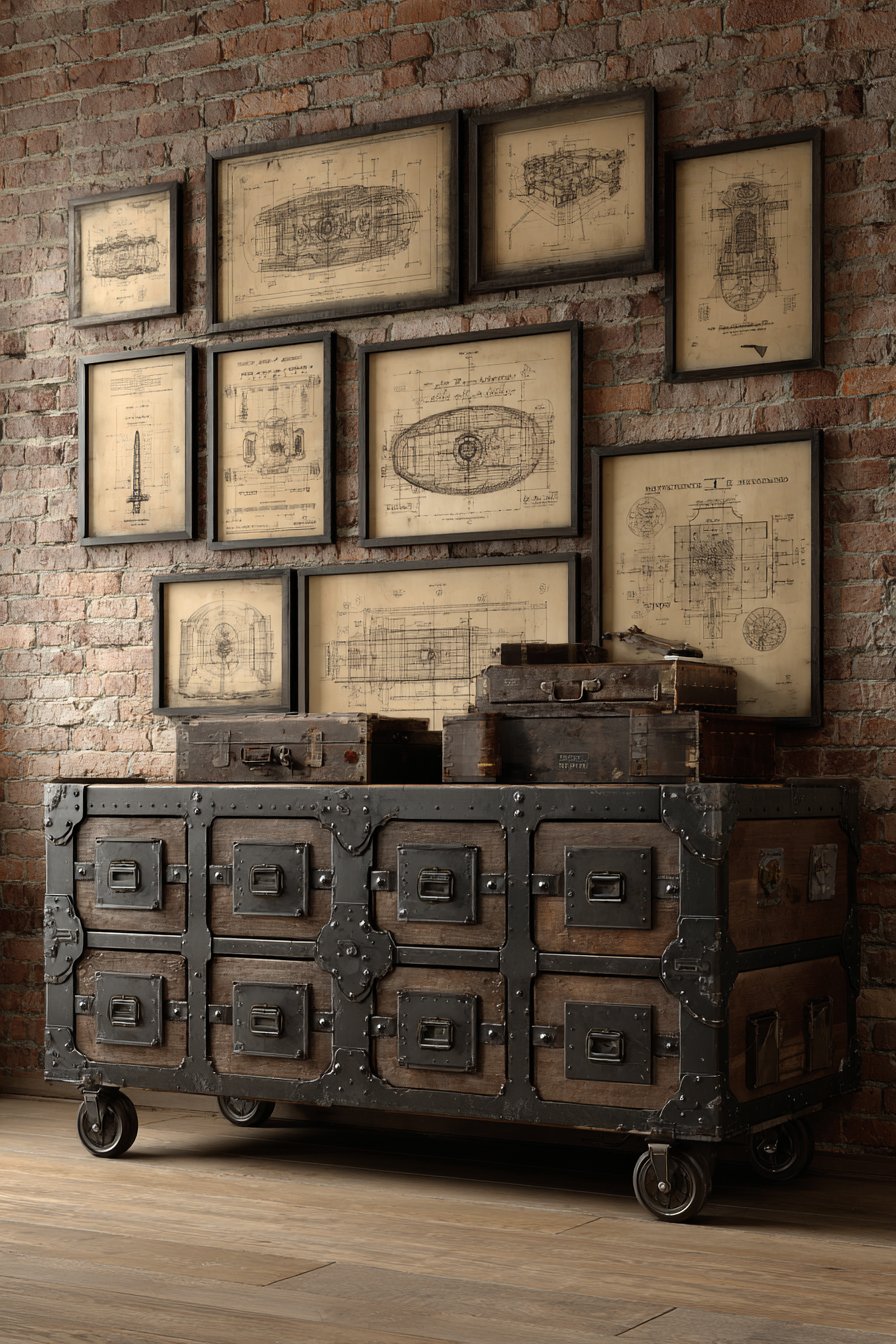 The metal frame construction and visible hardware celebrate honest materials and straightforward construction rather than ornamental decoration. Rivets, corner brackets, and metal edges become design features rather than structural necessities hidden beneath gilding or paint. This material honesty reflects core industrial design principles and creates visual coherence with the technical drawings and factory imagery within the frames.