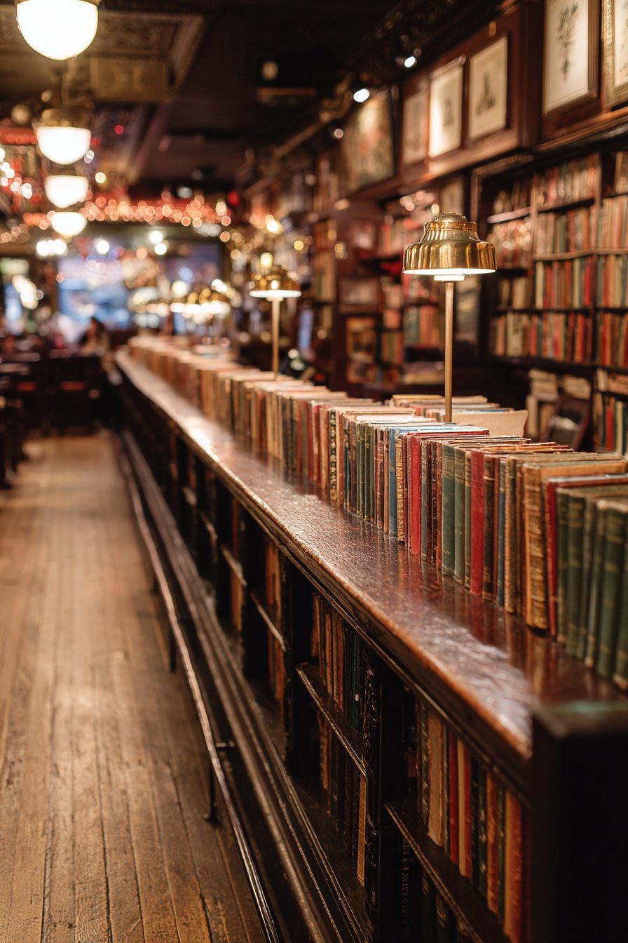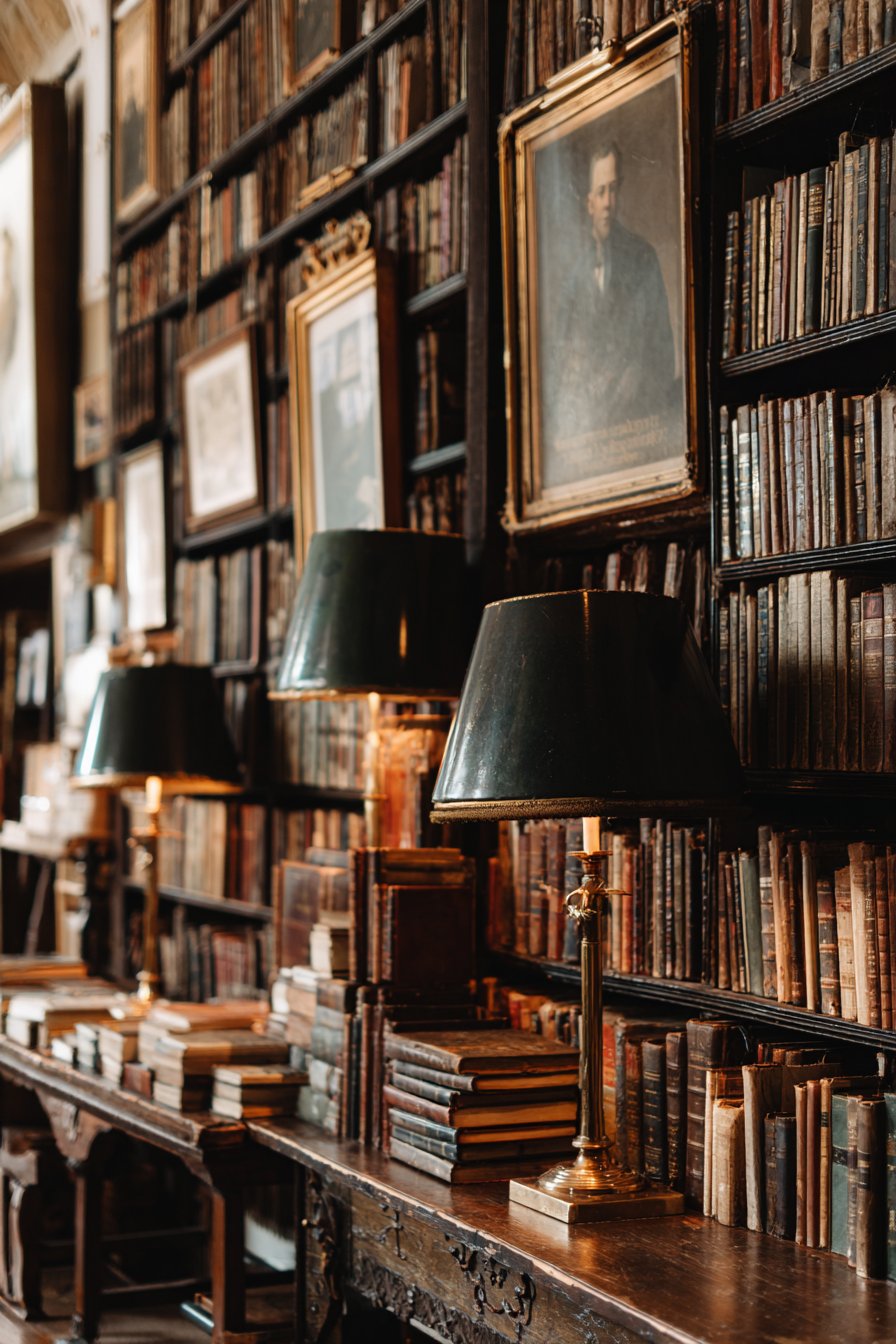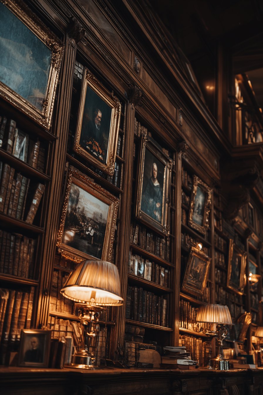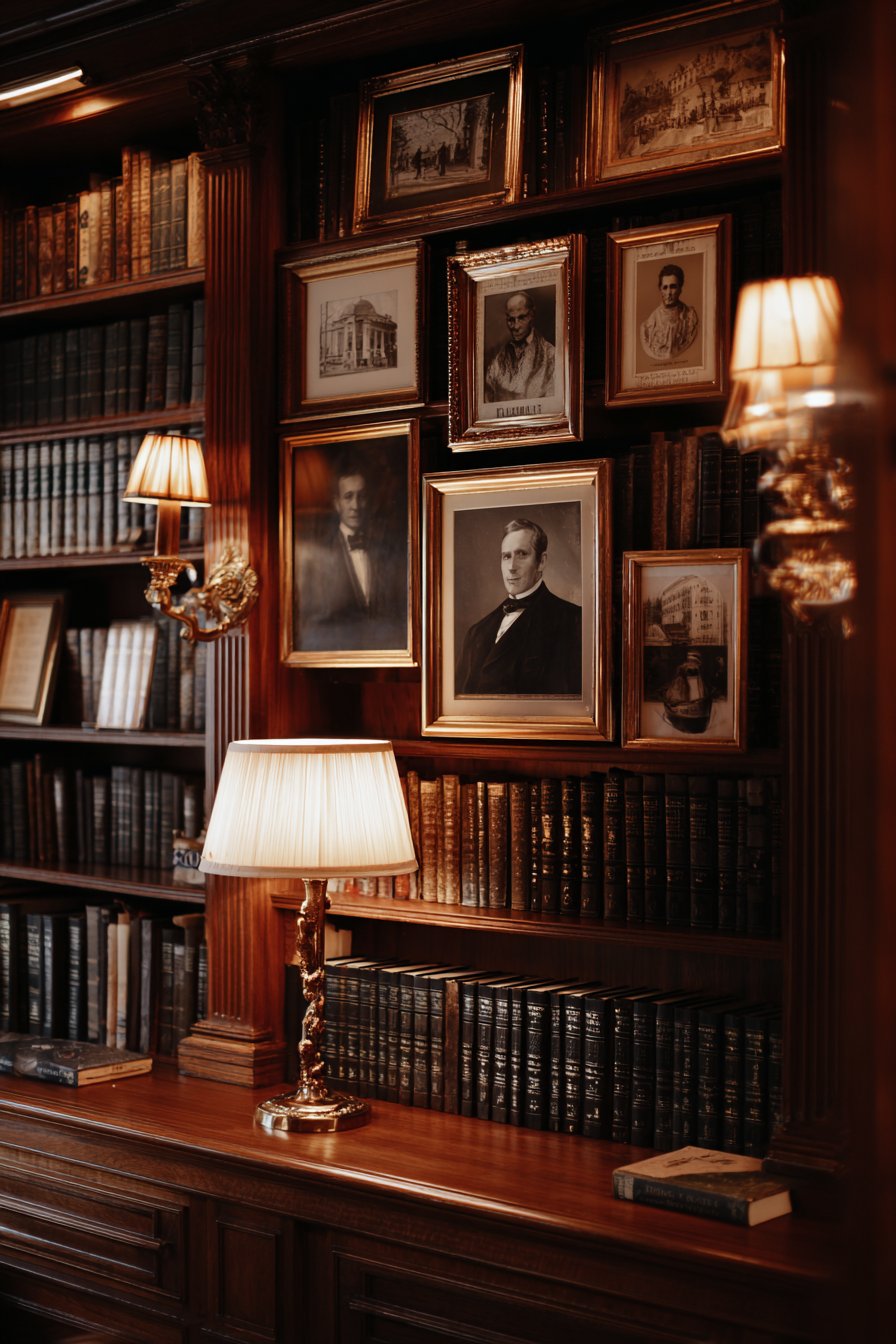 The warm ambient lighting from brass picture lamps creates an intimate scholarly atmosphere while highlighting the rich wood tones and literary vintage theme. These adjustable lamps—often found in traditional libraries and reading rooms—provide focused illumination ideal for viewing artwork while contributing to the overall ambiance. The warm glow of brass fixtures complements the golden accents in the frames and enhances the mahogany and walnut wood tones.