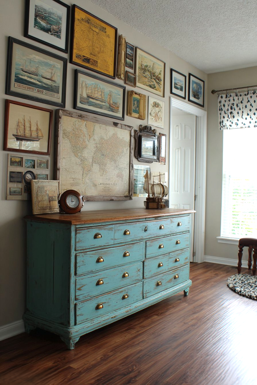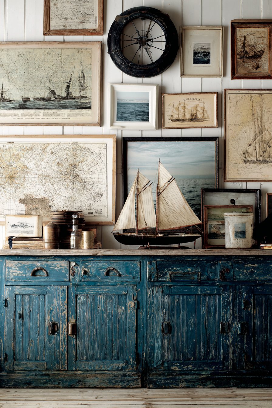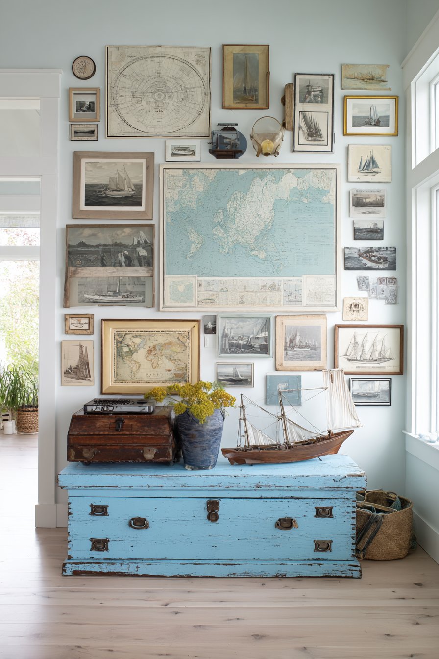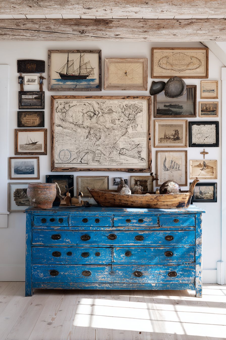 A nautical-themed vintage gallery wall features antique frames in weathered driftwood, tarnished brass porthole styles, and painted wood with chipped navy and white finishes. The collection includes vintage maritime maps, antique ship diagrams, sepia sailing photographs, aged tide charts, and vintage seaside postcards—imagery that celebrates seafaring heritage, coastal living, and maritime exploration. Arranged above a distressed blue painted chest, this display brings authentic weathered textures and maritime vintage aesthetic to coastal homes, beach houses, or anywhere you want to evoke oceanic atmosphere.