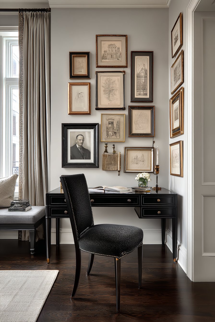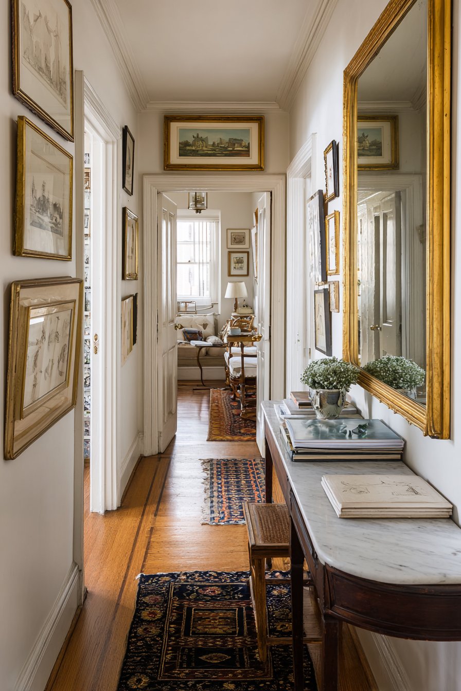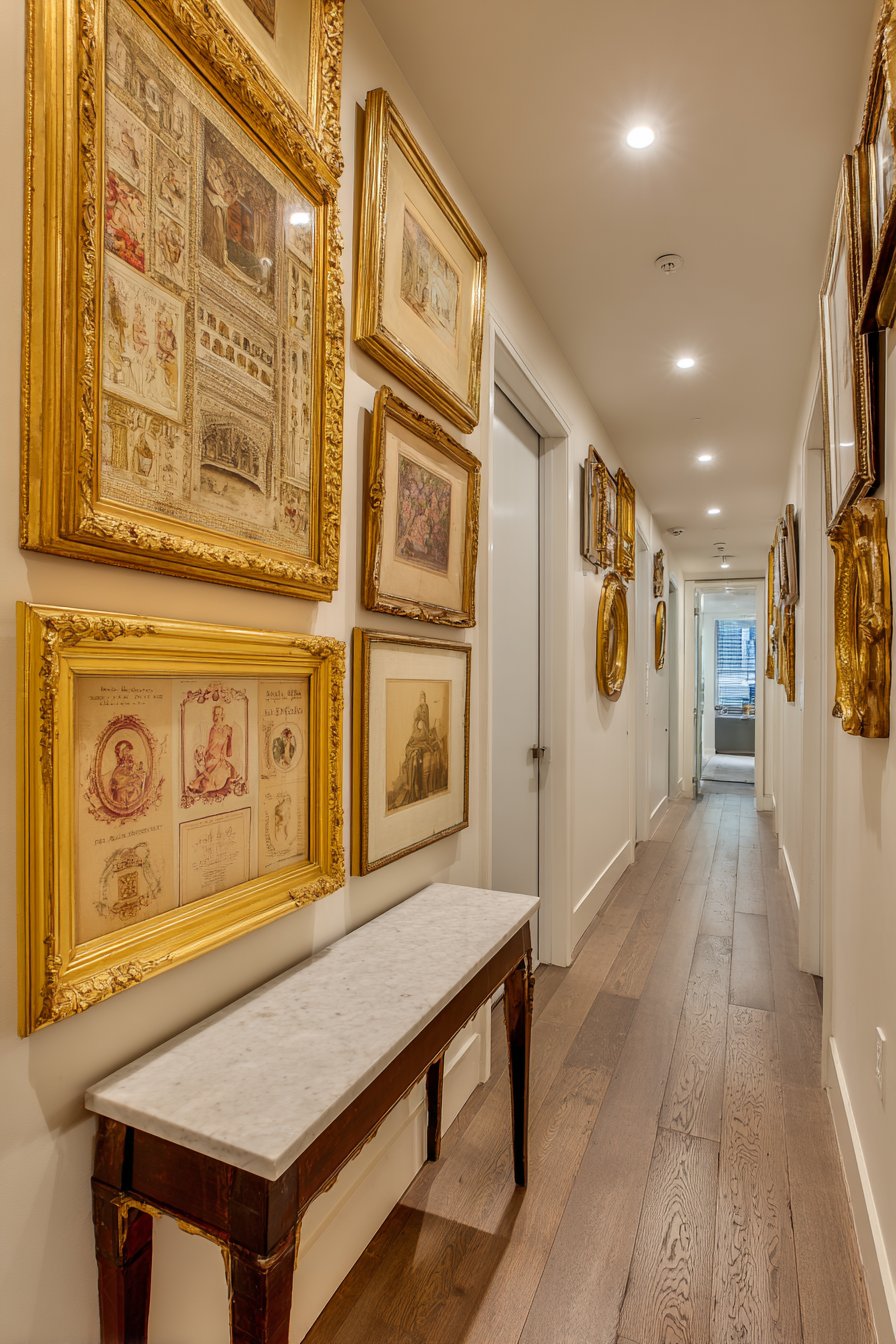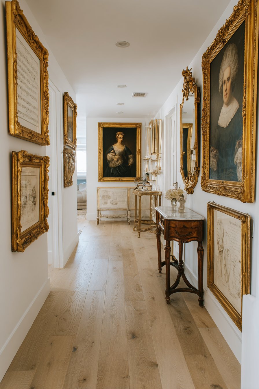 The graduated sizing creates natural rhythm and movement, with larger frames anchoring key points and smaller frames filling spaces between. This approach to arrangement takes advantage of the hallway’s linear nature, creating a visual narrative that unfolds as you walk past. Natural corridor lighting creates gentle highlights on the gold leaf details, with light from doorways and windows at either end providing illumination that changes throughout the day.