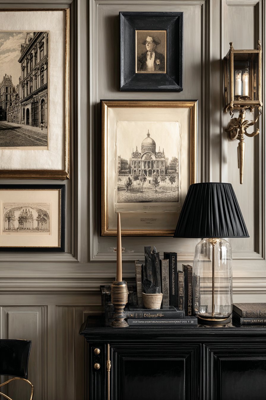 Professional interior photography with controlled lighting emphasizes the dramatic tonal contrasts and elegant vintage refinement. The lighting must be carefully balanced to reveal the subtle variations in black frames without creating harsh glare on glass surfaces or washing out the delicate gray tones in the background wall. The result is sophisticated and gallery-like, appropriate for formal spaces or contemporary interiors where vintage elements are introduced sparingly for maximum impact.