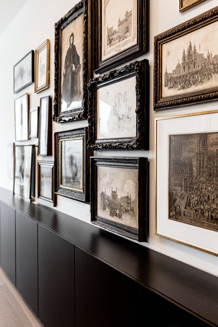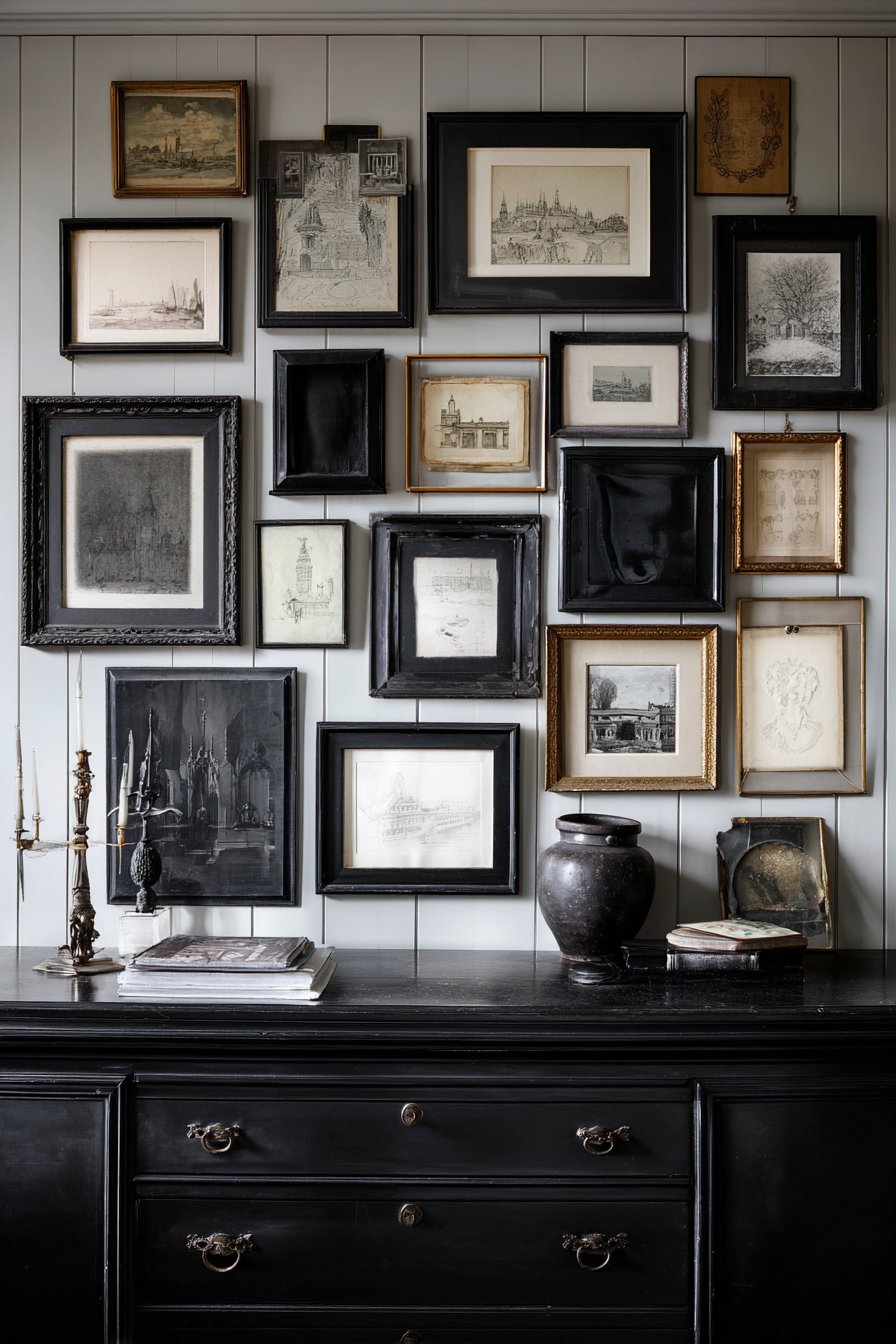 • Stick to a monochromatic color scheme in artwork to allow diverse frame styles to coexist harmoniously