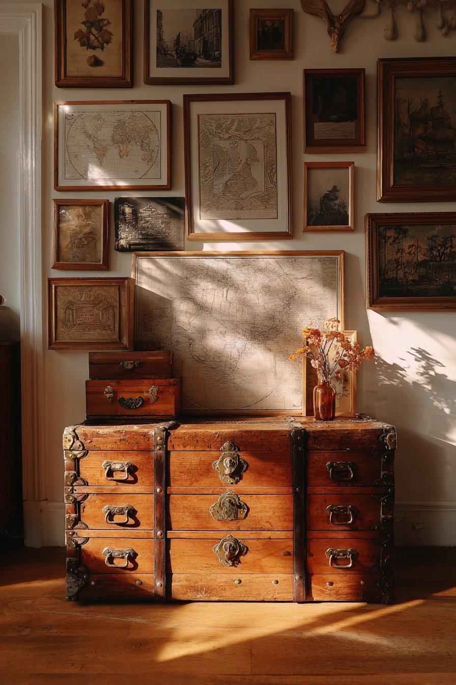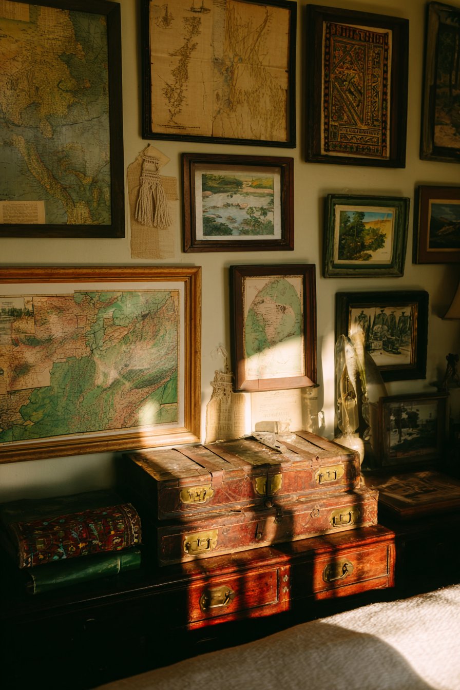 Positioned above a carved wooden trunk with brass hardware, this arrangement evokes the romantic notion of collected treasures brought home from travels abroad. The trunk itself might have accompanied someone on voyages, making it functionally and aesthetically appropriate as the foundation for this globally-inspired collection. The eclectic nature of both frames and subject matter creates energy and visual complexity that rewards extended viewing.