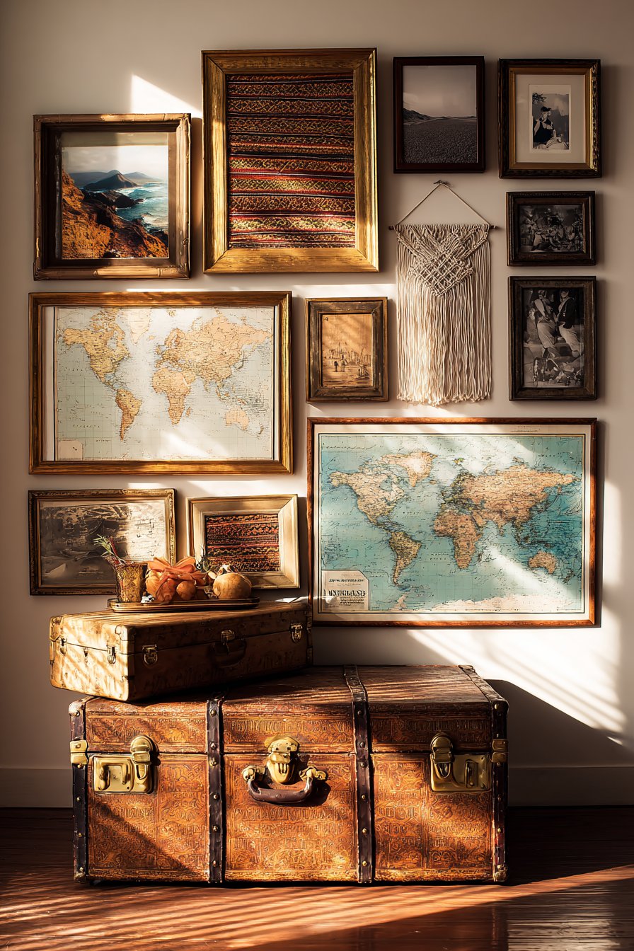 Warm natural lighting creates an adventurous, worldly vintage atmosphere with emphasis on authentic cultural artifacts. The lighting should feel warm and inviting like sunlight in exotic locations rather than cool and clinical. This atmospheric quality helps transport viewers imaginatively to the places represented in the photographs and maps, making the gallery wall an invitation to armchair travel and cultural exploration.