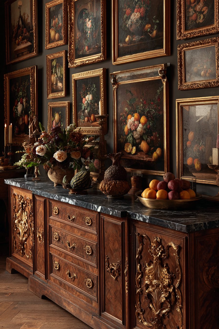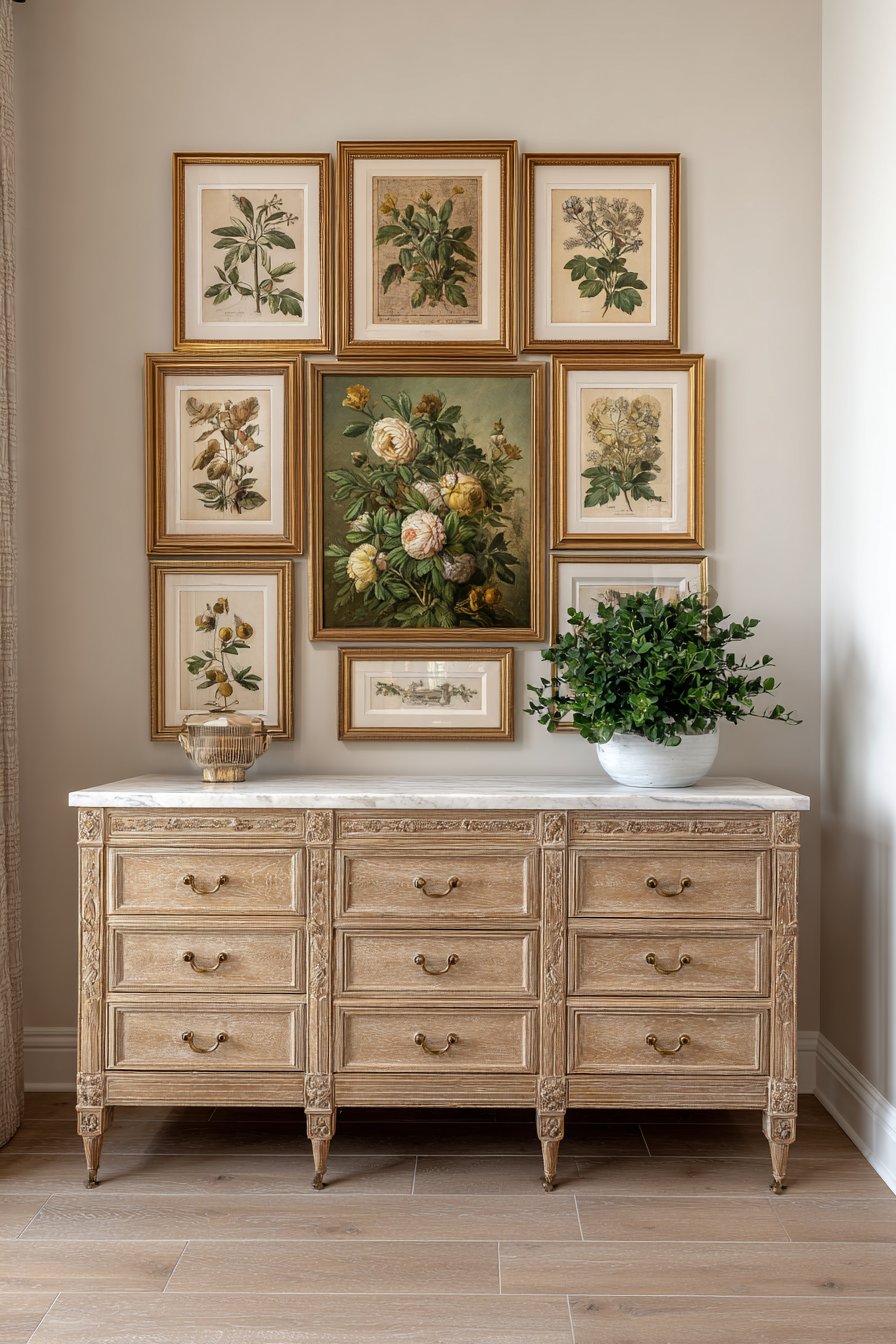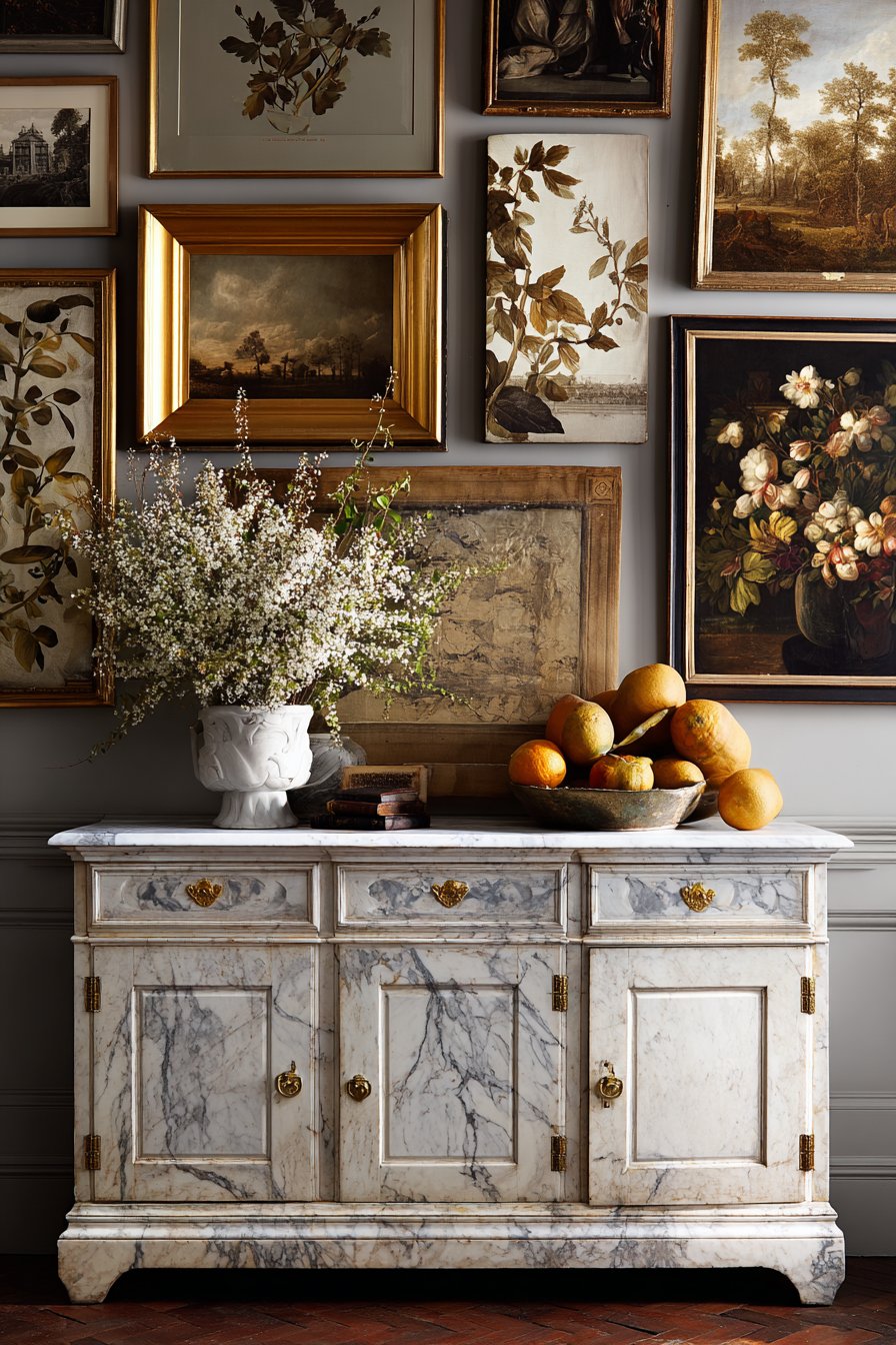 Arranged above a marble-topped antique sideboard with brass hardware showing natural patina, this display demonstrates how vintage furniture and artwork can elevate each other when thoughtfully paired. The marble surface echoes the classical elegance of Renaissance art, while the brass hardware connects to the golden frame finishes, creating subtle visual links throughout the composition. The sideboard also provides practical storage while serving as a display surface for complementary decorative objects.