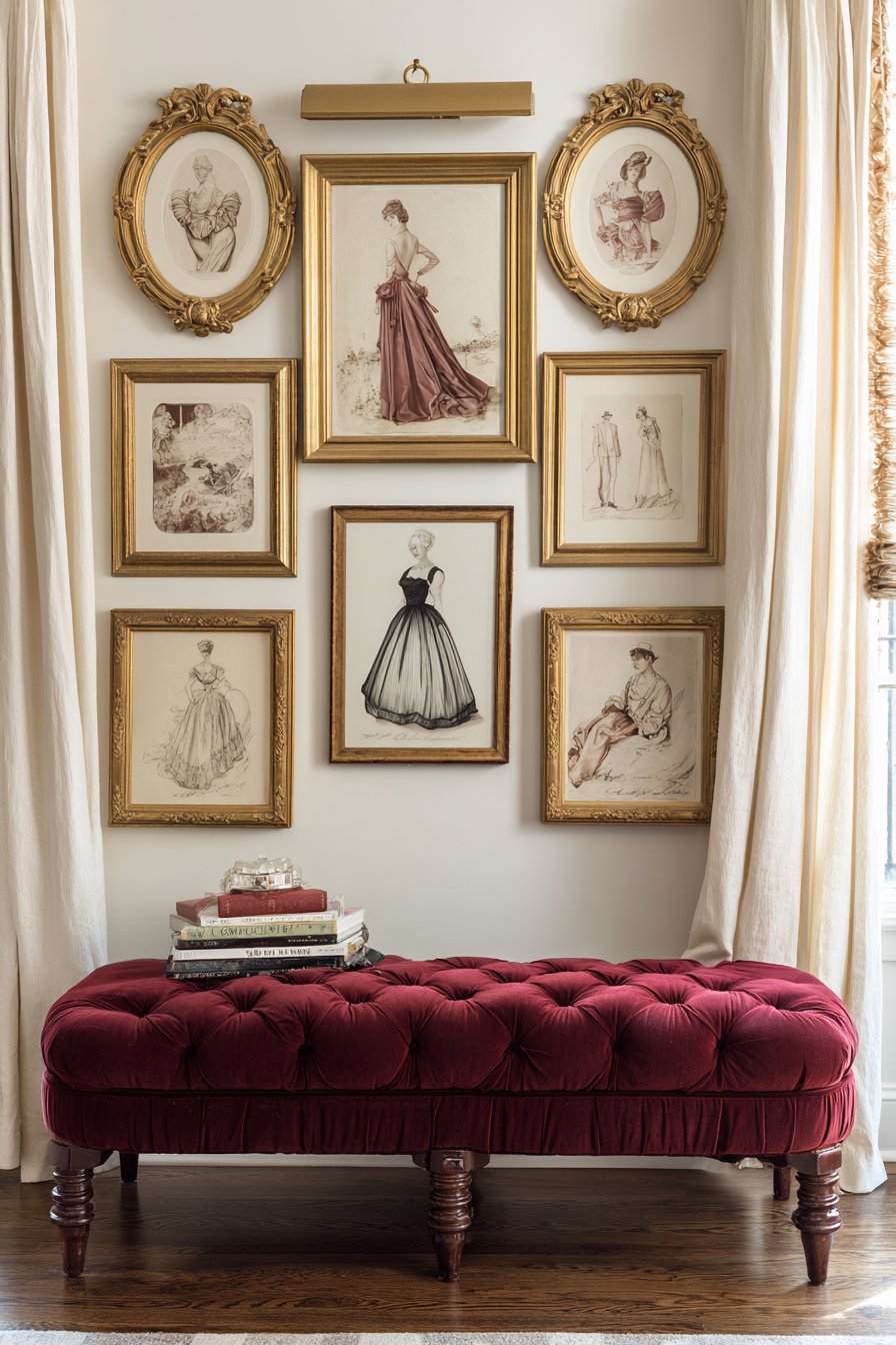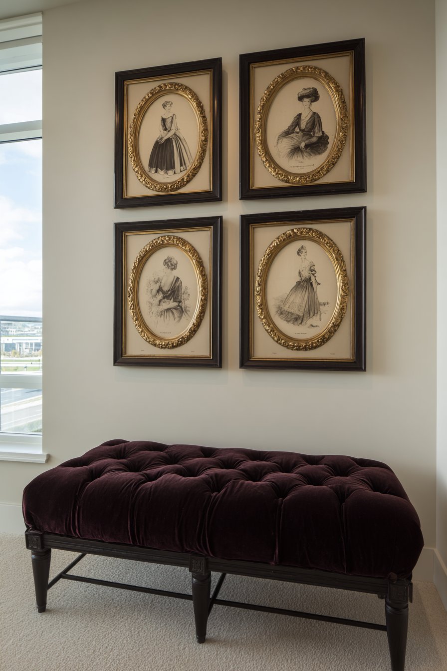 Centered precisely above a tufted velvet bench in deep burgundy, this arrangement demonstrates how symmetry creates a sense of calm and intentionality in interior spaces. The formal balance appeals to those who find comfort in order and classical design principles. The burgundy velvet provides rich color contrast against the gold frames while echoing the luxurious materials and jewel tones popular during the baroque period.