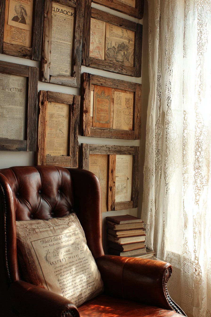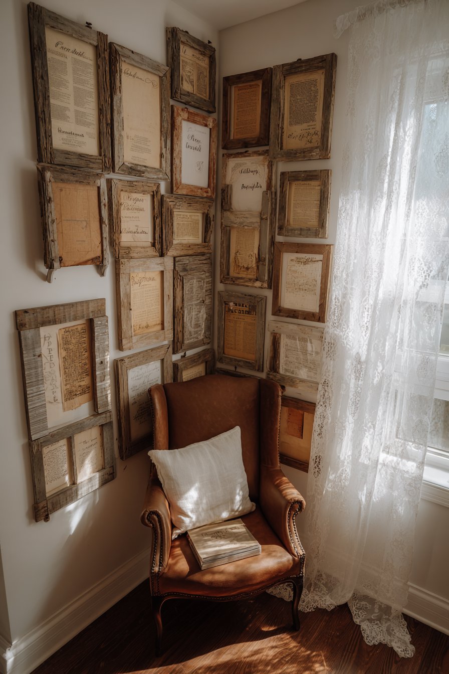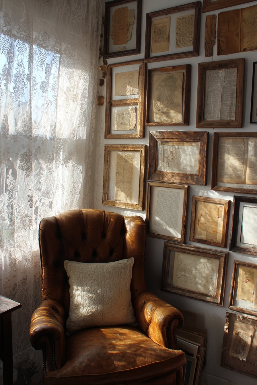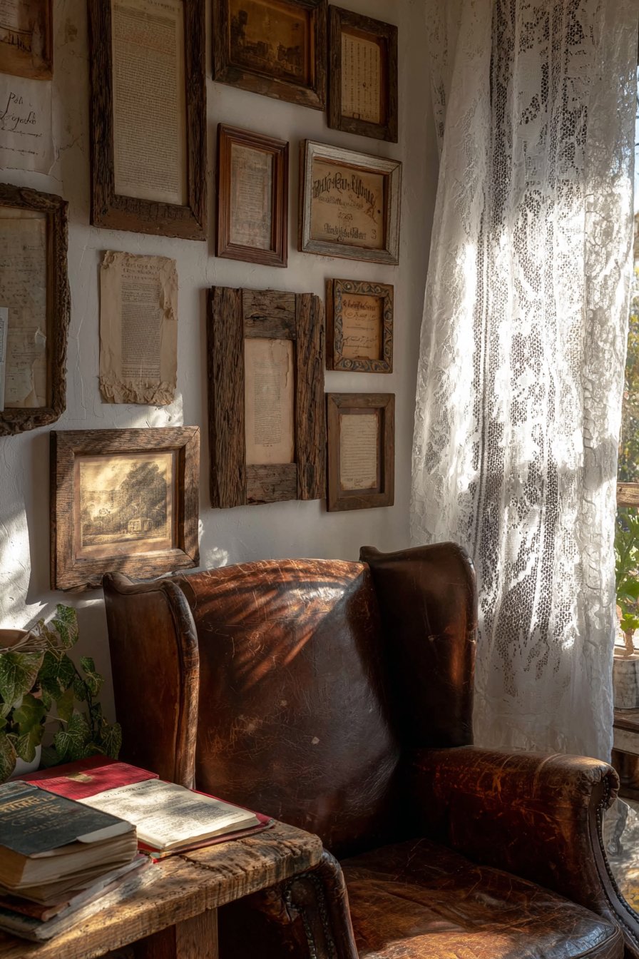 The wingback chair upholstered in worn leather positioned below this gallery wall creates an irresistible invitation to curl up with a good book. This thoughtful furniture placement transforms a simple wall display into a complete destination within the room—a dedicated space for quiet contemplation and literary escape. The patina on the leather chair mirrors the aged quality of the frames and documents, creating material harmony throughout the vignette.