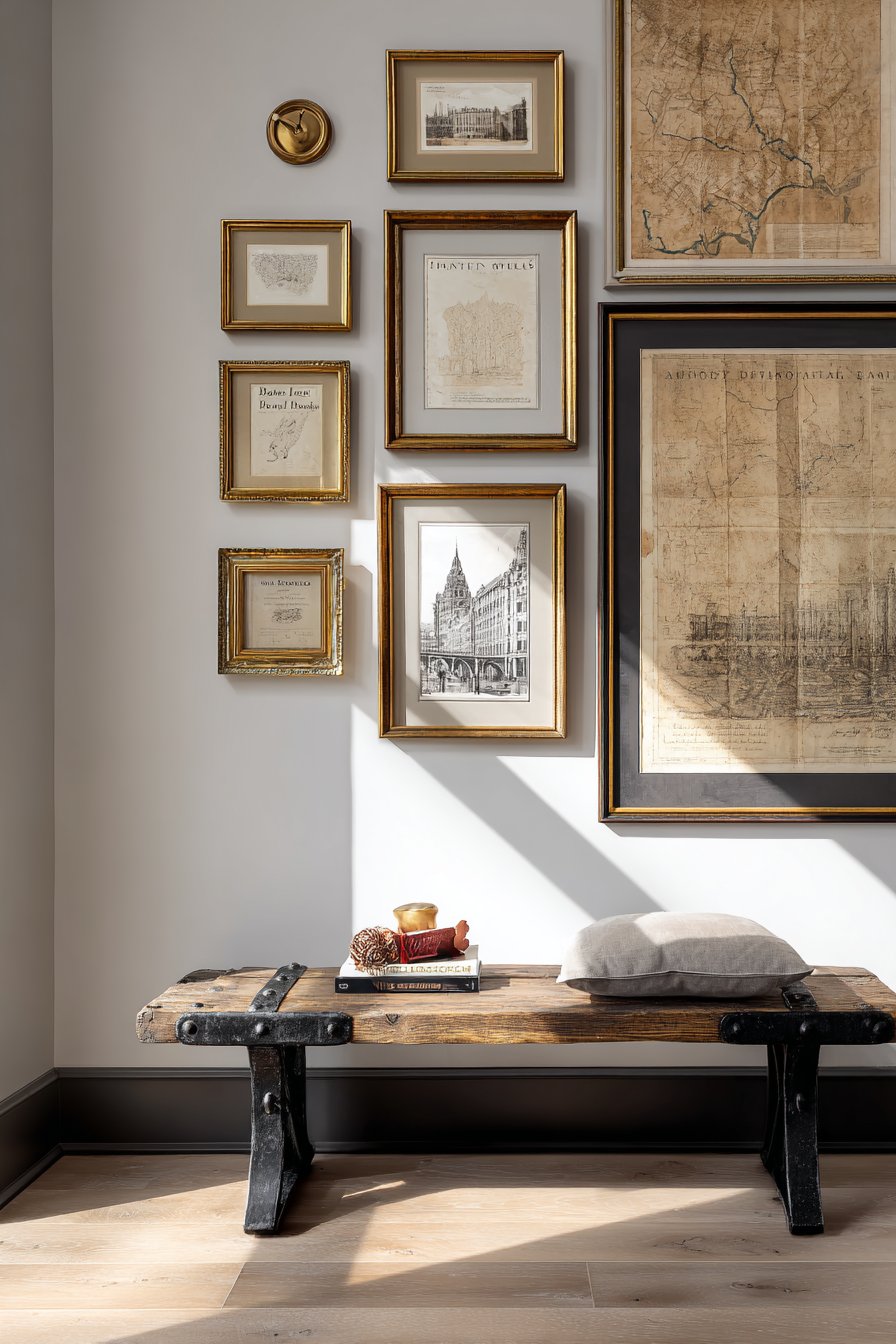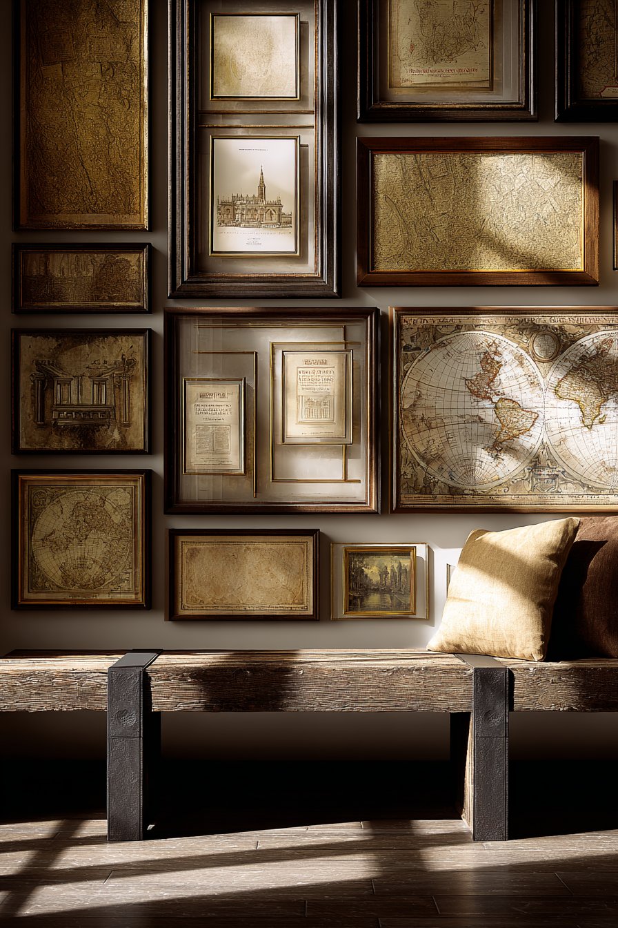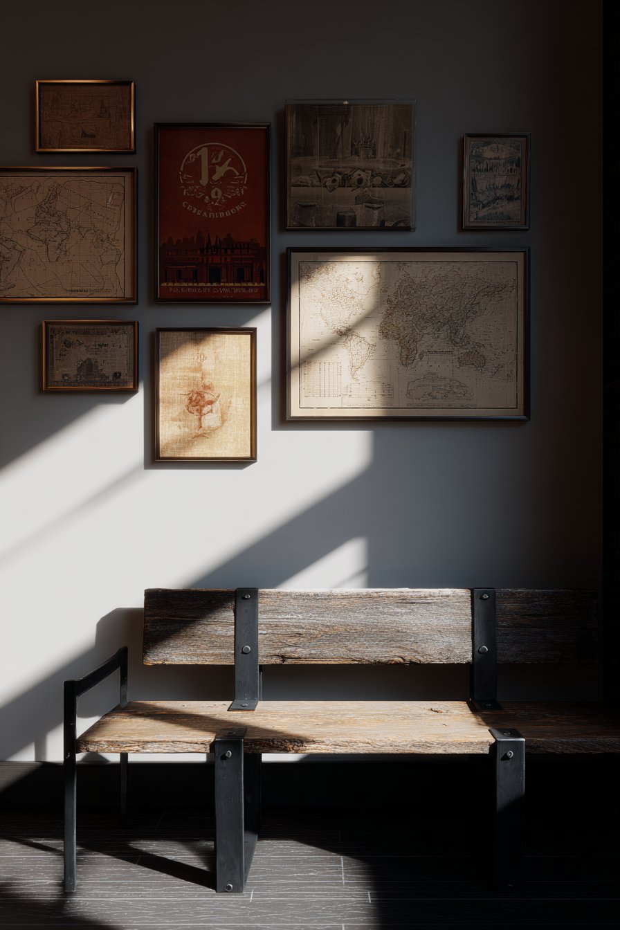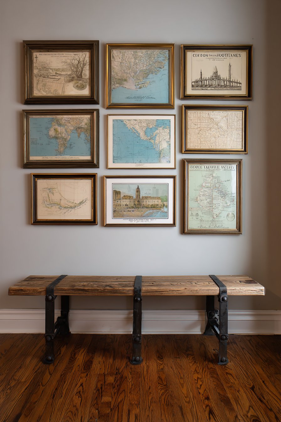 Positioned above a reclaimed wood bench with metal industrial brackets, this gallery wall demonstrates how mixed materials and styles can coexist when united by cohesive color palettes and intentional design choices. The industrial metal brackets provide contemporary edge that prevents the vintage elements from feeling too nostalgic or dated, while the reclaimed wood connects to the historical nature of the framed materials.