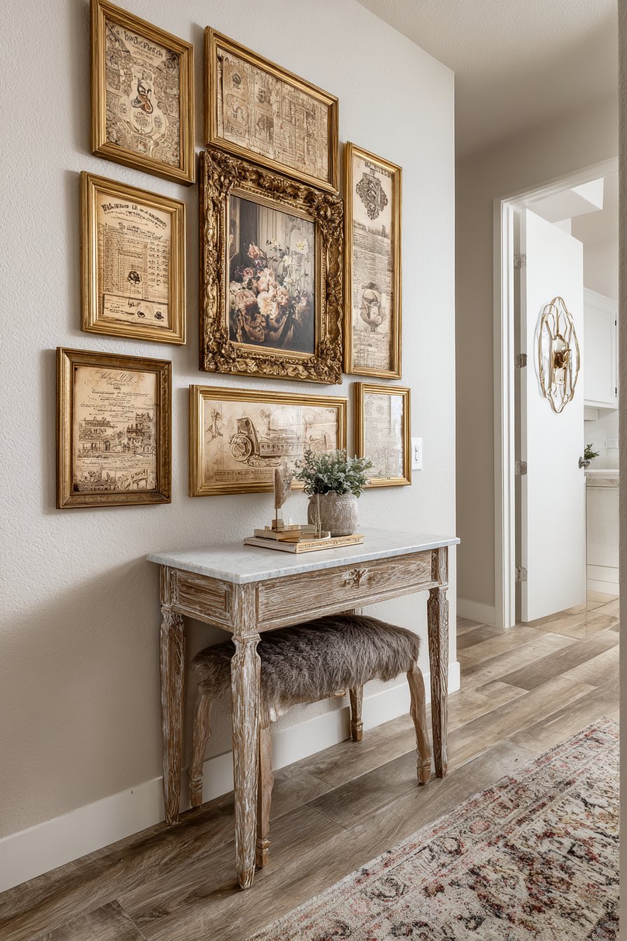 In a hallway setting, a gallery-style progression of ornate gilded frames in graduated sizes creates a vintage gallery wall that guides movement through the space while providing visual interest along the journey. The arrangement includes vintage fashion plates, antique sheet music under glass, yellowed family photographs, and classical art reproductions—a diverse collection united by gilded frames and historical subject matter. A narrow antique console table with marble top sits below, providing a resting point for keys, mail, or decorative objects without impeding traffic flow.
