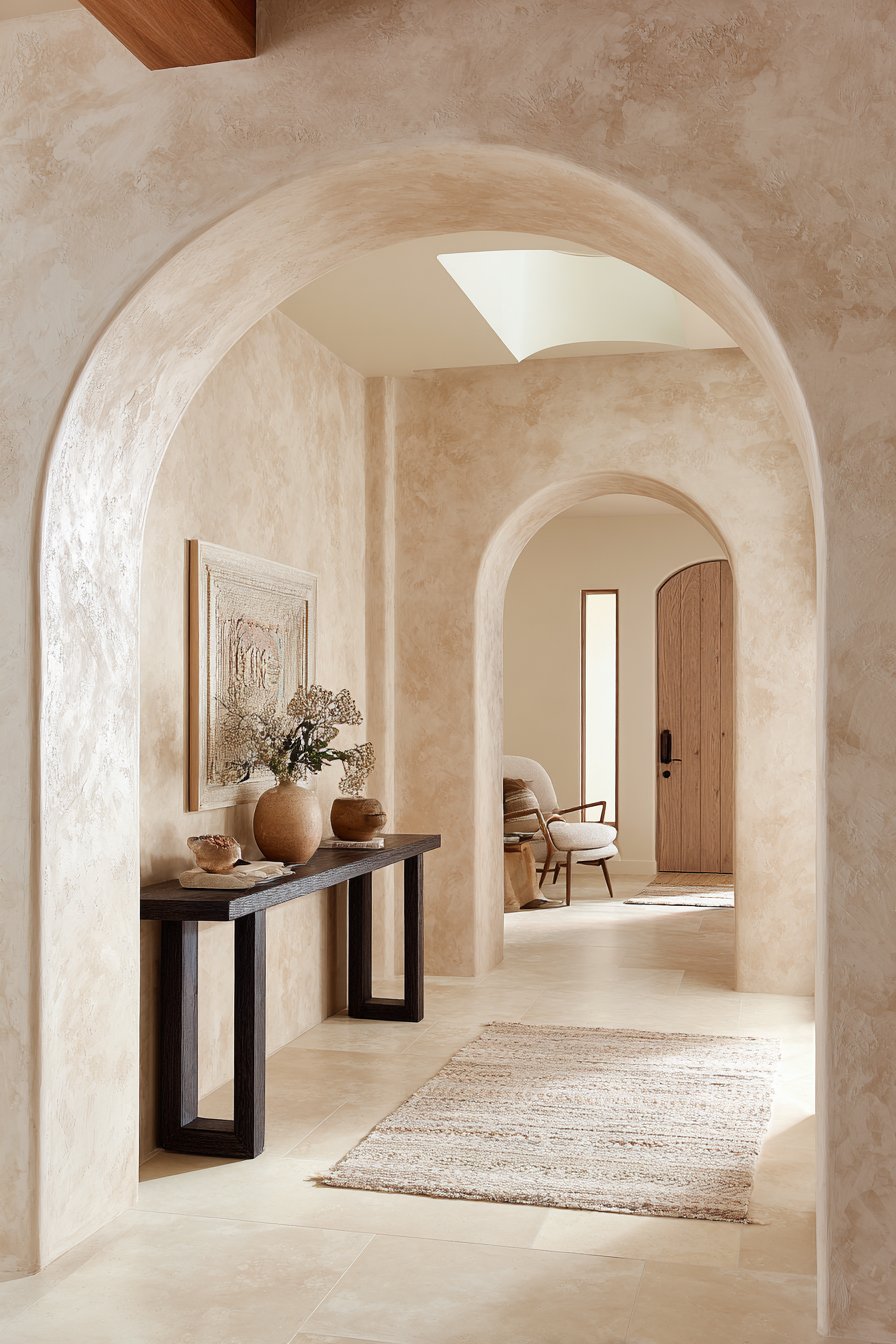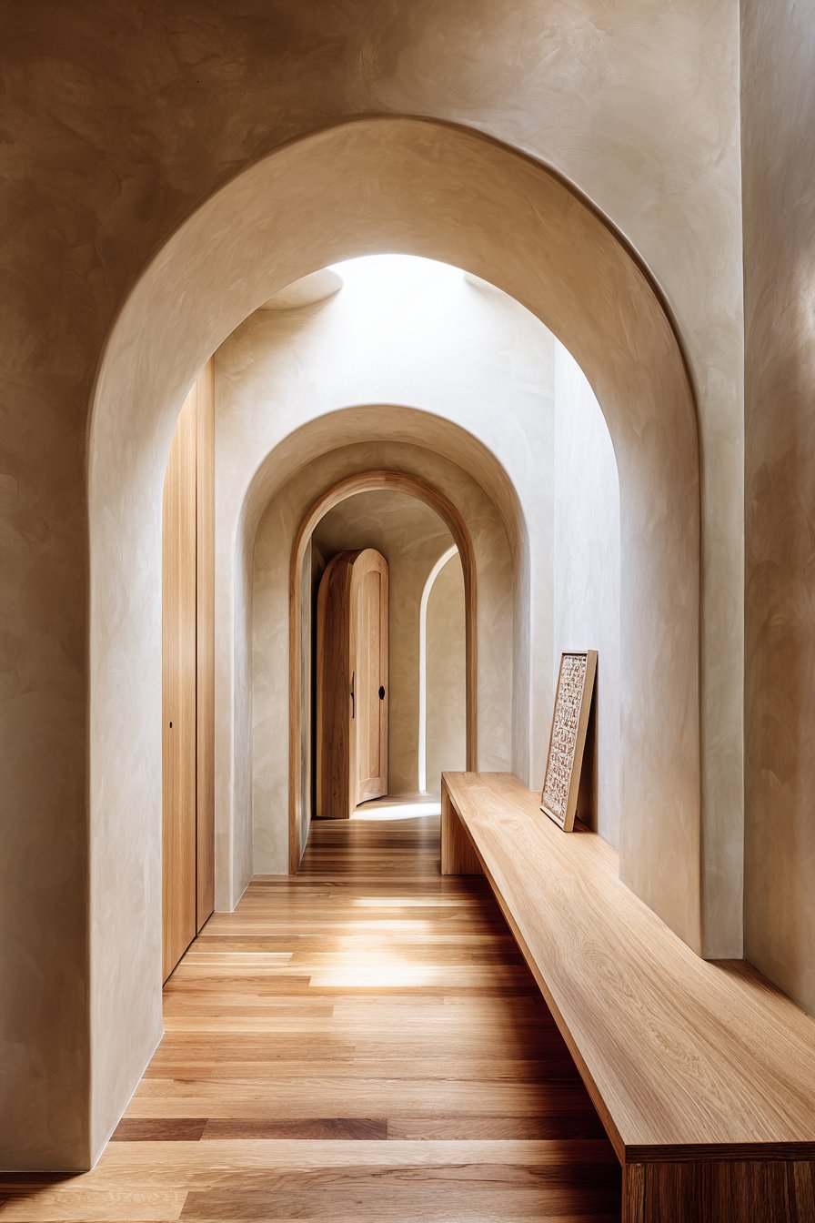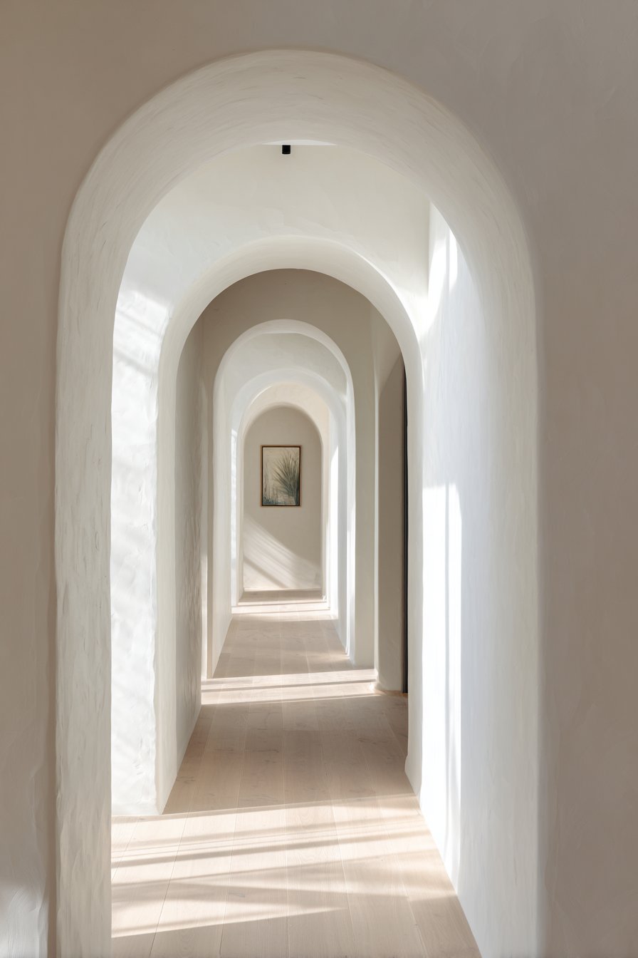 The architectural rhythm created by multiple arches in sequence has a calming, almost meditative quality. As you move through the space, each arch frames the next, creating depth and perspective that makes the hallway feel longer and more significant than its actual square footage might suggest. This is smart design that maximizes perceived space through architectural means rather than costly square footage additions. A single piece of artwork or a simple console table with a ceramic vase provides just enough personality without disrupting the serene flow.