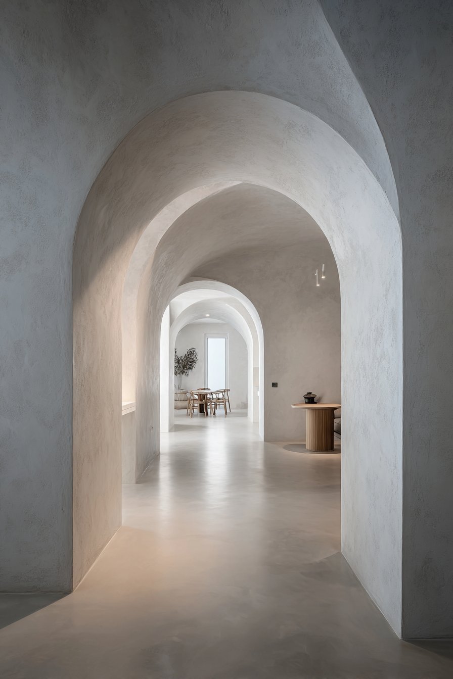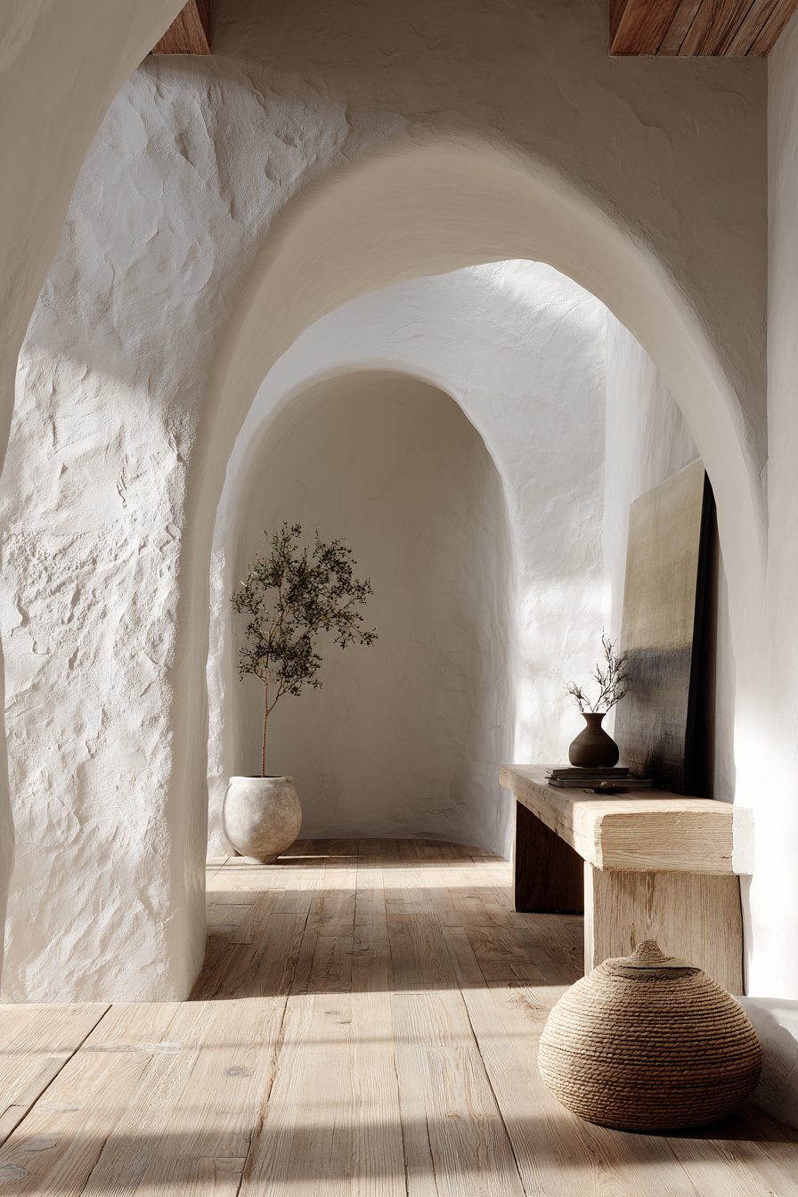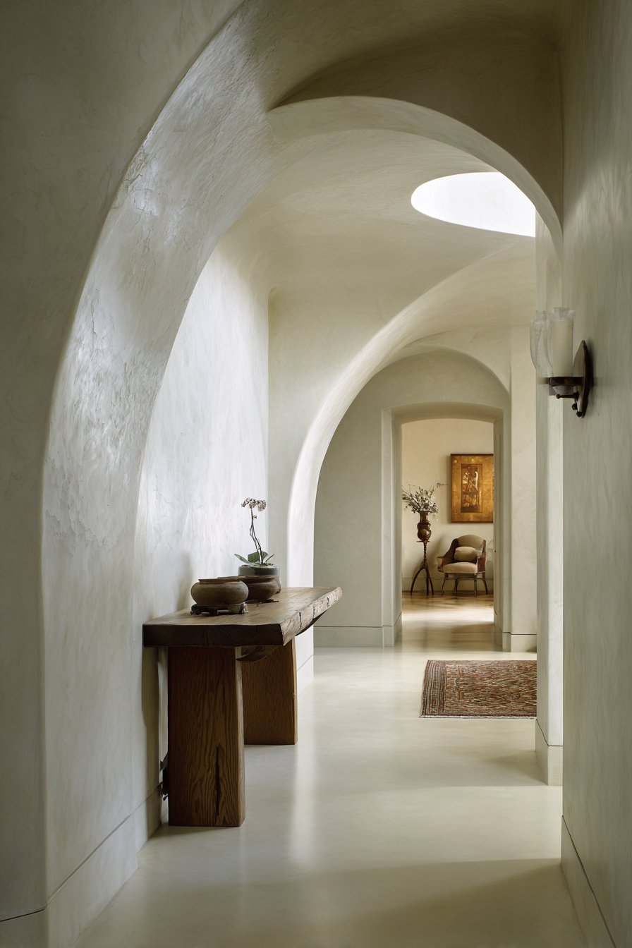 The architectural rhythm created by multiple arches in sequence has a calming, almost meditative quality. As you move through the space, each arch frames the next, creating depth and perspective that makes the hallway feel longer and more significant than its actual square footage might suggest. This is smart design that maximizes perceived space through architectural means rather than costly square footage additions. A single piece of artwork or a simple console table with a ceramic vase provides just enough personality without disrupting the serene flow.