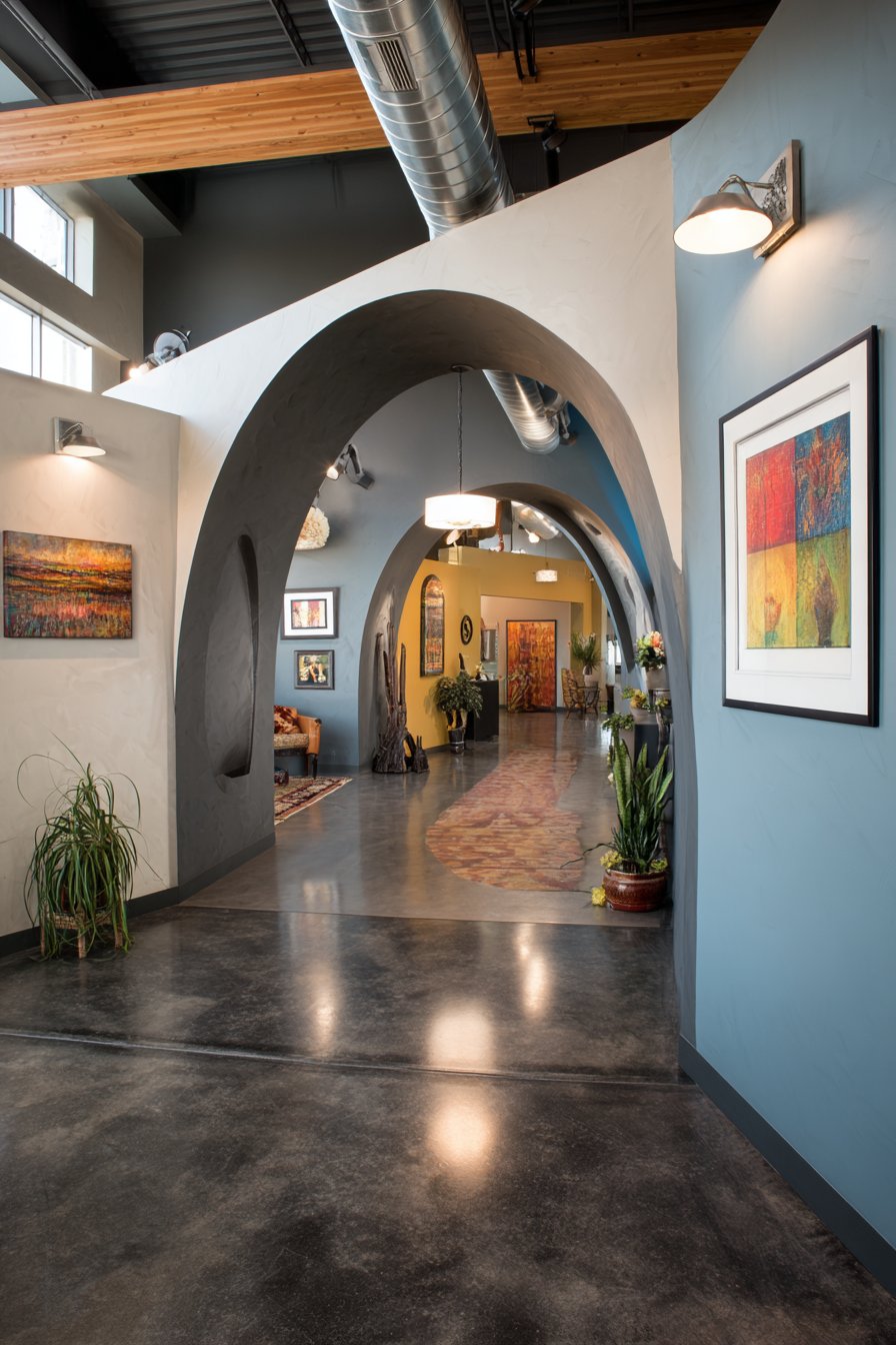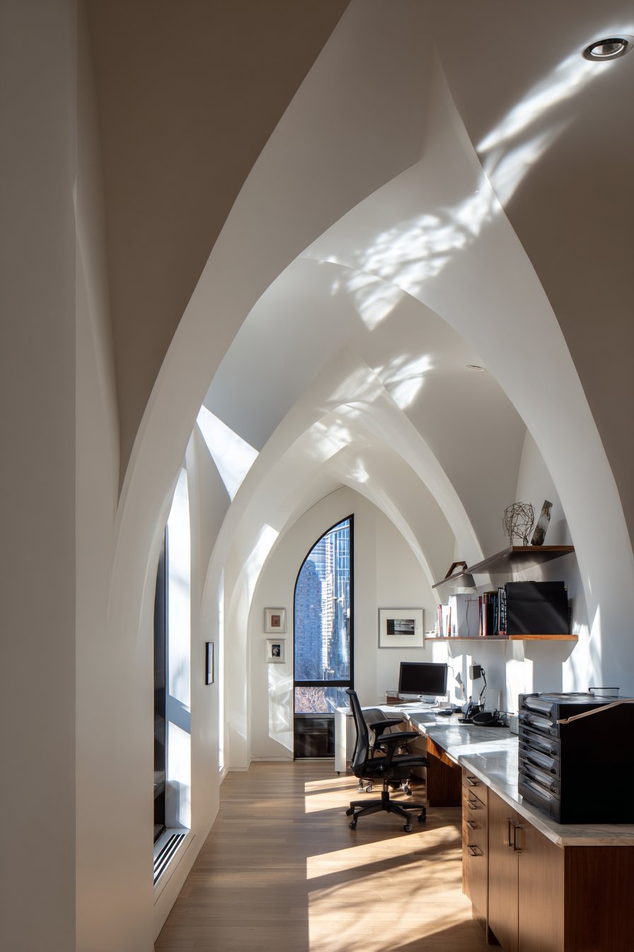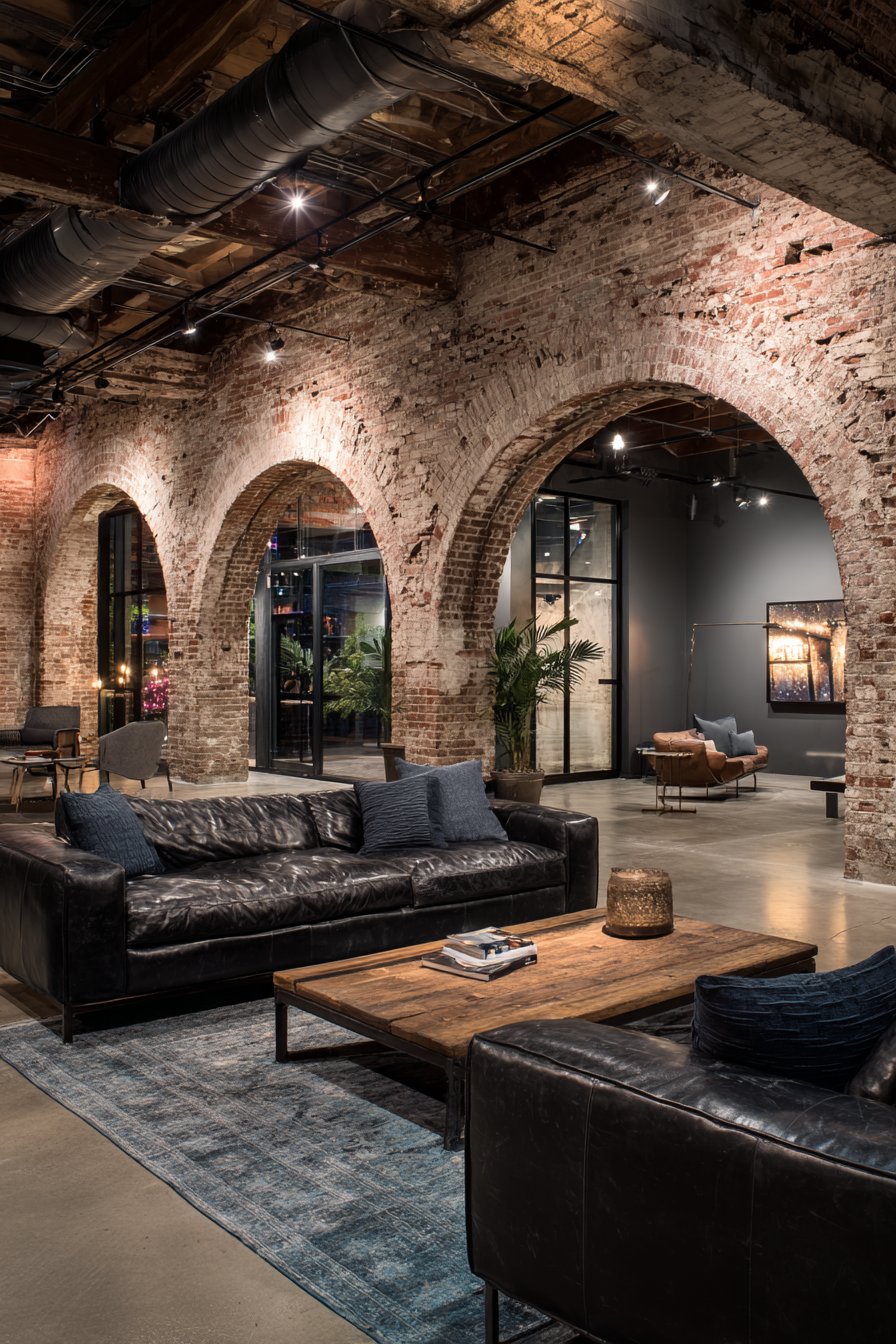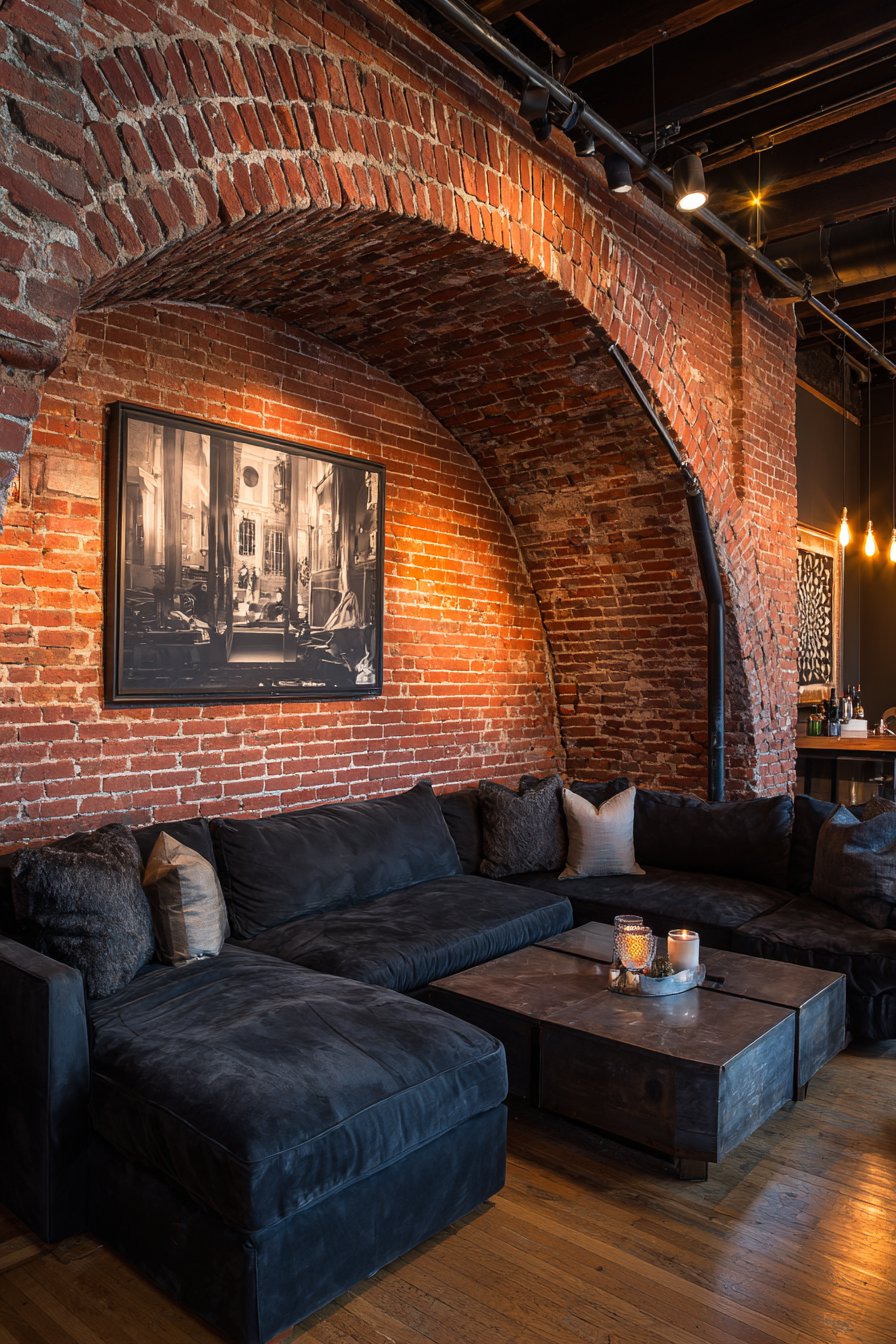 Natural light from windows in the office space creates fascinating interplay with the black arch, producing sharp shadow lines that emphasize the geometric form throughout the day. This constantly changing interaction between light and shadow keeps the design feeling dynamic and alive rather than static. The bold choice requires commitment and confidence, but the payoff is enormous—this arch becomes not just an architectural feature but the defining element of the entire space, the detail people remember and photograph.