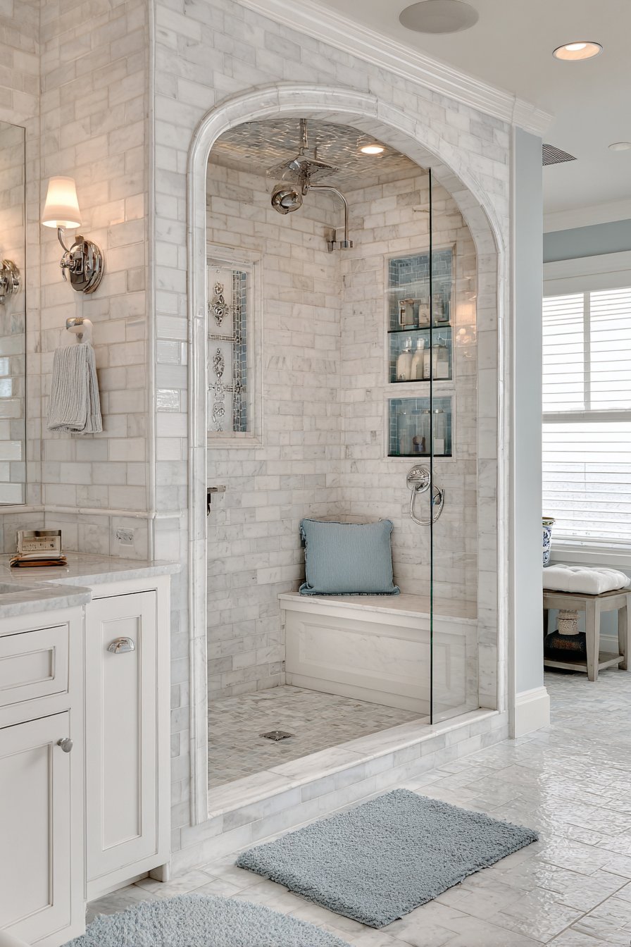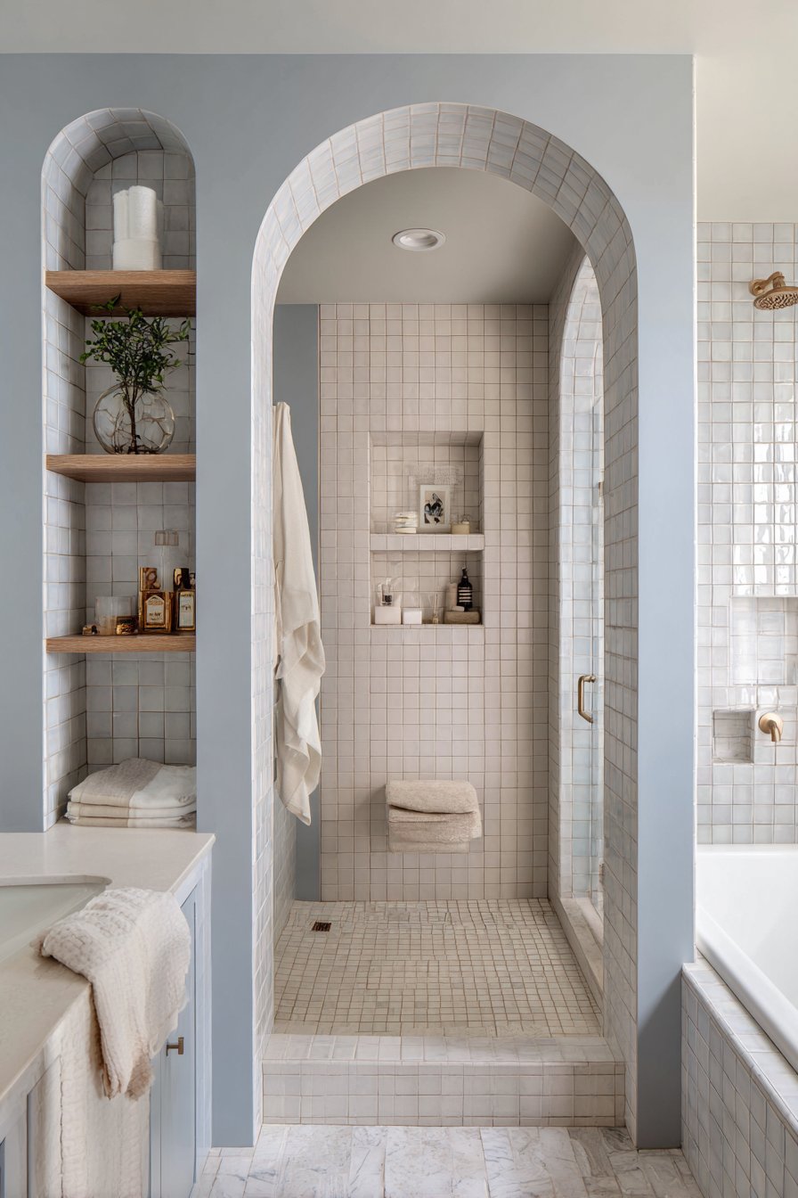 - Use floating shelves within the arch for streamlined storage that maintains the clean architectural lines