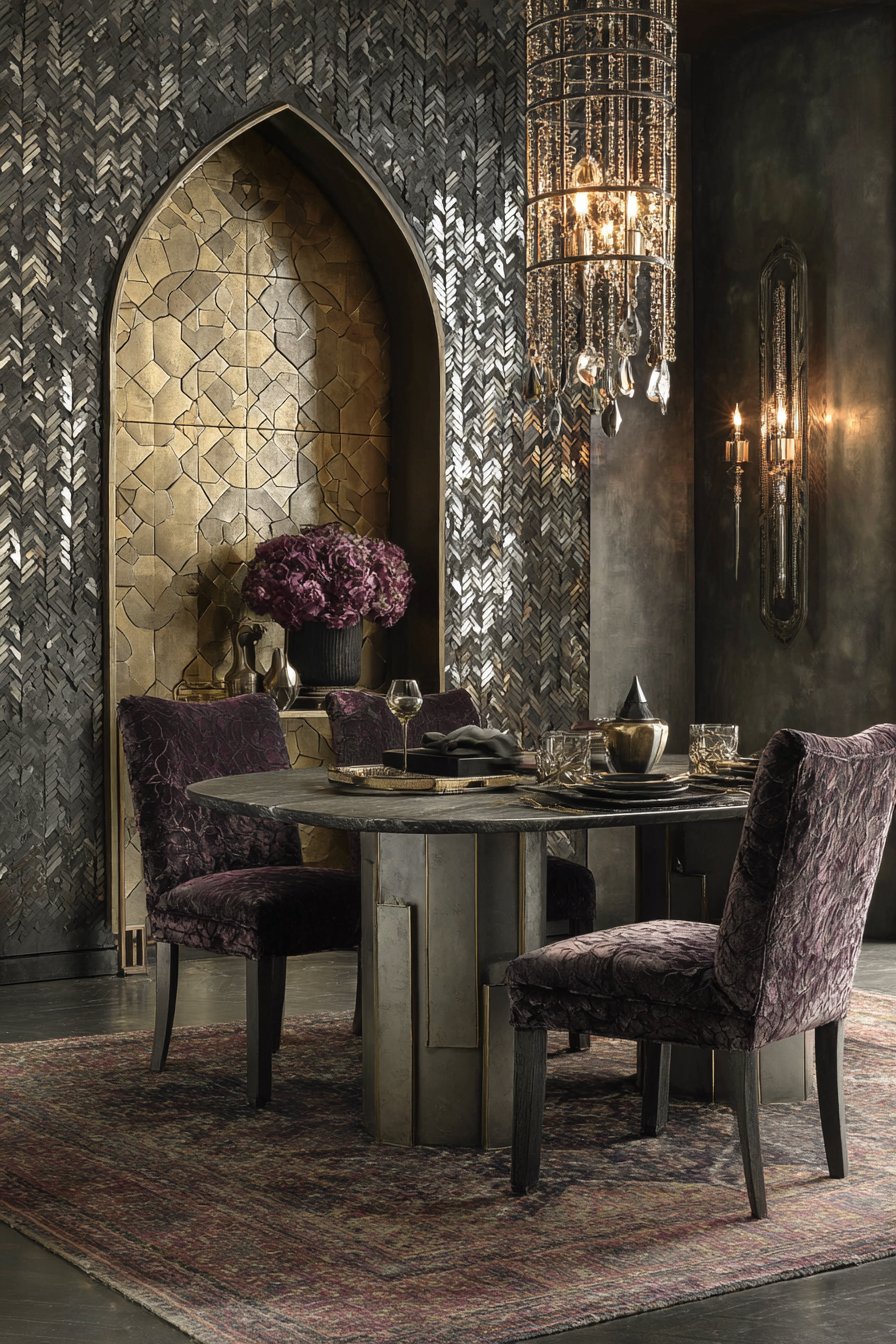 - Incorporate brass, copper, or bronze metallic elements that complement saturated jewel tones