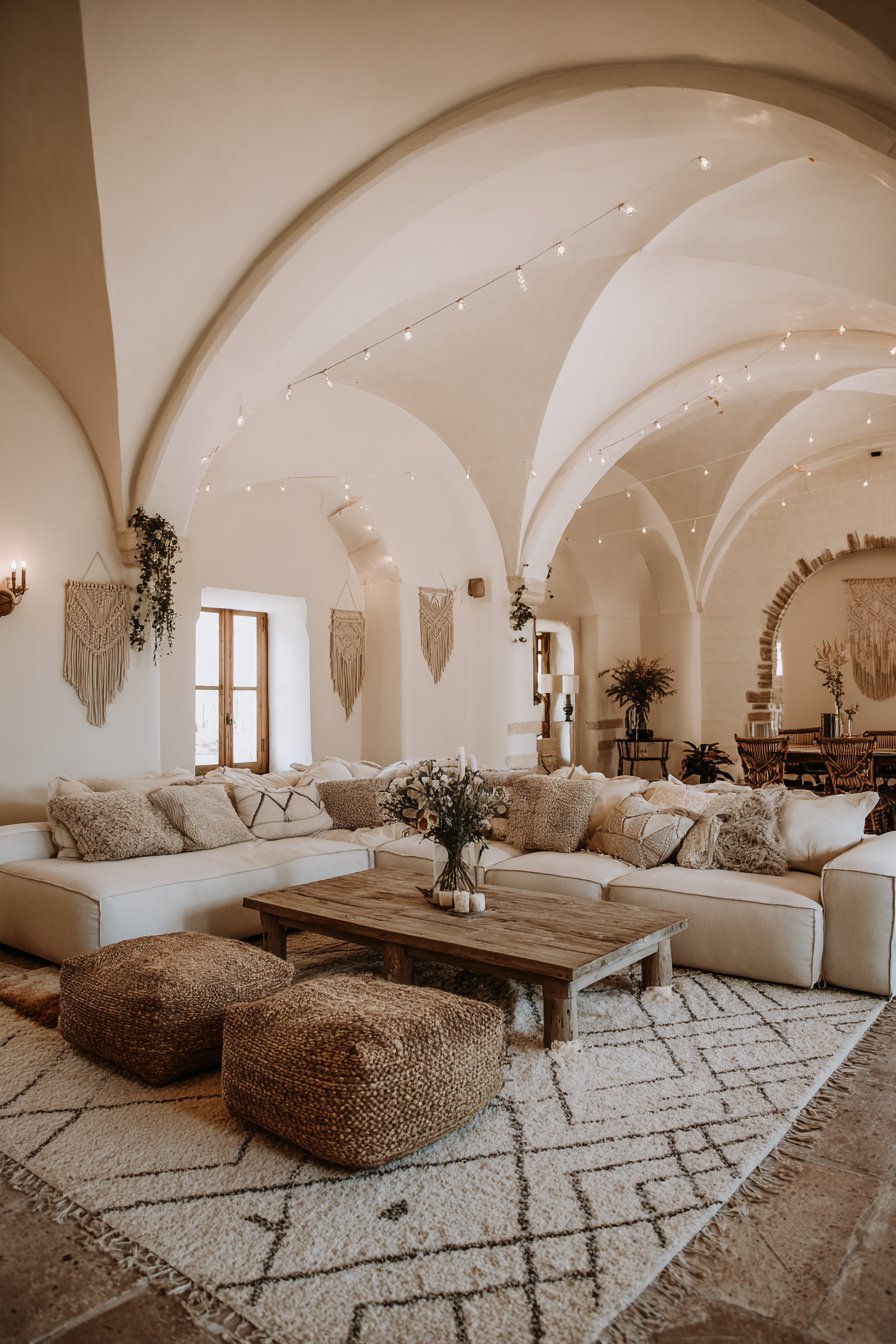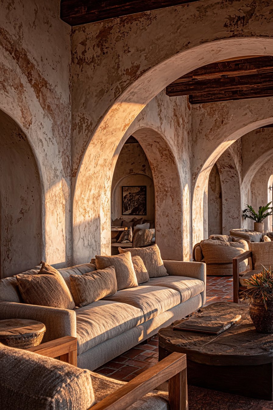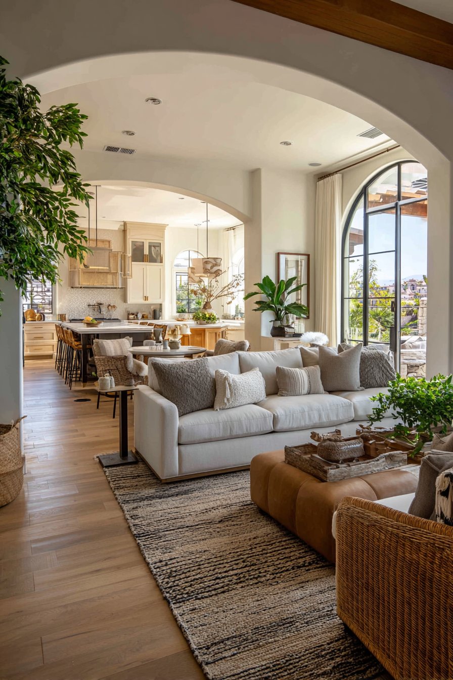 Bohemian wall arches decor ideas embrace texture, warmth, and eclectic layering, perfectly demonstrated in this living room featuring a wide horseshoe arch covered in textured lime wash plaster in warm ivory tones. The arch’s generous width creates an expansive opening between spaces without the need for supporting walls, maintaining openness while providing subtle definition. The lime wash finish gives the surface a soft, matte appearance with subtle color variations and a chalky quality that feels organic and handmade. Unlike perfectly smooth modern finishes, this textured approach shows brushstrokes and natural variation, adding character and visual richness.
