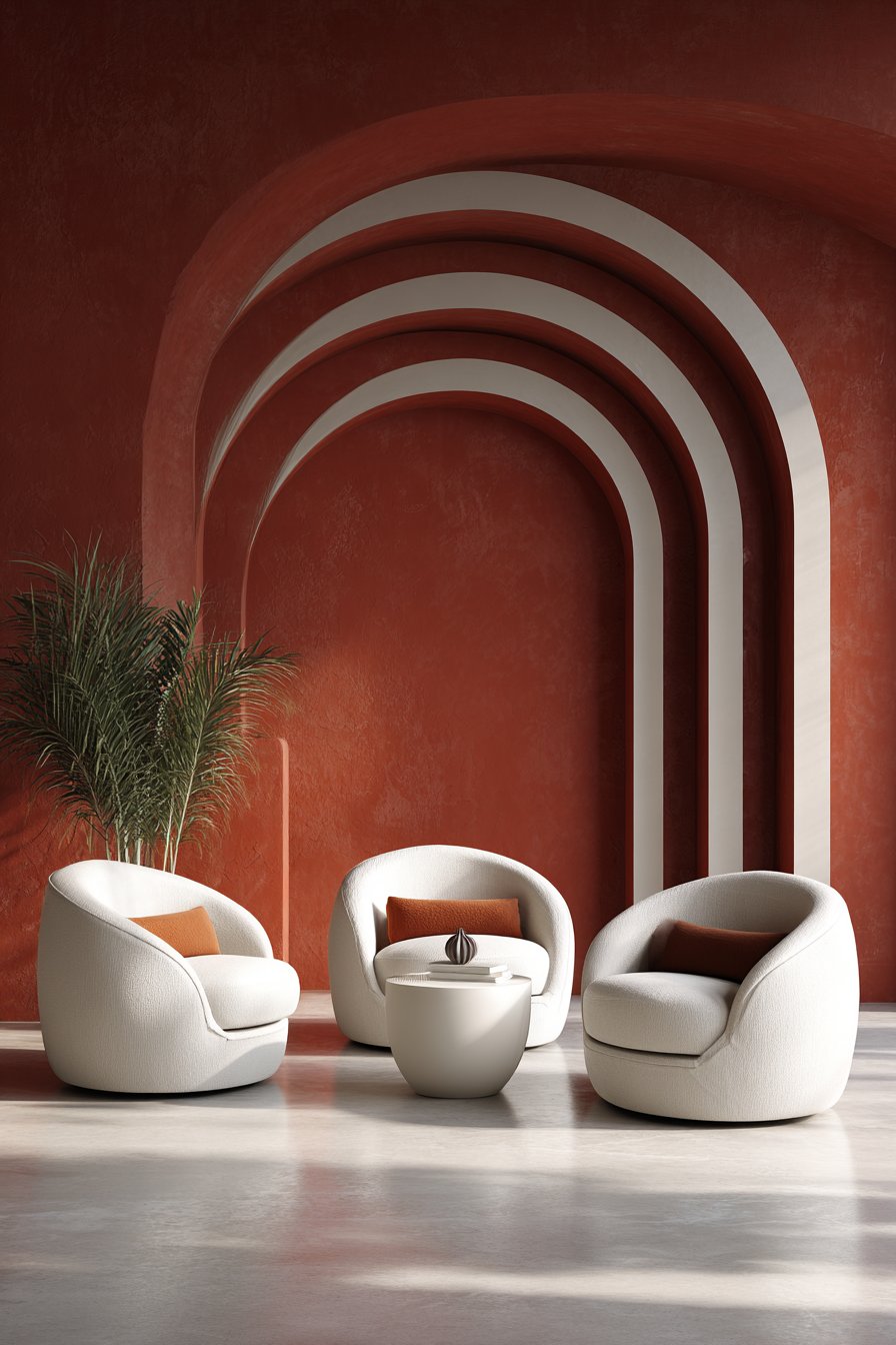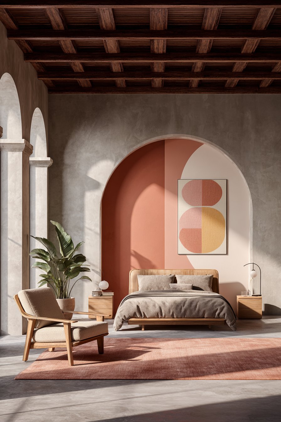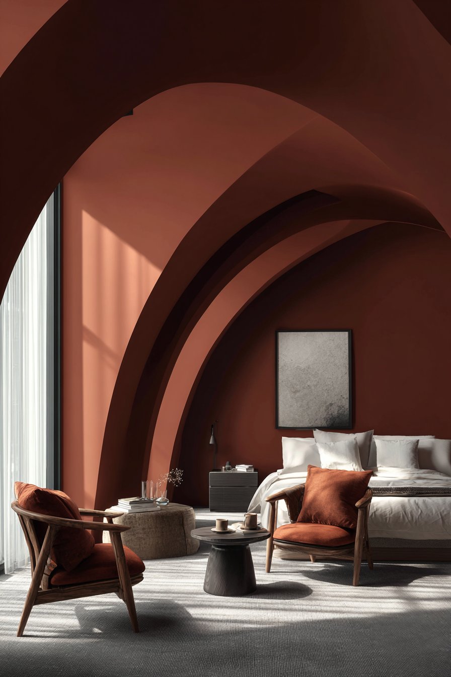 The bold terracotta color makes a powerful statement, introducing warmth and earthy sophistication while creating a focal point that dominates the bedroom space. This isn’t background architecture but rather foreground art that establishes the room’s entire aesthetic direction. The abstract arch shape might curve asymmetrically across the wall behind the bed, perhaps rising higher on one side than the other or featuring unexpected inflections in its curve. This unconventional approach requires design confidence and works best for those who see their home as a canvas for creative expression.