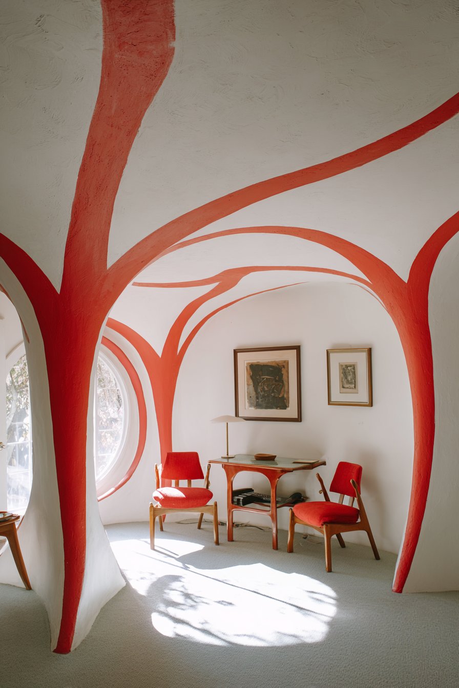 Mid-century modern furniture grounds the artistic arch with classic, recognized design—perhaps an iconic chair, a simple platform bed, and sculptural lighting. Contemporary art on adjacent walls continues the creative theme without competing with the architectural statement. The combination of bold color, abstract form, and respected design classics creates sophisticated eclecticism that feels collected and intentional rather than random or confused. Natural daylight through bedroom windows creates ever-changing shadow lines along the irregular arch curve, making the painted element feel alive and dynamic.