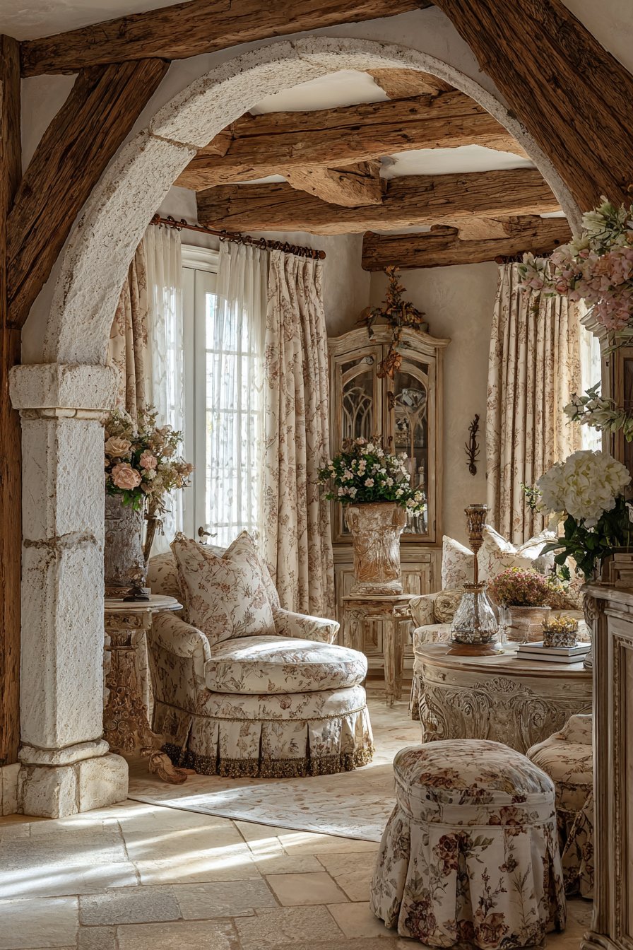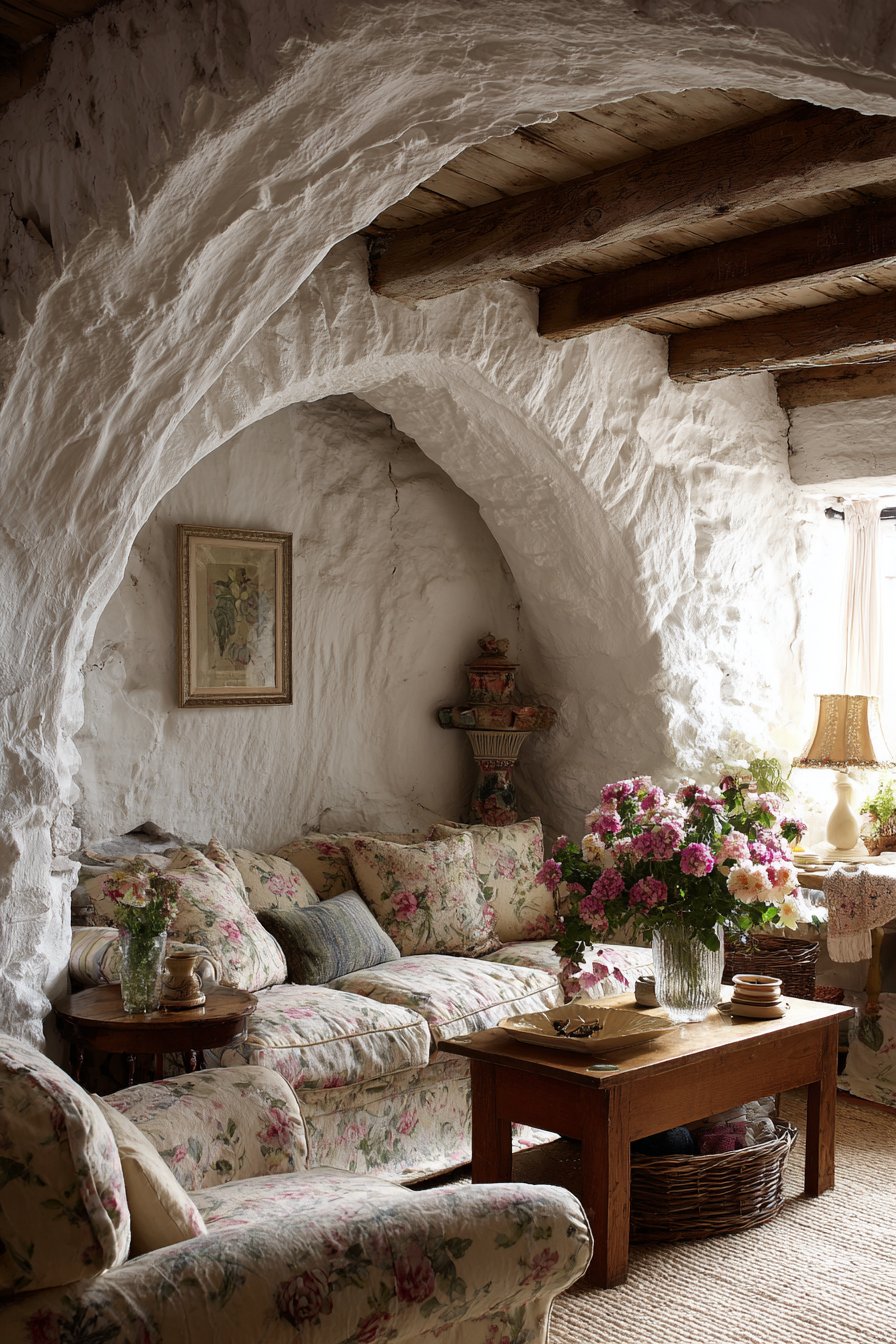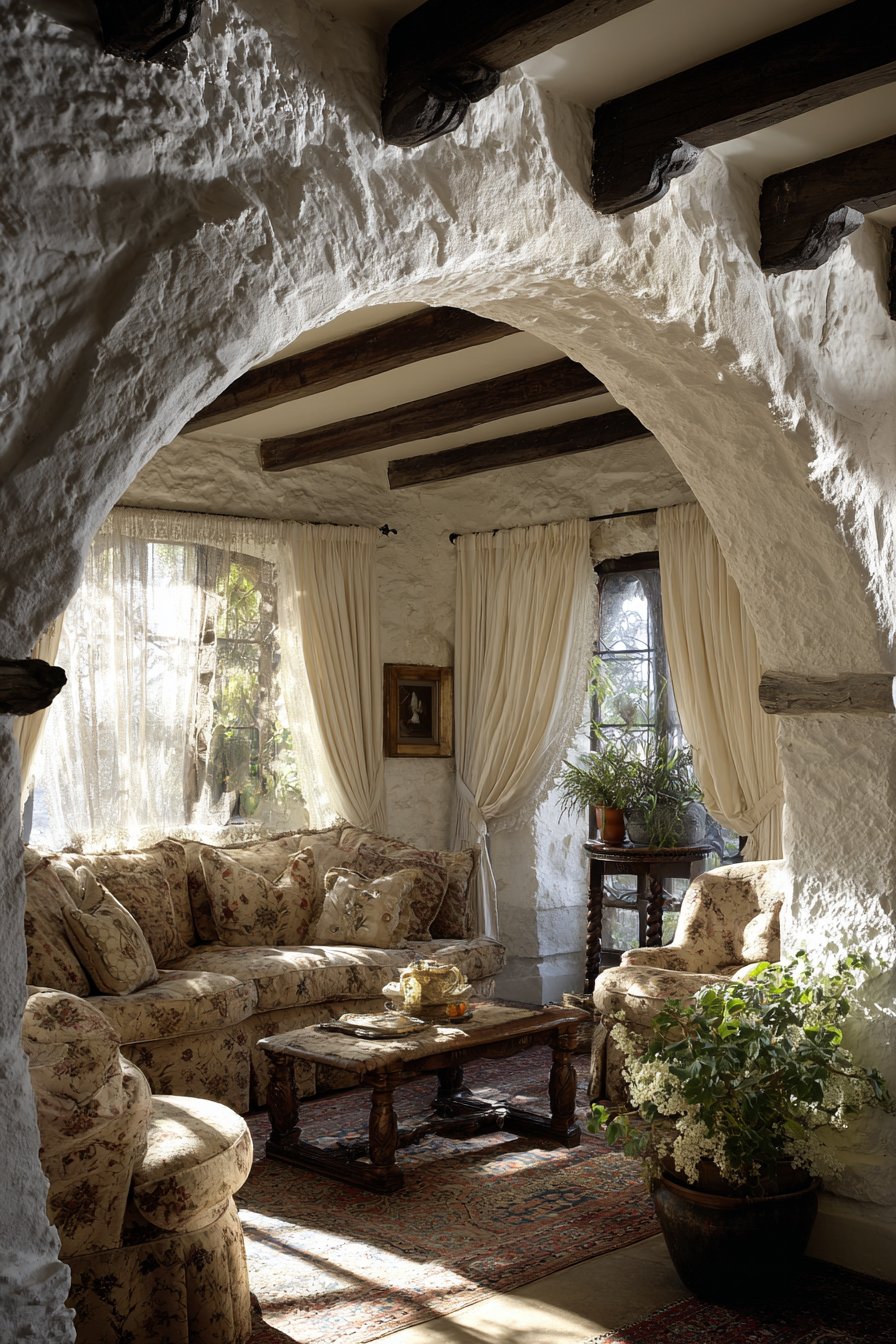 Beyond the arch, the living room embraces cottage coziness with floral chintz fabrics on comfortable seating, antique furniture showing gentle wear, and perhaps a fireplace with timber mantel. Window light filters through lace curtains, creating soft, diffused illumination that highlights the arch’s charming imperfections. A small vase of wildflowers on a side table and needlepoint pillows add to the cottage aesthetic. The overall effect is welcoming and warm, suggesting a home evolved over generations rather than decorated in a single effort.