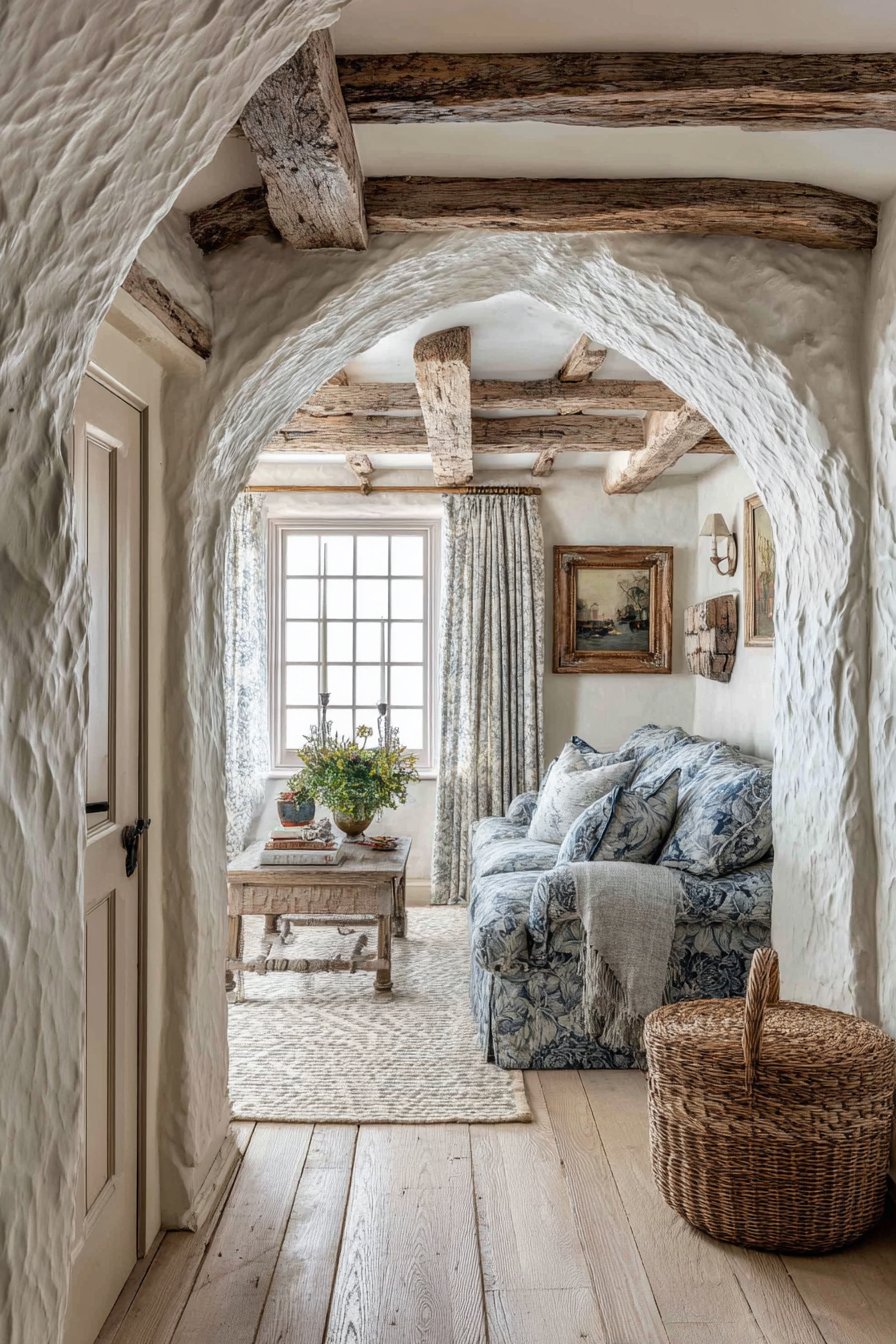 Charming traditional wall arches decor ideas capture storybook appeal, as seen in this English cottage living room featuring a low curved arch doorway with whitewashed plaster and exposed oak beam across the top. The arch’s lower height reflects historical cottage construction where doorways accommodated shorter average human heights and conserved heat through smaller openings. This authentic detail makes the space feel genuinely historic and full of character rather than merely decorated to suggest age. The whitewashed plaster over stone or brick creates the soft, uneven surface characteristic of centuries-old cottages.