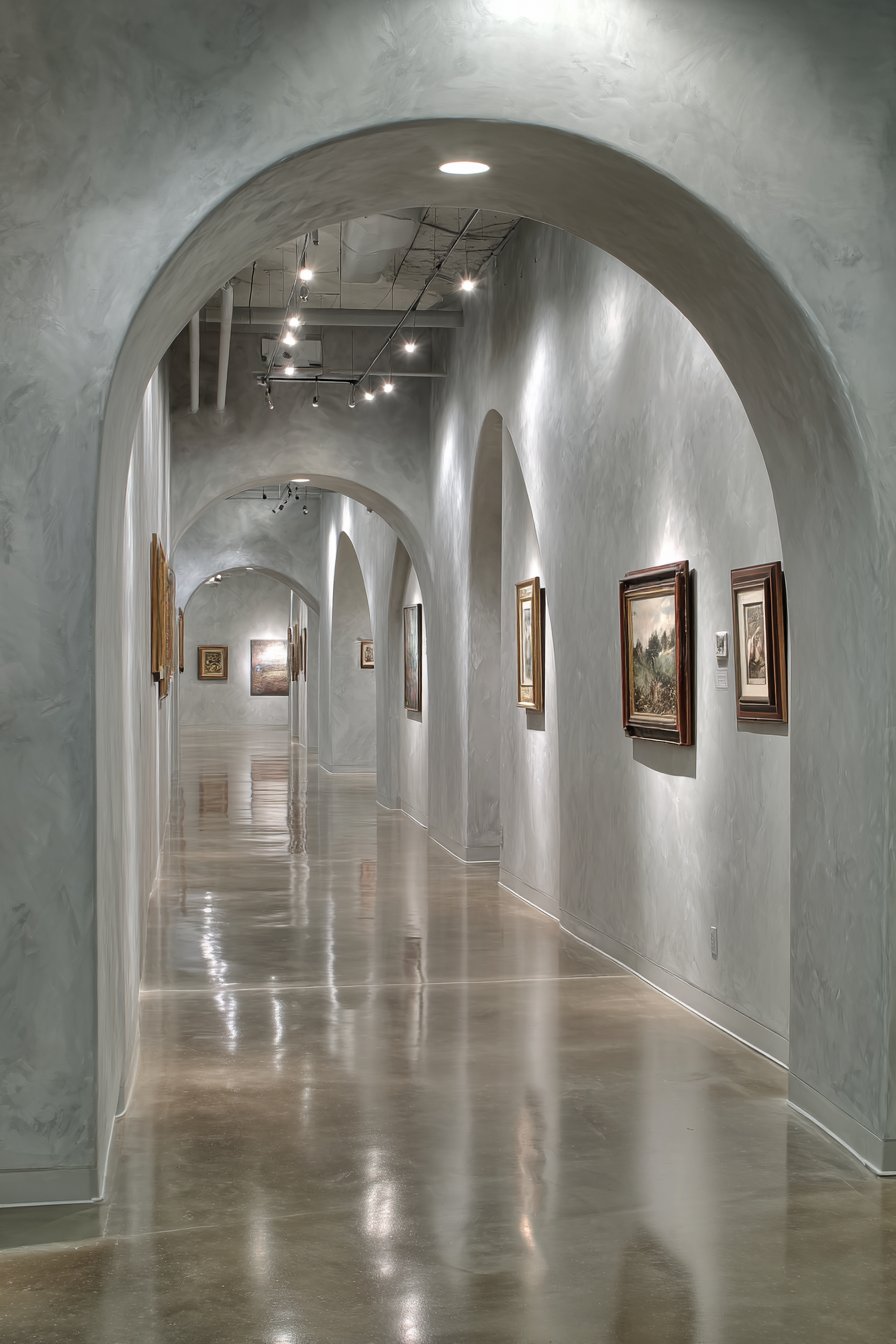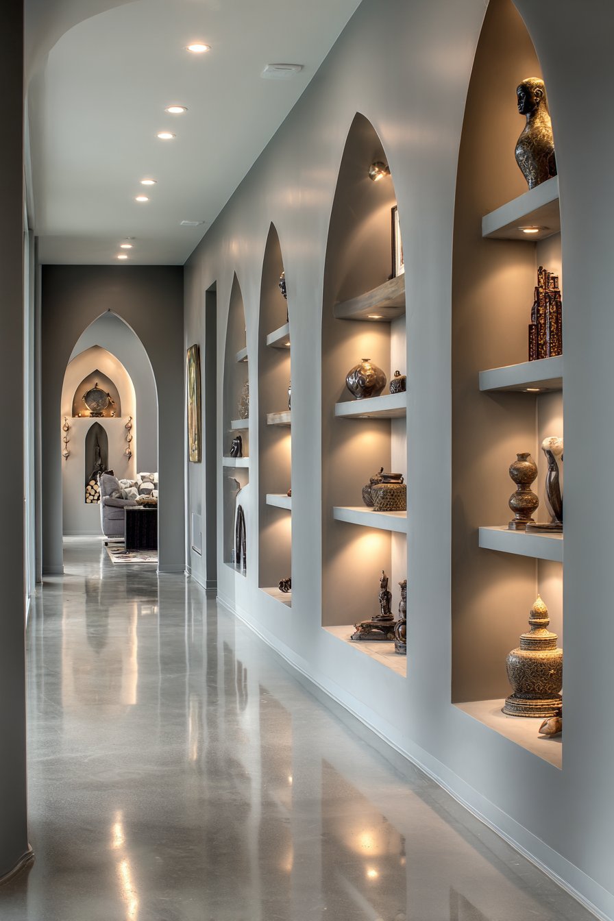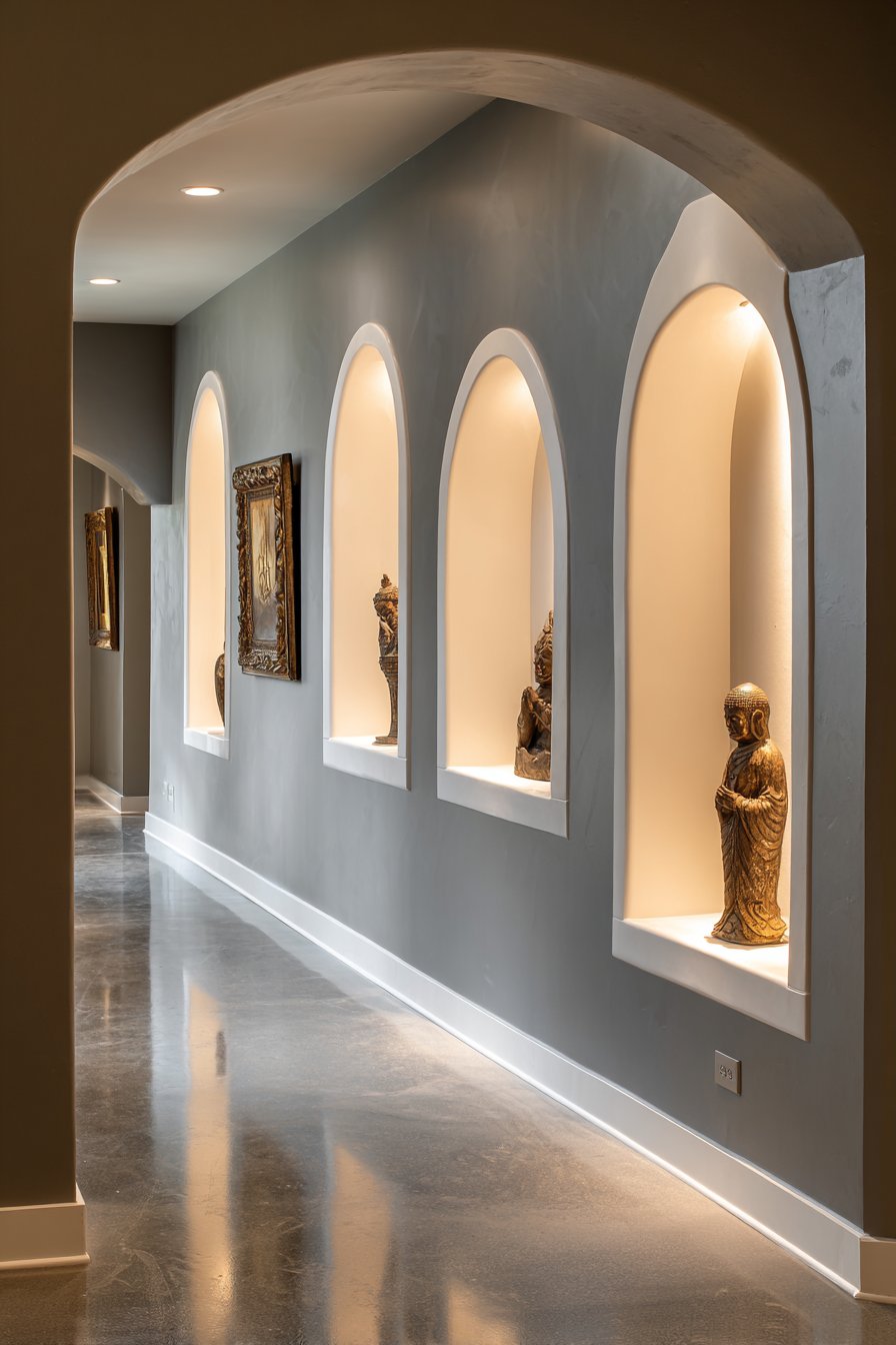 Innovative wall arches decor ideas transform functional display needs into architectural features, as seen in this contemporary hallway gallery featuring a series of shallow arched niches built into the wall for displaying art and sculptures. Each niche features integrated LED lighting and is painted in graduating shades of gray, creating subtle tonal progression along the hallway that adds visual interest while maintaining sophisticated neutrality. The architectural rhythm of repeated arches creates gallery-like presentation, elevating everyday objects into curated displays worthy of attention and contemplation.