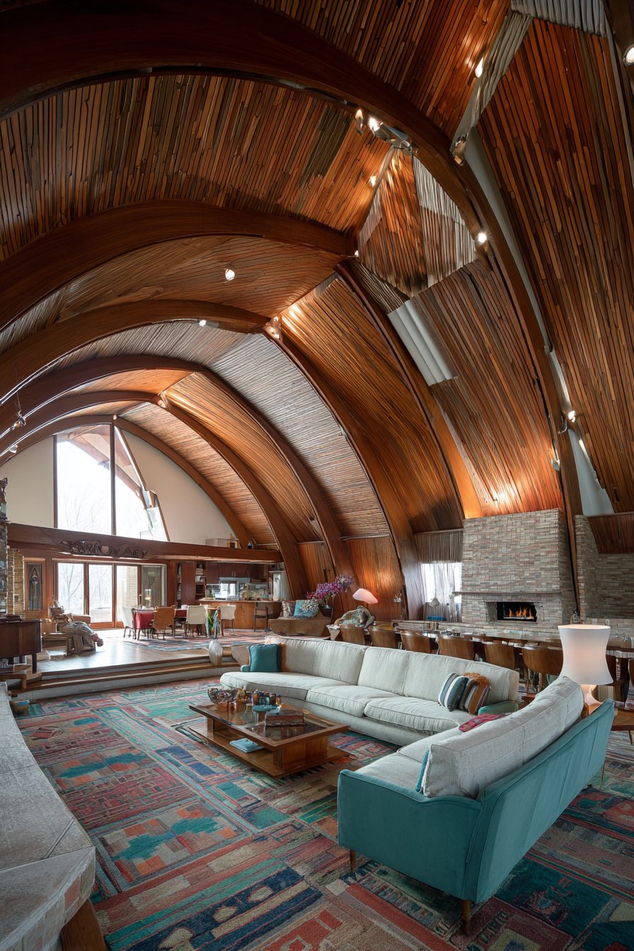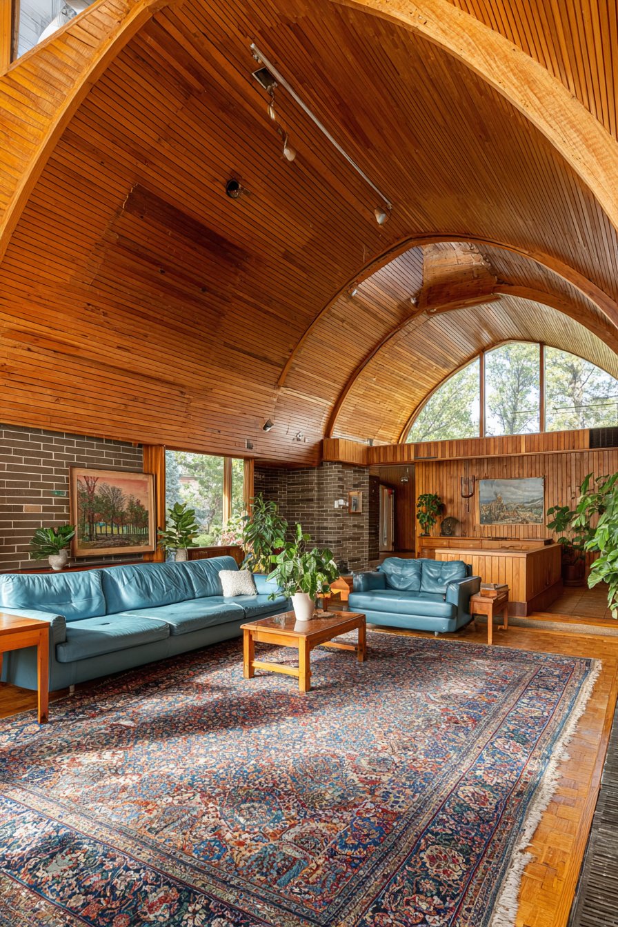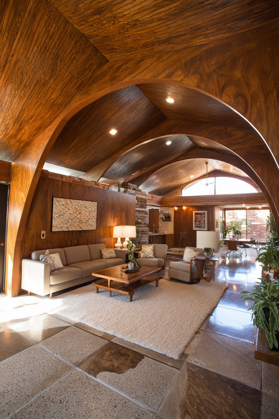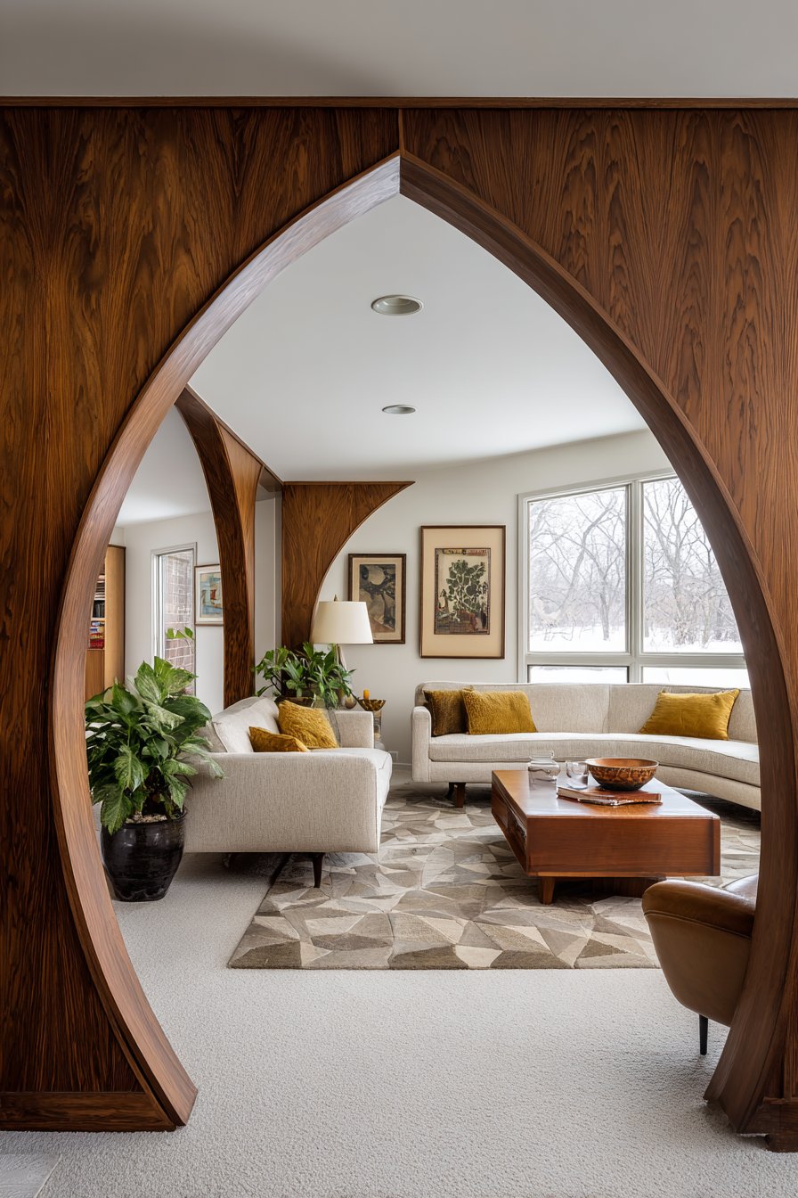 Retro-contemporary wall arches decor ideas celebrate mid-century modern design’s enduring appeal, as demonstrated by this living room featuring a wide elliptical arch opening with warm walnut wood veneer lining the interior curve. The elliptical shape—wider than tall—reflects mid-century modern preference for horizontal orientation and sleek, elongated forms. The walnut veneer, with its rich chocolate tones and distinctive straight grain patterns, provides organic warmth and references mid-century’s love of natural wood as both structural and decorative material. The careful book-matching of veneer pieces creates mirror-image grain patterns that emphasize the craftsmanship.