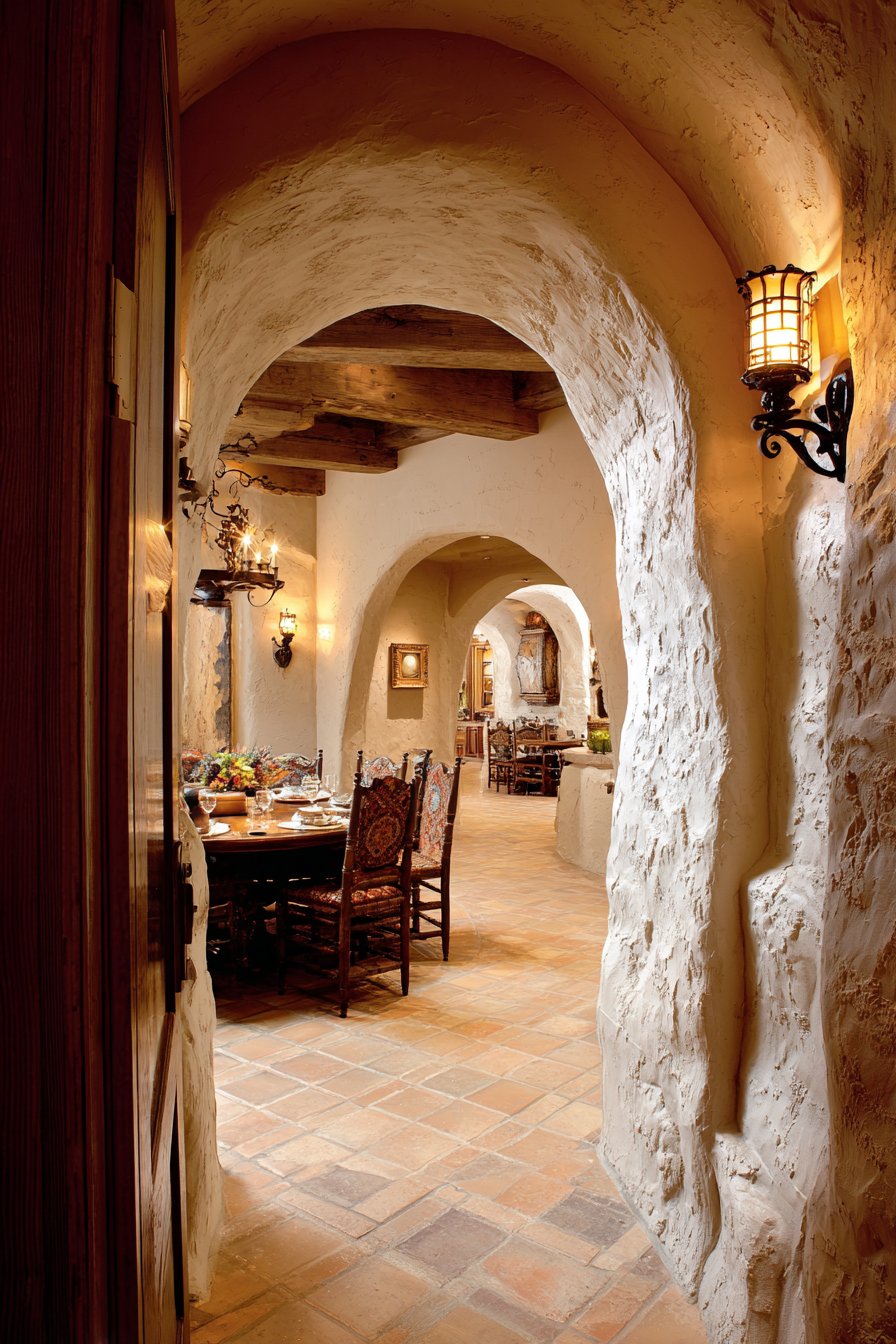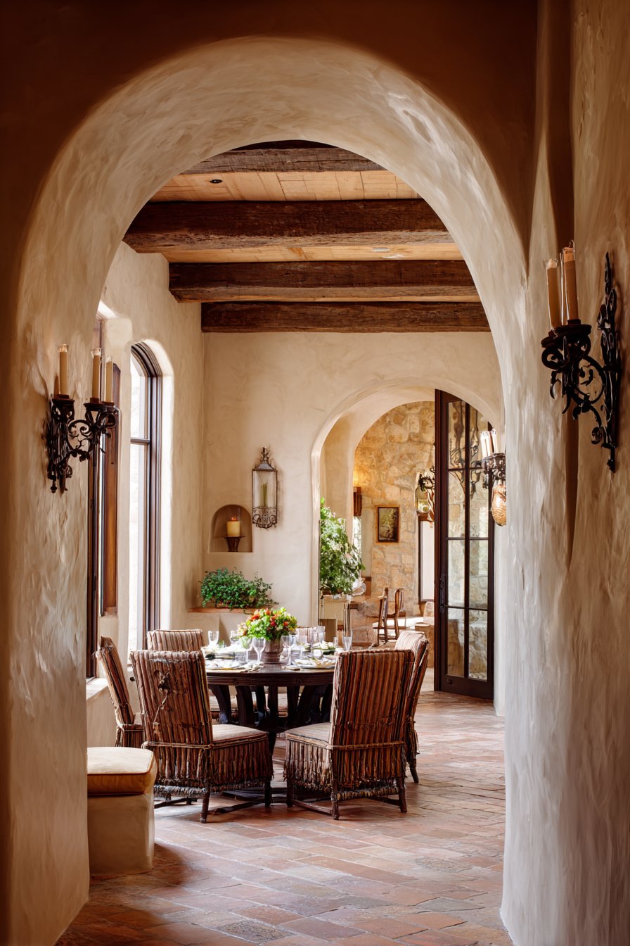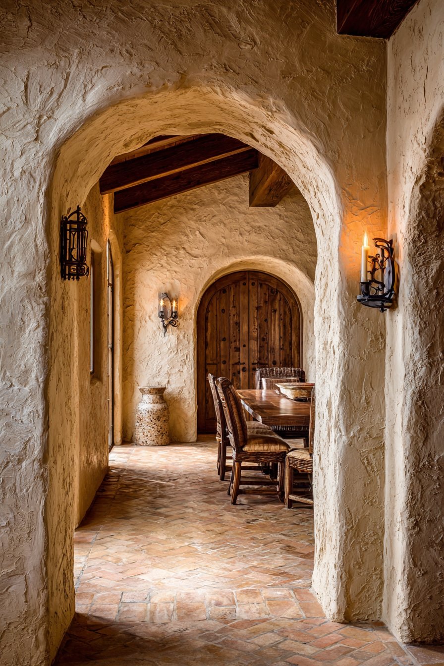 The archway frames the dining area beyond, where a substantial wooden table surrounded by ladder-back chairs awaits gatherings of family and friends. Terra cotta floor tiles in varying shades of russet and ochre complement the arch’s warm palette, while exposed wooden beam ceilings add another layer of rustic Mediterranean charm. Wrought iron wall sconces flank the arch at shoulder height, their scrolled metalwork casting intricate shadows against the textured plaster when lit. These fixtures provide warm ambient light during evening meals, creating an intimate atmosphere perfect for lingering conversations over wine and good food.