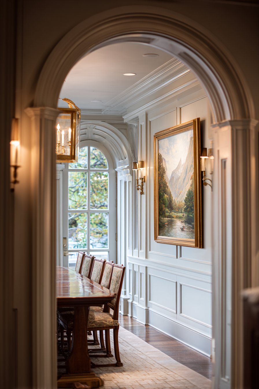 The dining room beyond features classic furniture with updated proportions and fabrics—perhaps a traditional pedestal table with contemporary upholstered chairs, or a modern glass table with classic wingback chairs. This mixing of styles defines transitional design and pairs perfectly with the faux arch treatment that similarly bridges architectural styles. Natural light from a chandelier and windows highlights the dimensional paint technique and subtle molding details. The overall effect proves that significant design impact can be achieved through clever paint and trim rather than expensive construction.