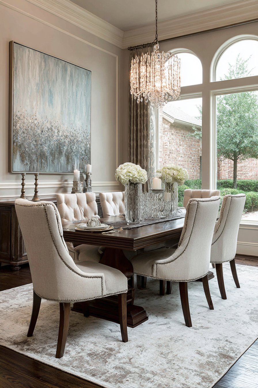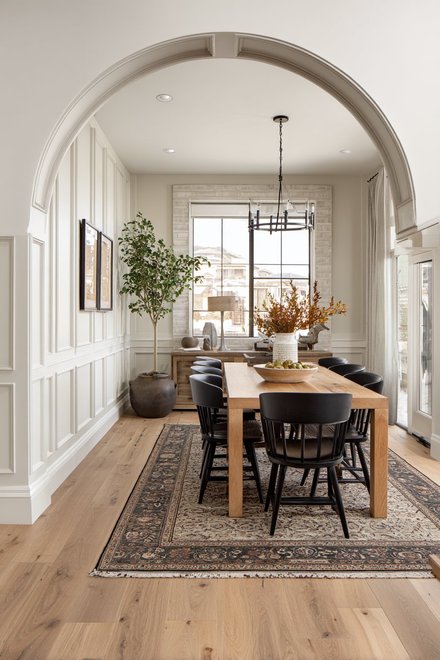 Accessible wall arches decor ideas prove that dramatic architectural impact doesn’t require major construction, as demonstrated by this transitional dining room featuring an elegant arched wall panel treatment creating a faux archway effect painted in soft greige. This technique uses paint, carefully applied trim work, and perhaps wallpaper or textured paint to create the visual effect of a structural arch without the expense and disruption of actual construction. The painted arch adds architectural interest and sophisticated detail while remaining entirely reversible—perfect for renters or those hesitant about permanent modifications.