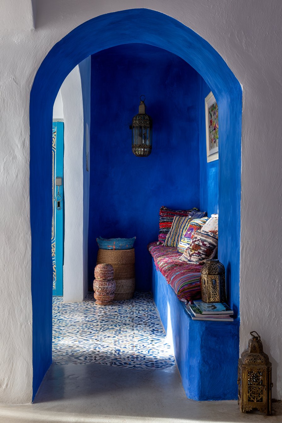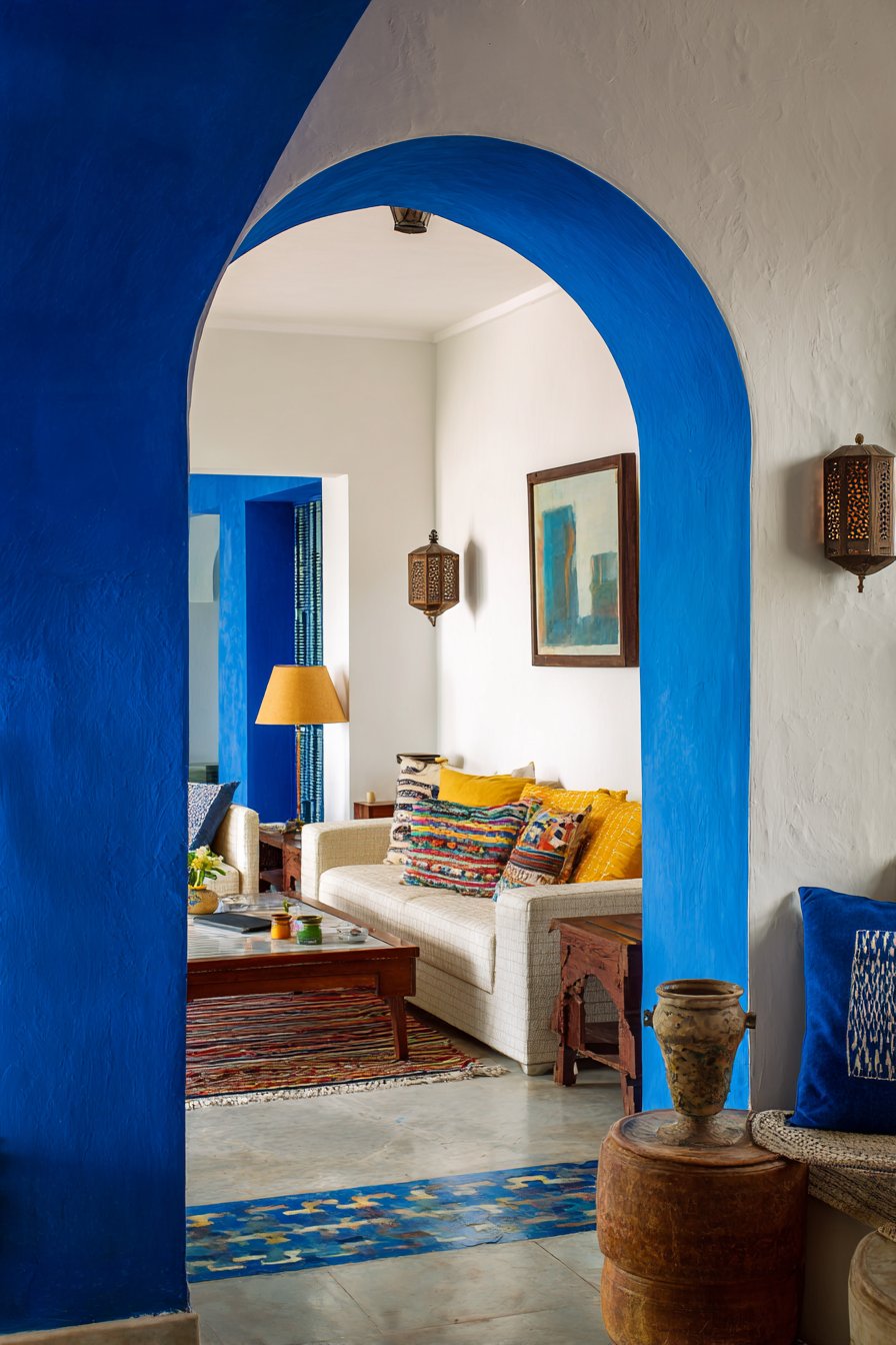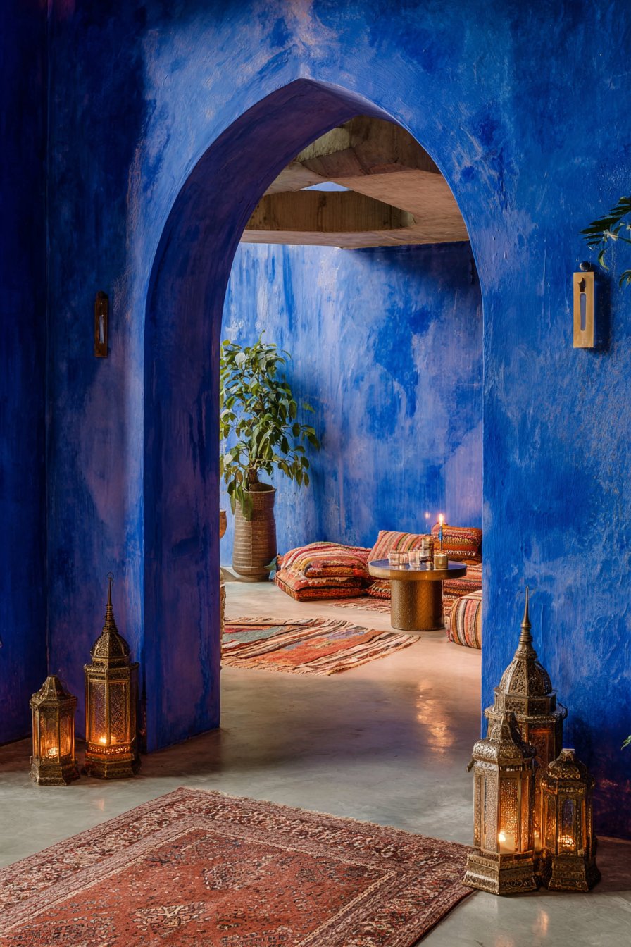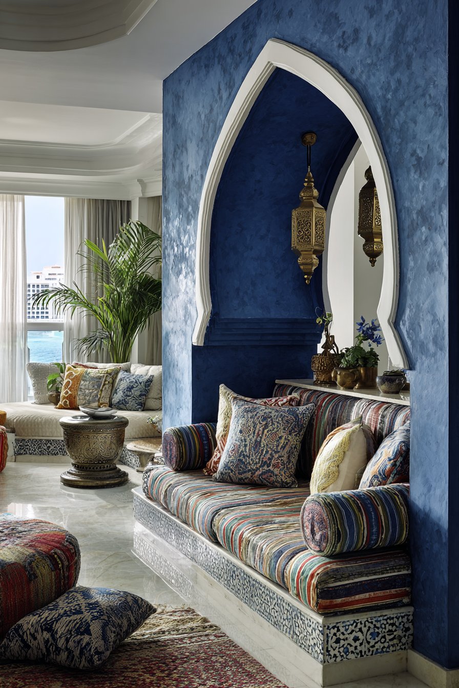 Dramatic globally-inspired wall arches decor ideas celebrate cultural diversity and bold color, as exemplified by this living space featuring a vibrant keyhole-shaped arch inspired by Moroccan architecture painted in deep cobalt blue. The keyhole or “Moorish” arch shape features a rounded upper section that tapers to a point at the bottom, creating that distinctive profile associated with Islamic architecture throughout North Africa and the Middle East. The deep cobalt blue creates stunning visual impact, introducing saturated color that becomes the room’s defining feature and establishes a bold, confident design direction.
