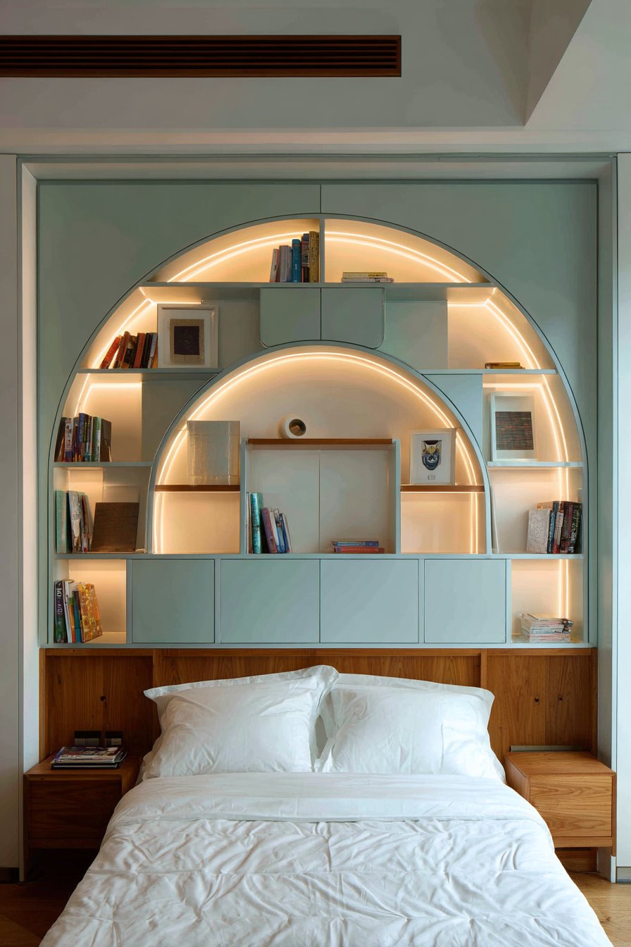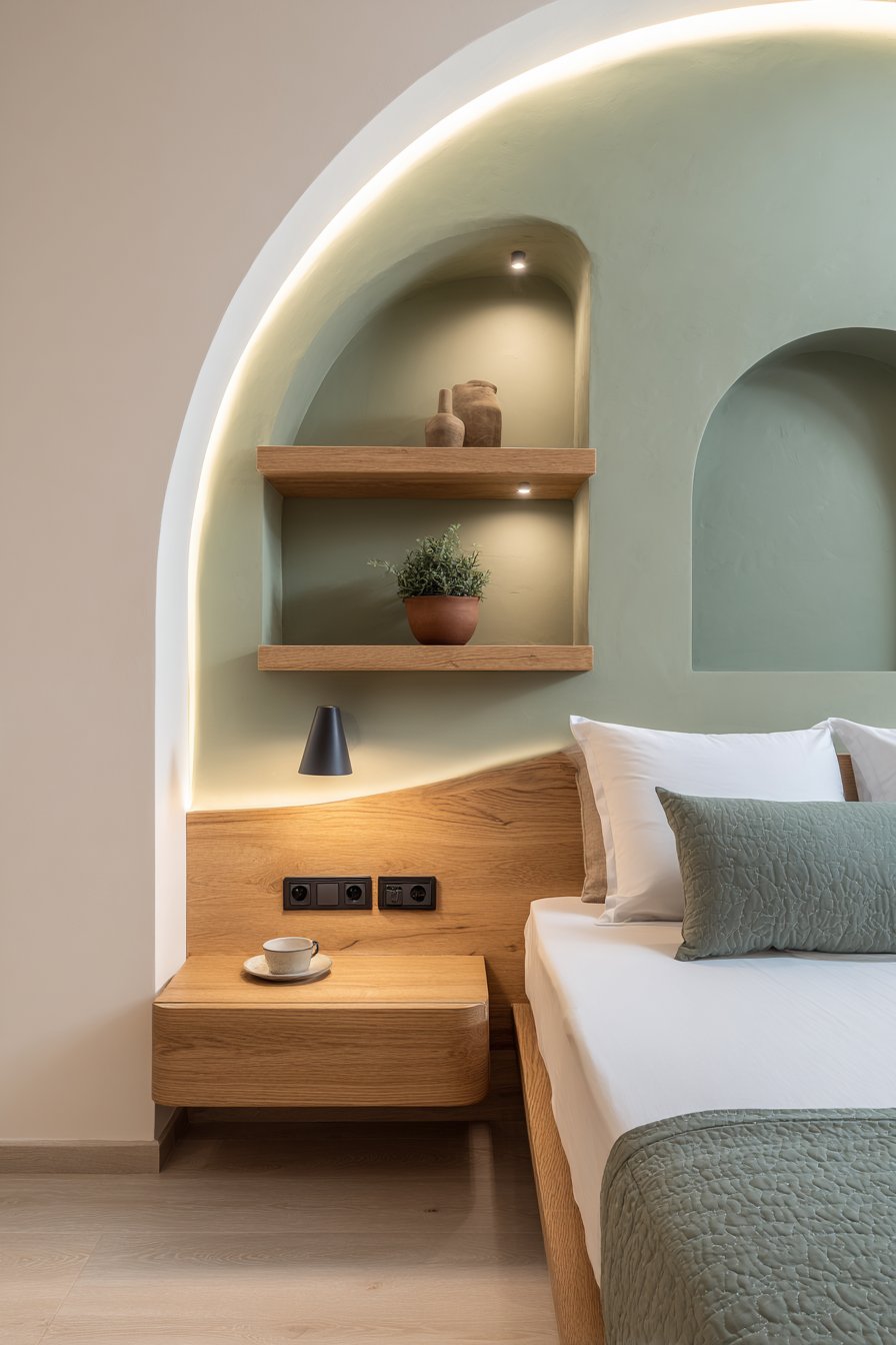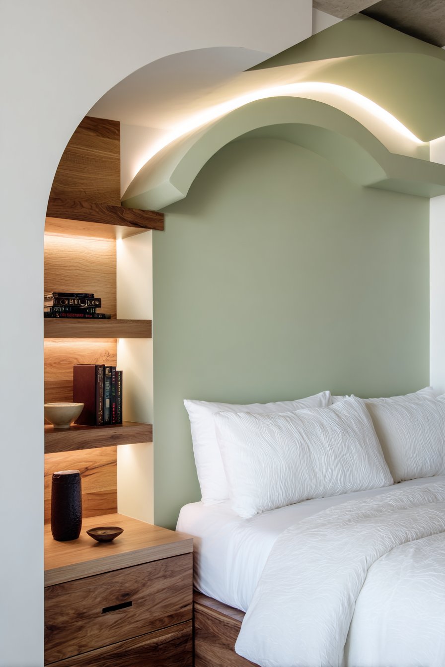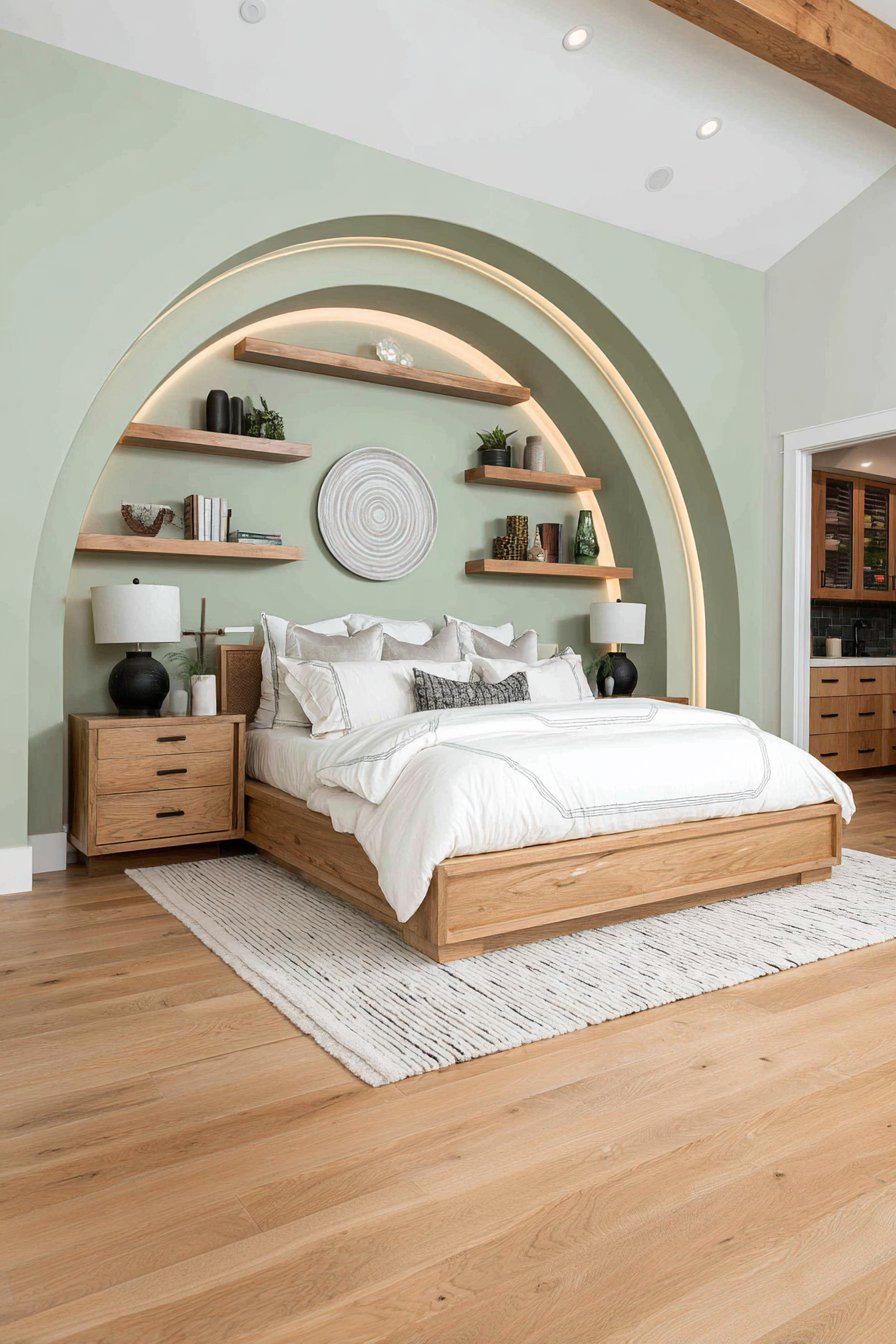 Innovative wall arches decor ideas extend beyond doorways and passages into creative applications like this contemporary bedroom design featuring a decorative half-arch niche built into the wall above the bed. This architectural element serves as a sophisticated alternative to traditional headboards, providing both visual interest and functional display space. The arch is painted in soft sage green, a color that promotes relaxation and connects the interior to nature, making it ideal for a bedroom sanctuary. The curved form creates a gentle, embracing quality that draws the eye upward and makes the ceiling feel higher than it actually is.