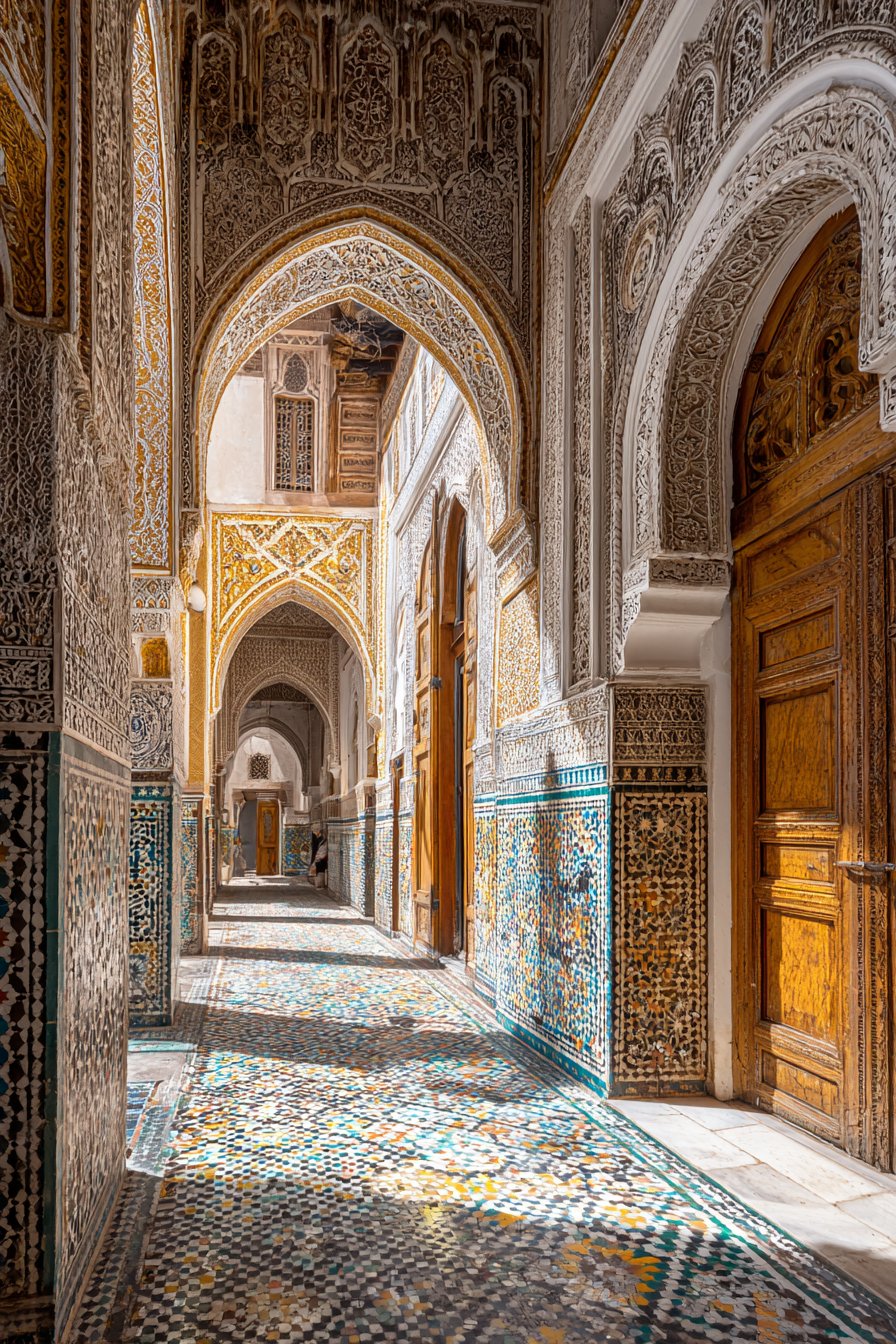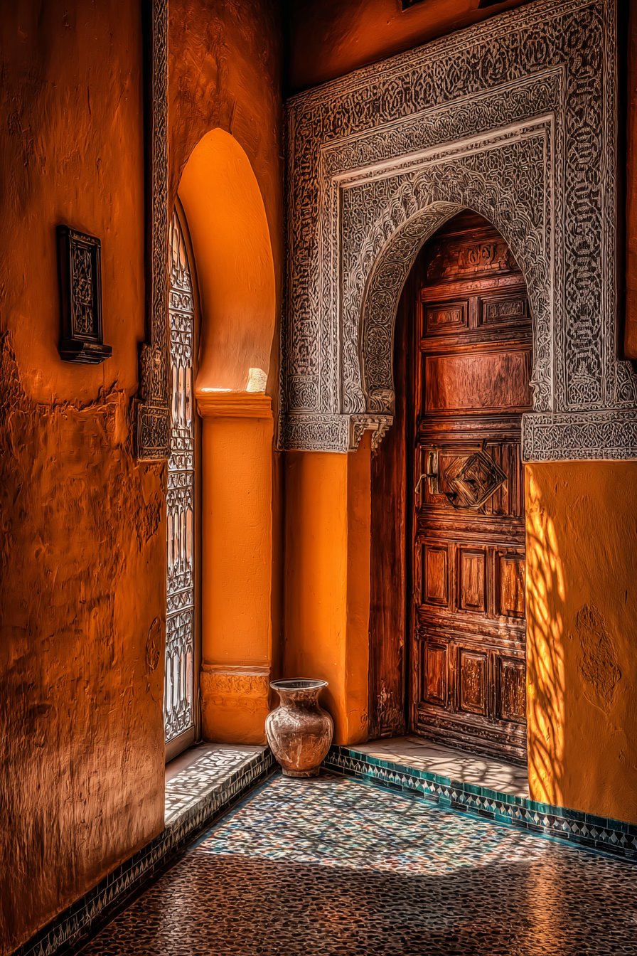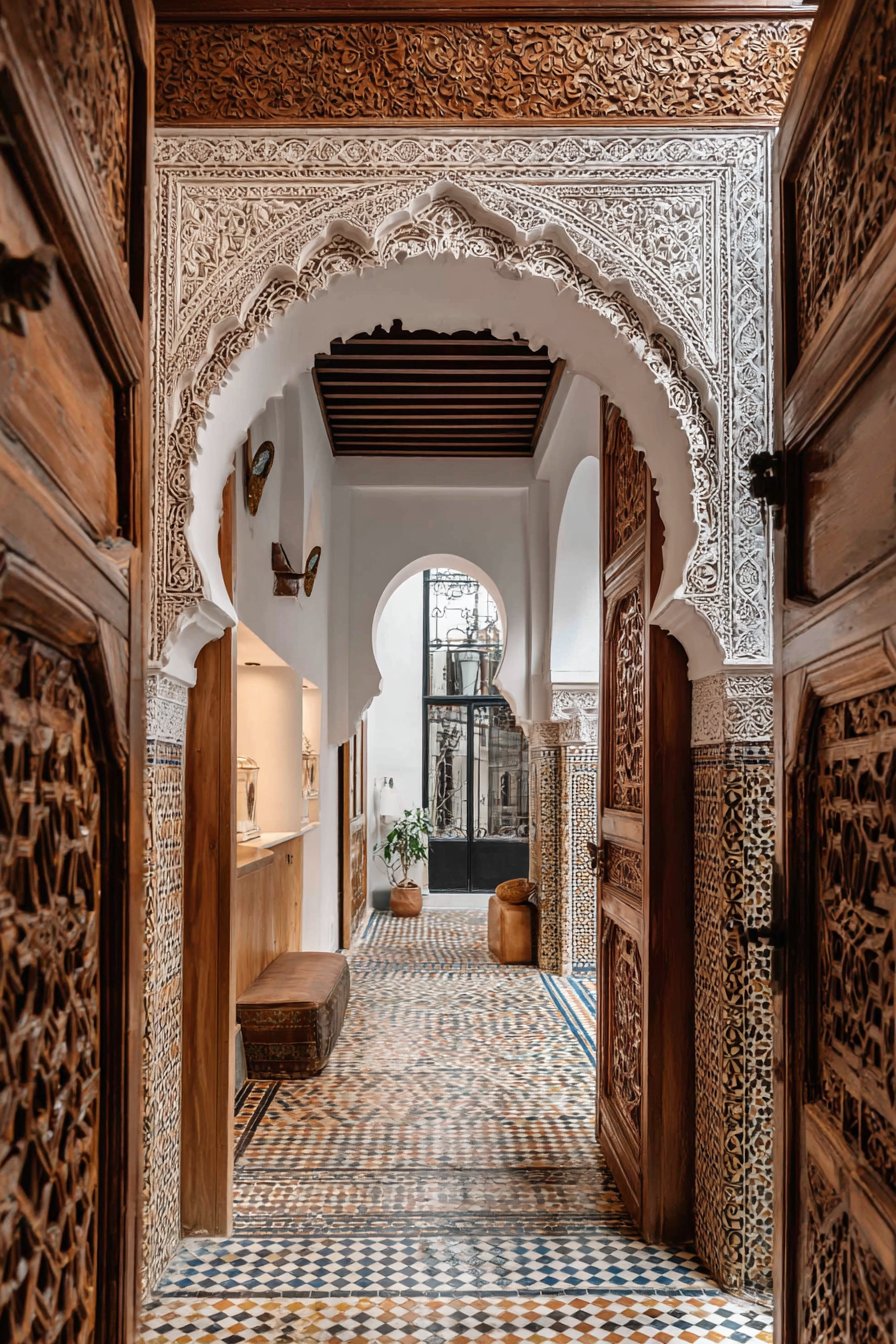 The carved plasterwork demonstrates incredible craftsmanship, with repeating geometric motifs, star patterns, and stylized floral elements layered in dimensional relief. These details cast fascinating shadows that change throughout the day as sunlight moves, meaning the arch never looks quite the same twice. The level of ornamentation might seem overwhelming in larger doses, but concentrated in an entryway, it creates a stunning first impression without overwhelming the entire home. A vintage wooden door with brass hardware and decorative nail heads completes the authentic Moroccan aesthetic, while colorful mosaic tile flooring in blues, greens, and terracottas adds another layer of pattern and color.