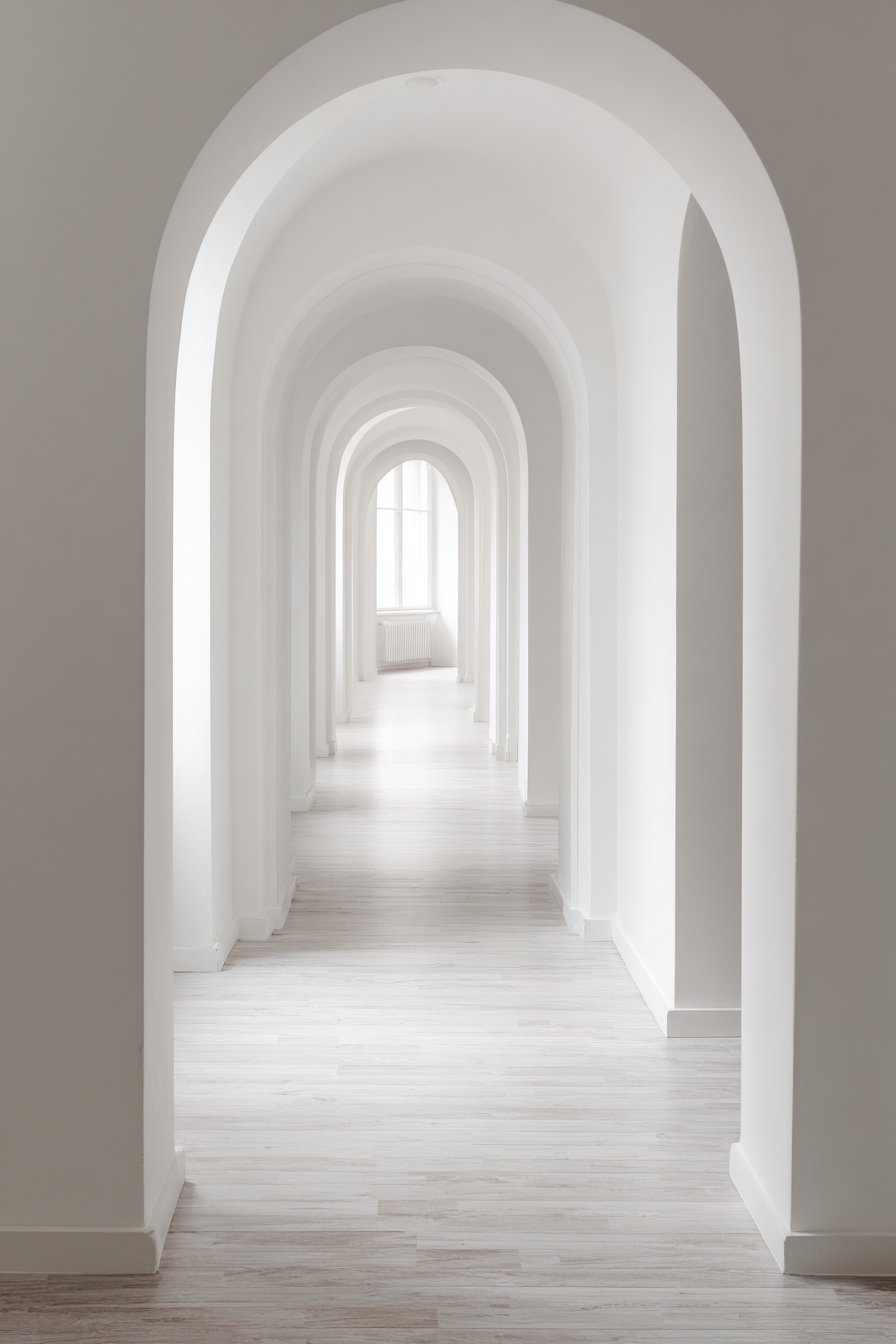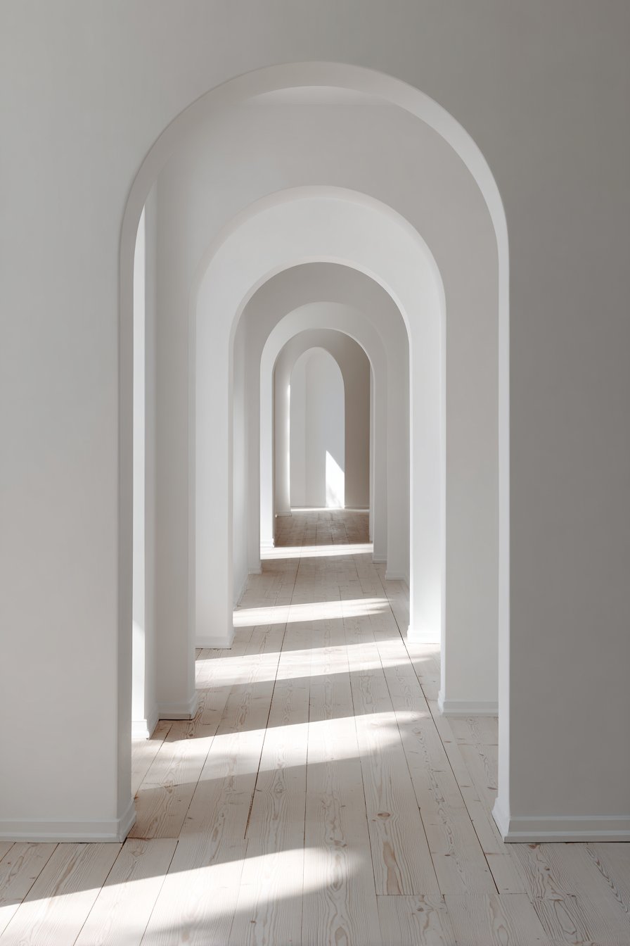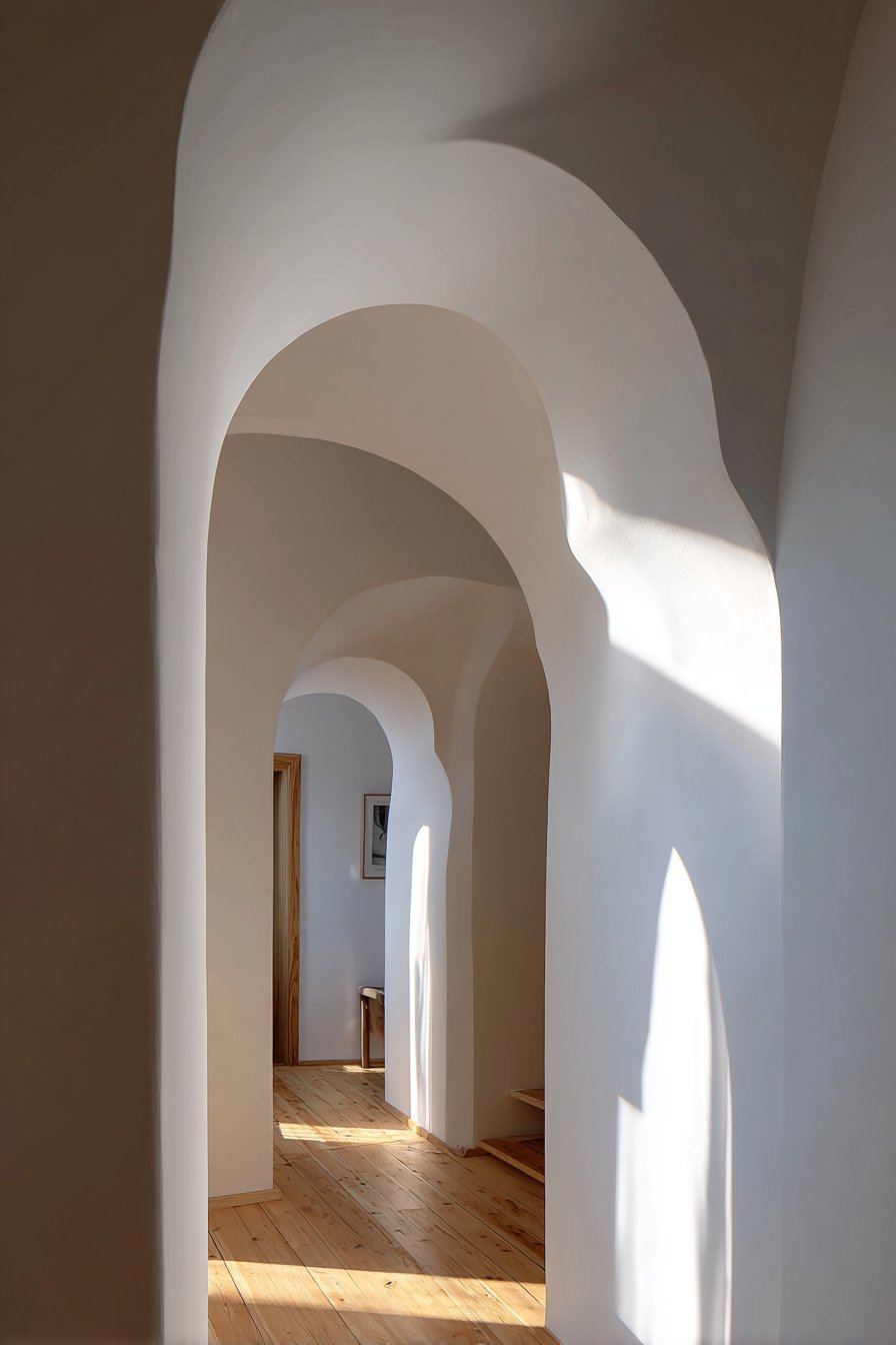 Scandinavian-inspired wall arches decor ideas celebrate simplicity, light, and the beauty of repetition, as demonstrated in this hallway featuring a series of rounded white arches creating rhythmic progression through the space. Each arch frames the view to the next area, building anticipation and creating a sense of journey even within the confines of a home. The arches feature clean minimalist lines with smooth plaster finish, their pure white color maximizing light reflection and creating an airy, spacious feeling even in what might otherwise be a narrow corridor. The gentle curves soften what could be a stark, utilitarian space, adding warmth and visual interest without clutter.